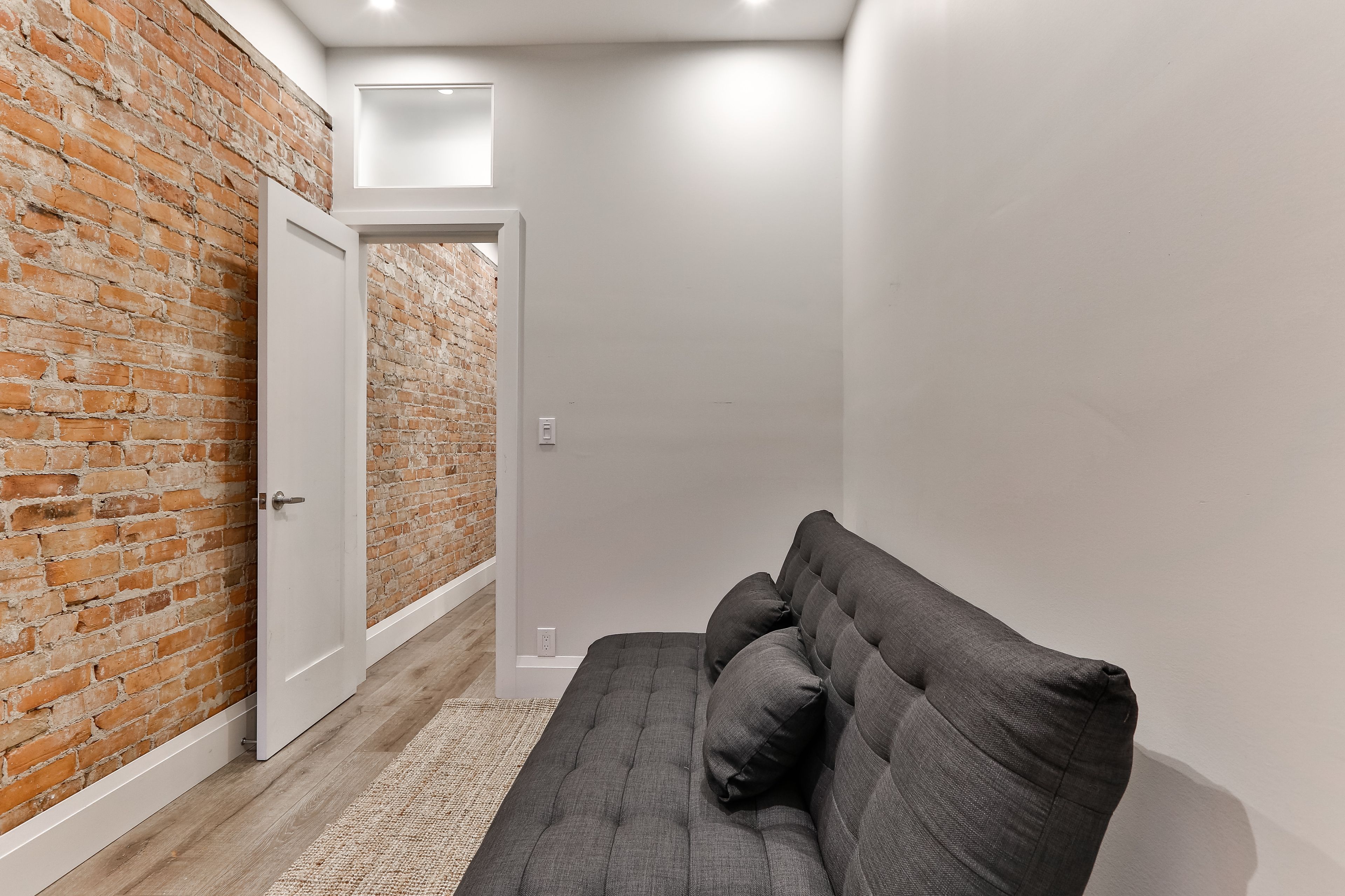 • Open-concept kitchen featuring stylish quartz counters and exposed brick.