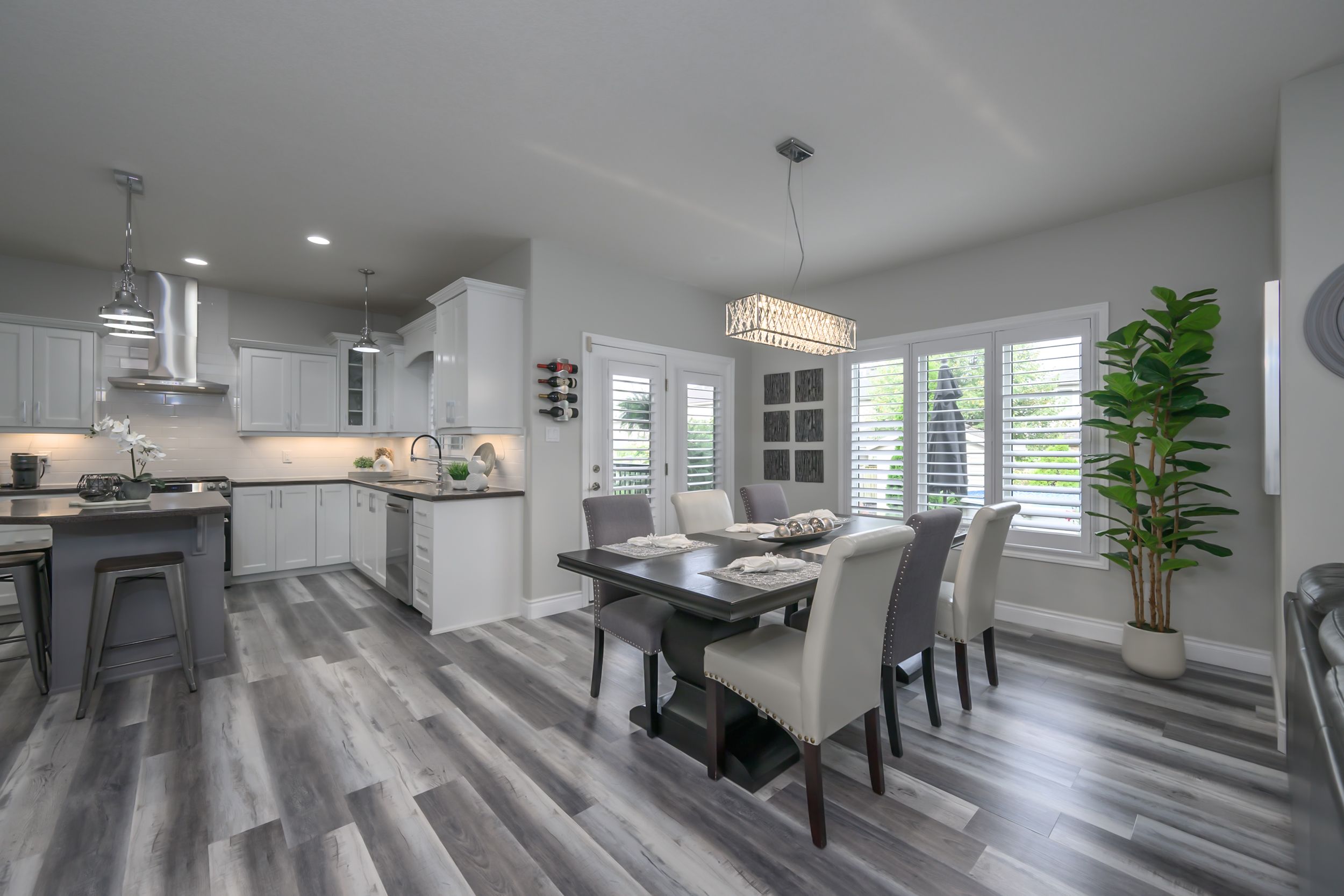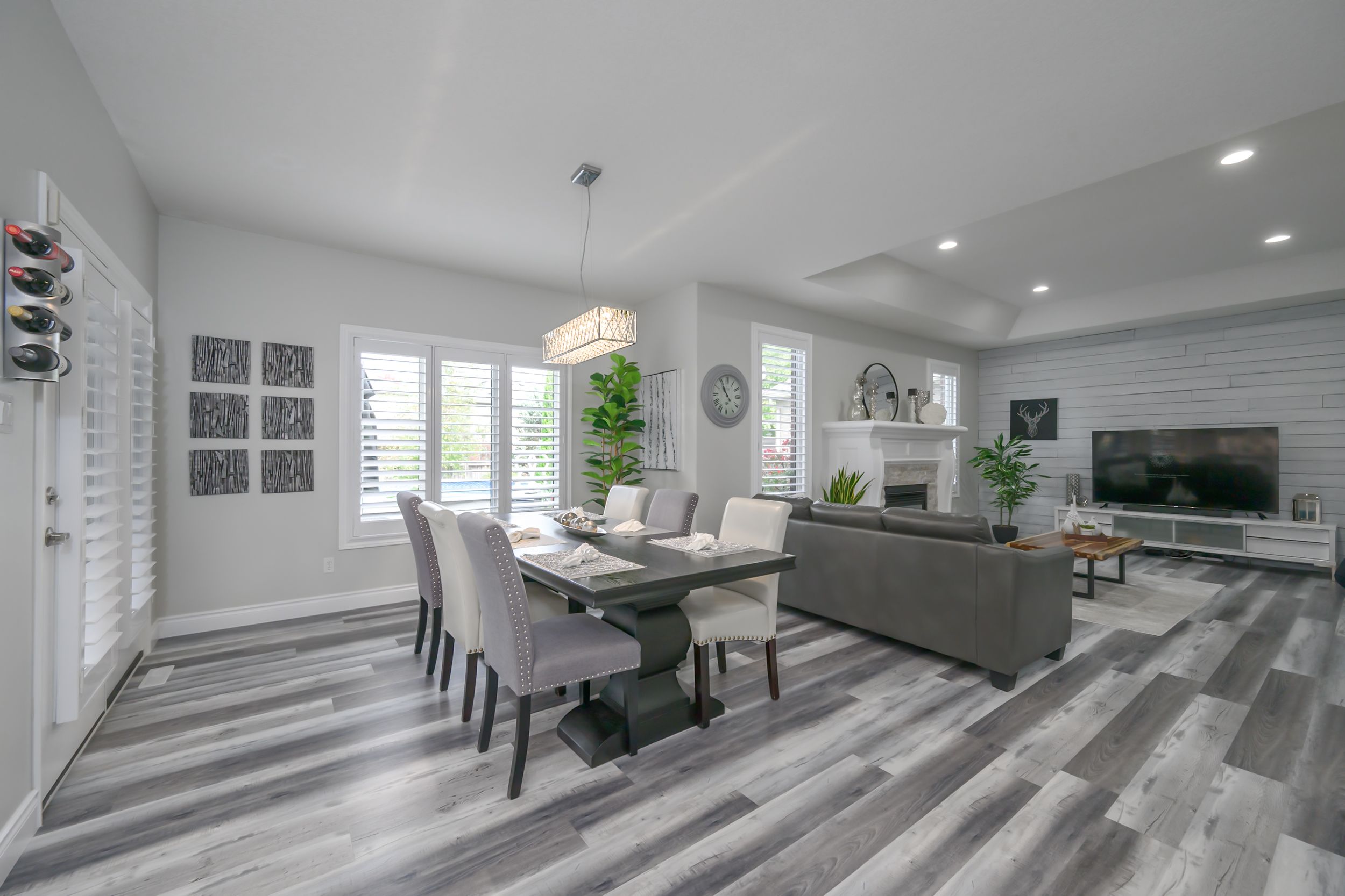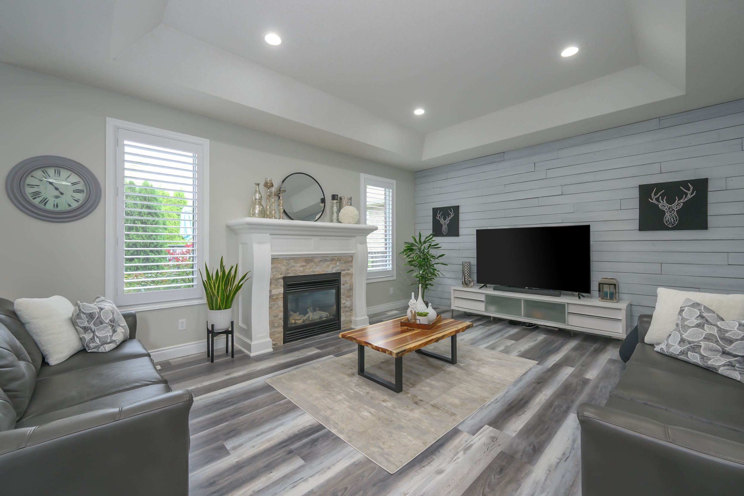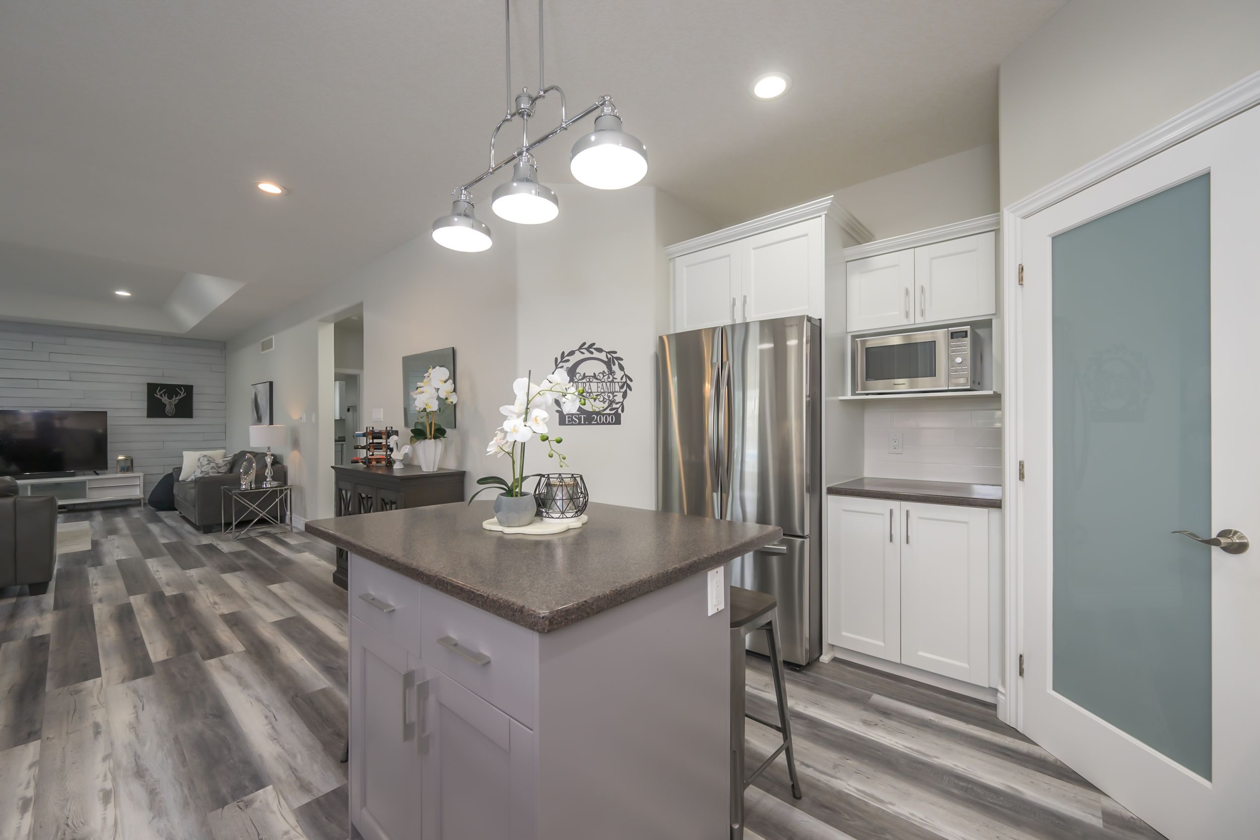 • Spacious living area with a modern kitchen and quartz countertops.