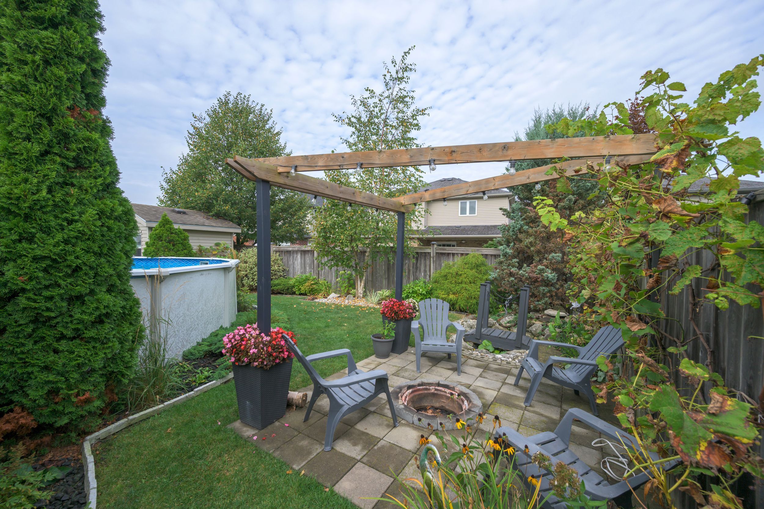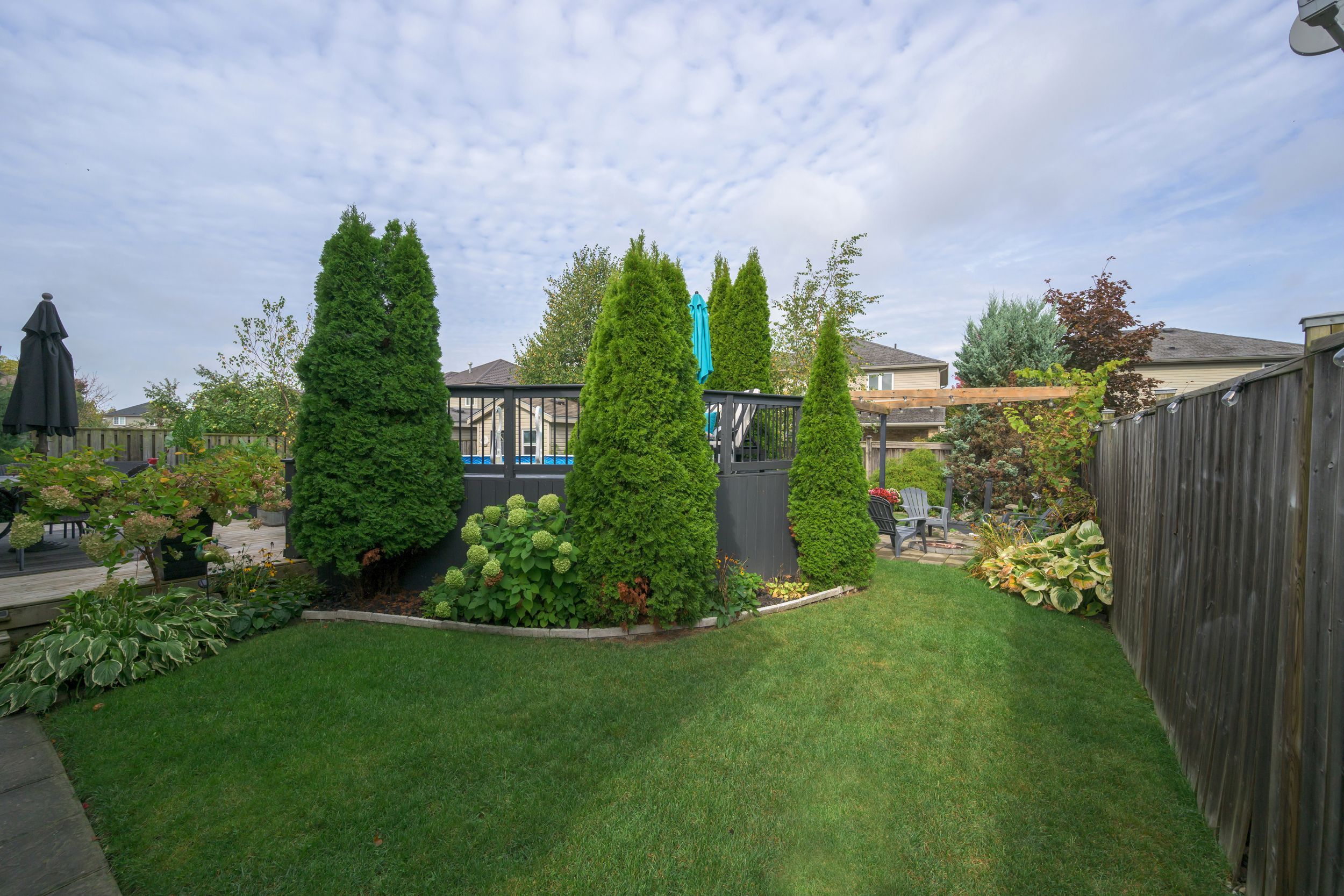 • Beautiful backyard with deck, koi pond, and pool area.