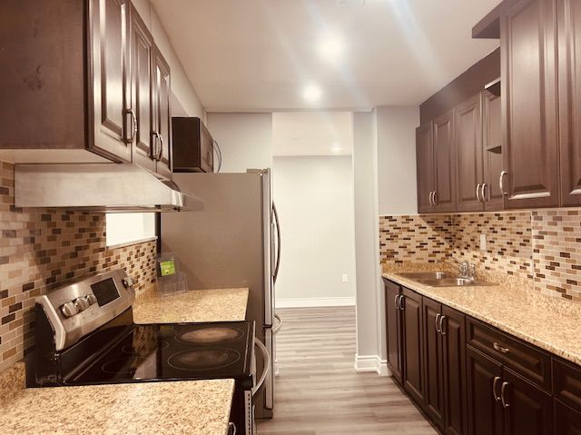 • Kitchen includes stainless steel appliances and stylish quartz countertops.