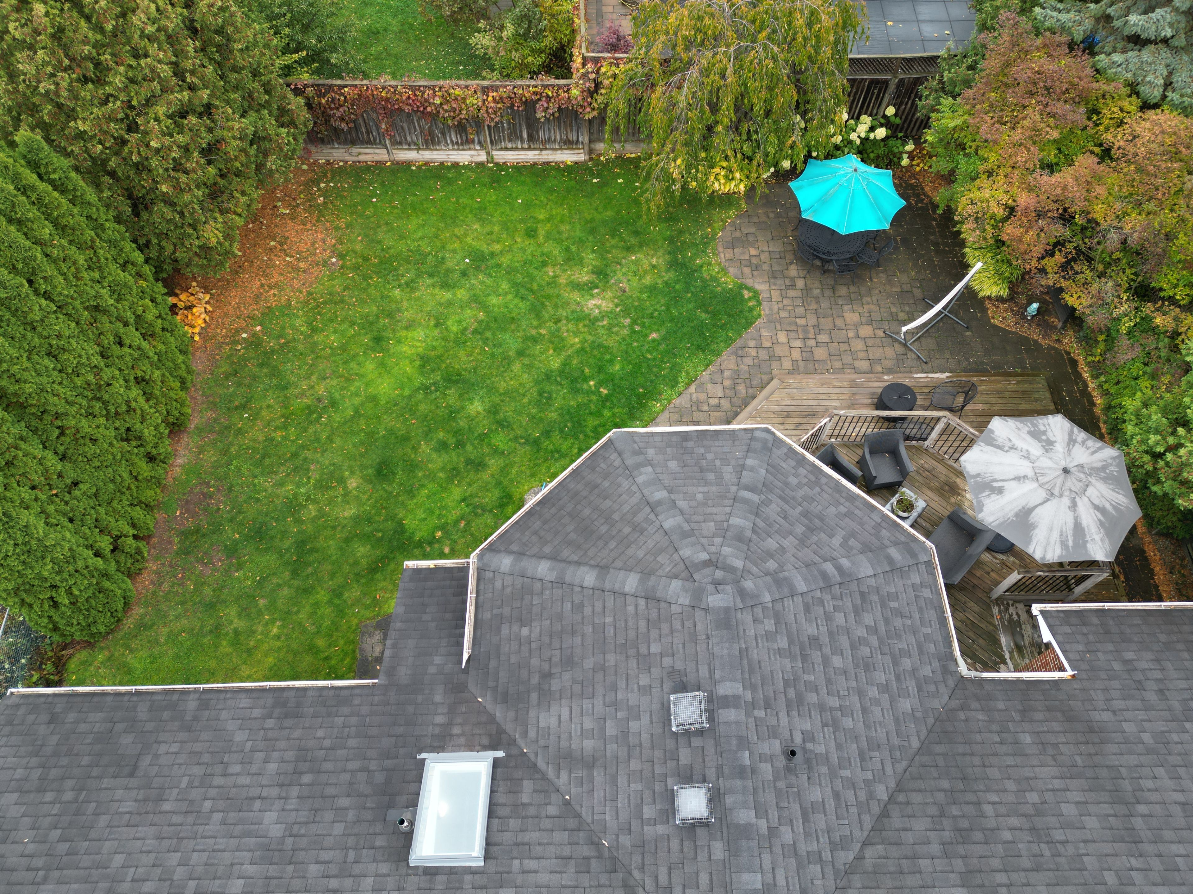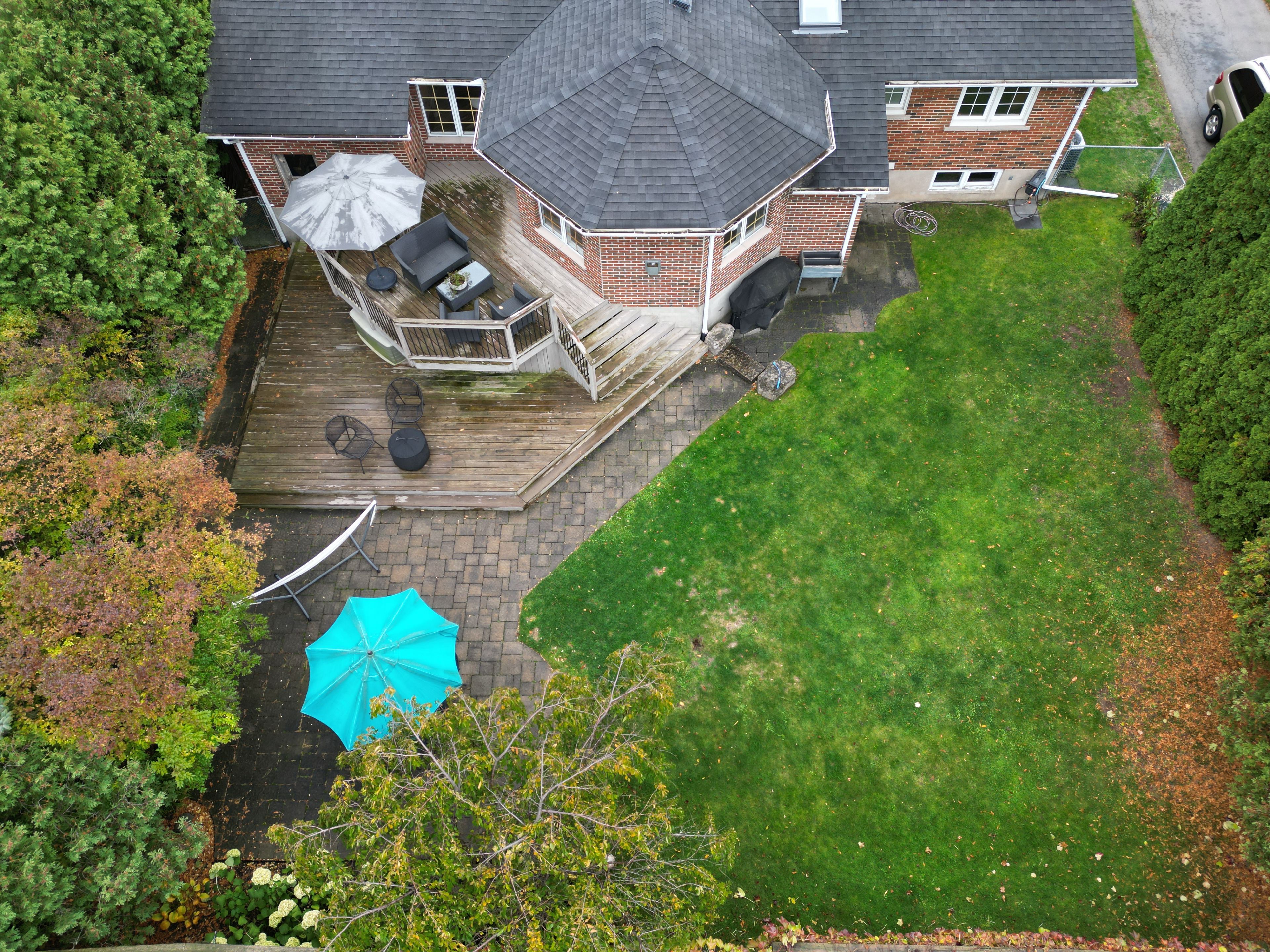 • Private backyard oasis features a deck, stone patio, and ample green space.