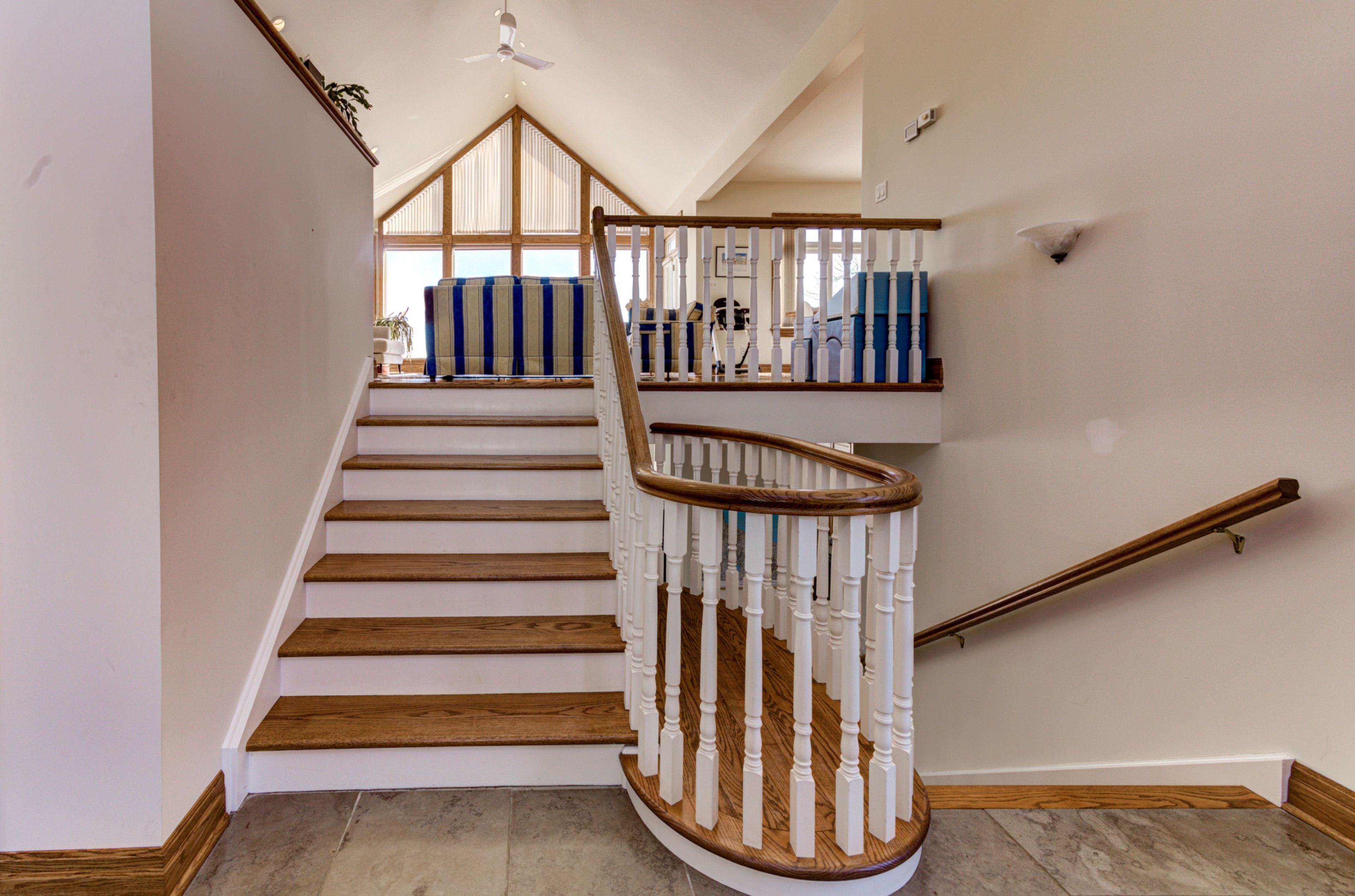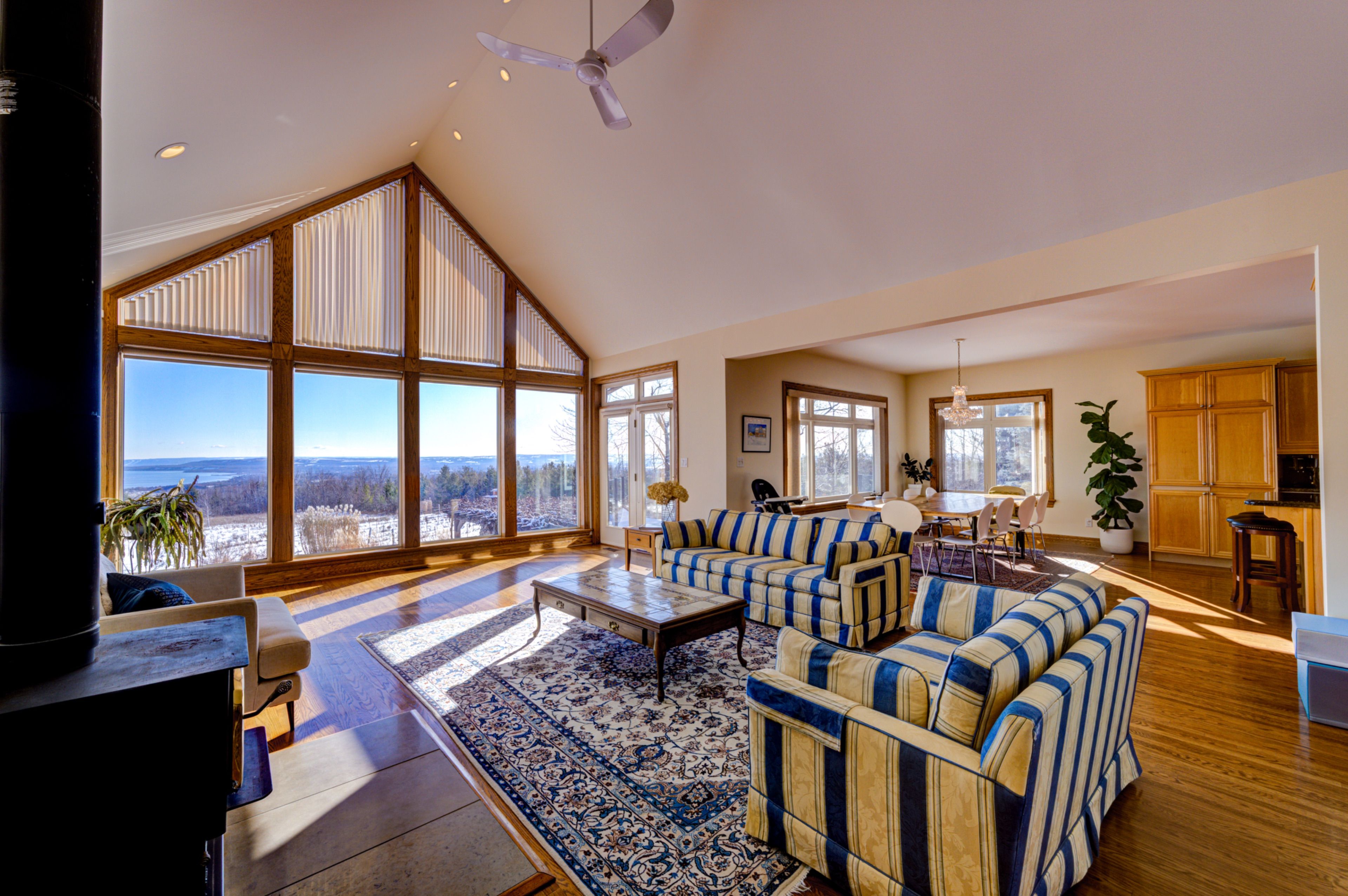• Panoramic windows and vaulted ceilings enhance the spacious living area's beauty.