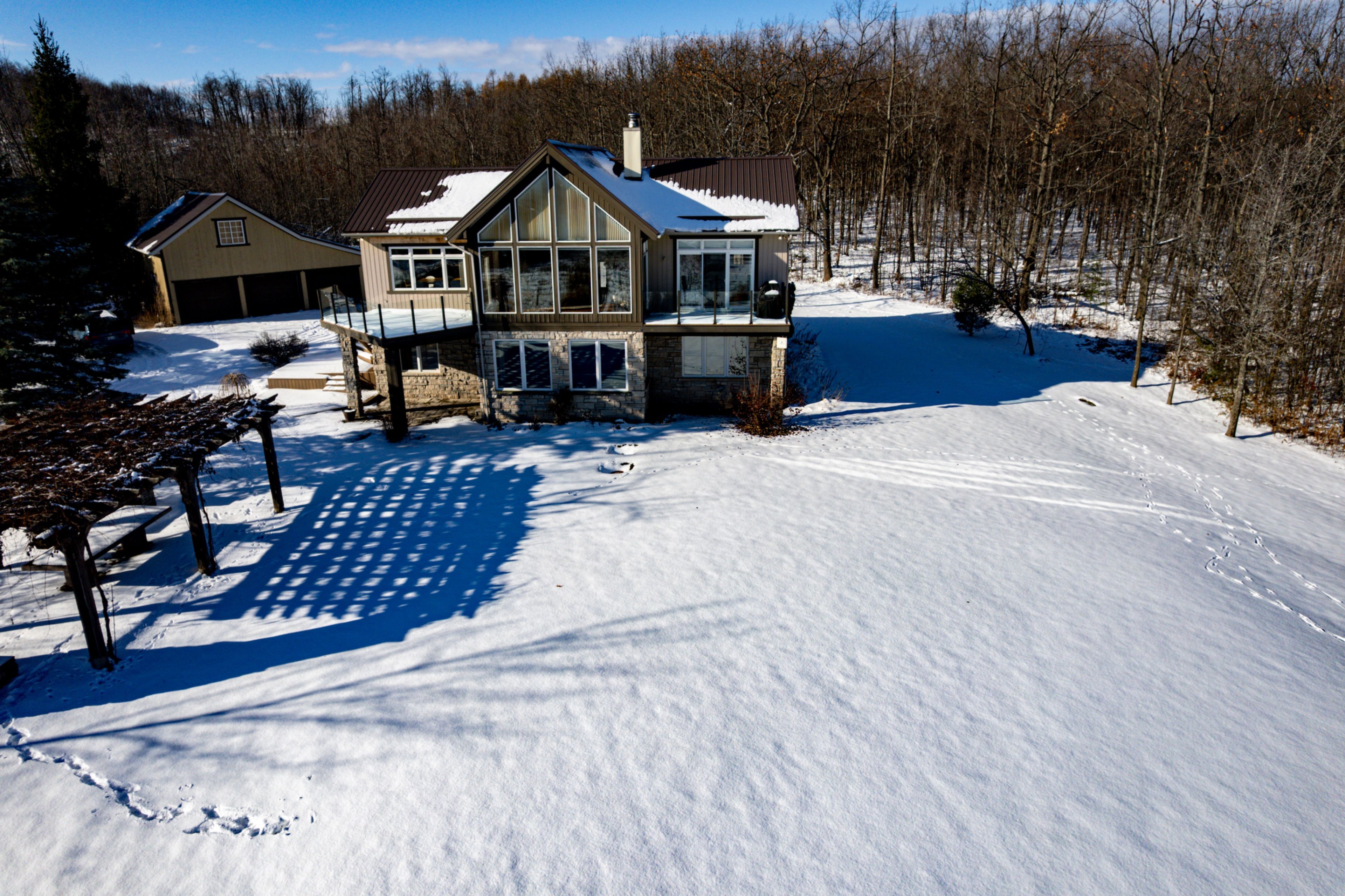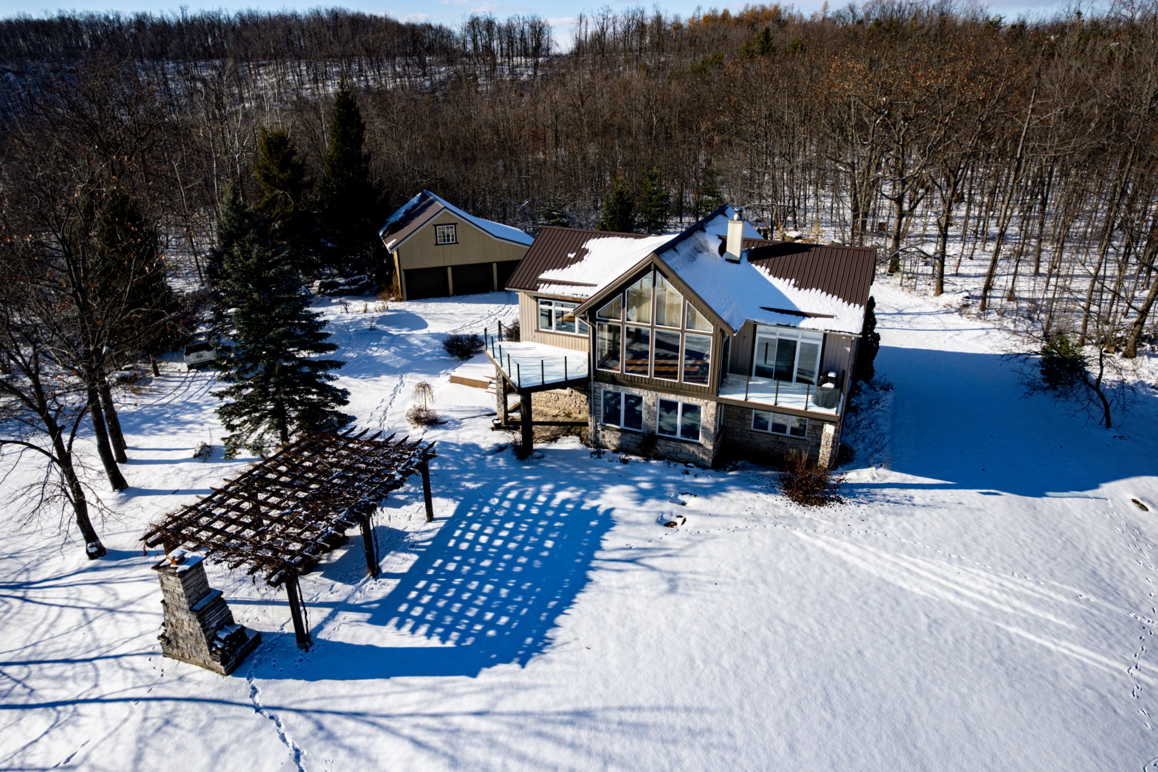 A must-see 4-bedroom retreat with sweeping georgian bay and escarpment views on 18 acres of private forest, vineyard and rolling landscape. Available for annual or short-term lease. Fully furnished and crafted for relaxation, this home offers a spa-like escape with a sauna, cold plunge and dedicated training room. Spend winter days exploring the property's peaceful open spaces, snowshoeing through the forest, or strolling the quiet grounds - then return to cozy up by the fire, unwind with family, or entertain friends while taking in the expansive views. Panoramic windows and vaulted ceilings frame the scenery from the living room, while the bright walkout level opens to outdoor areas perfect for gathering. Enjoy nearby quiet beaches, scenic cycling roads, and quick access to top ski hills-all while living in complete privacy. A rare offering for tenants seeking serenity, space and an elevated four-season lifestyle.