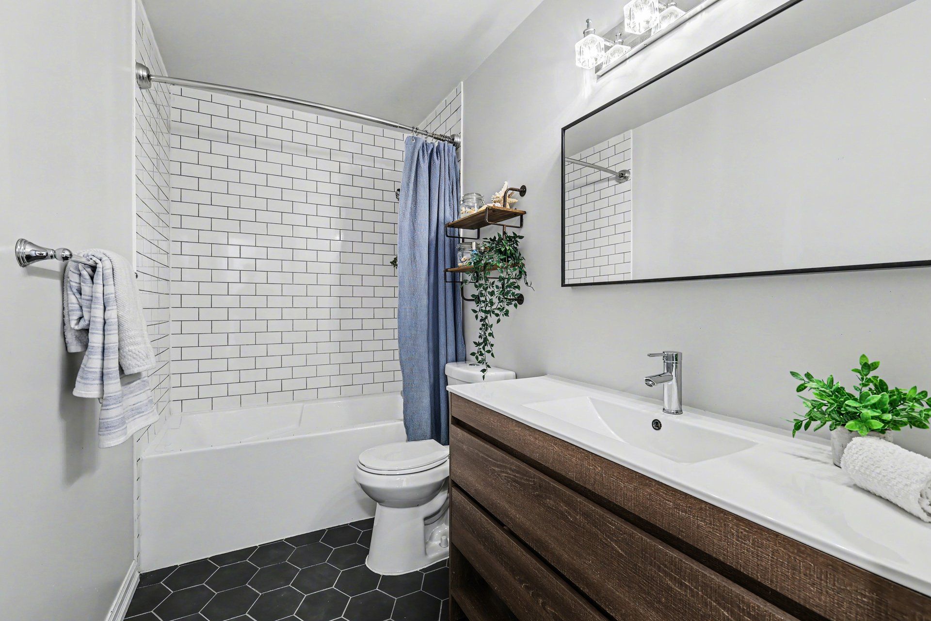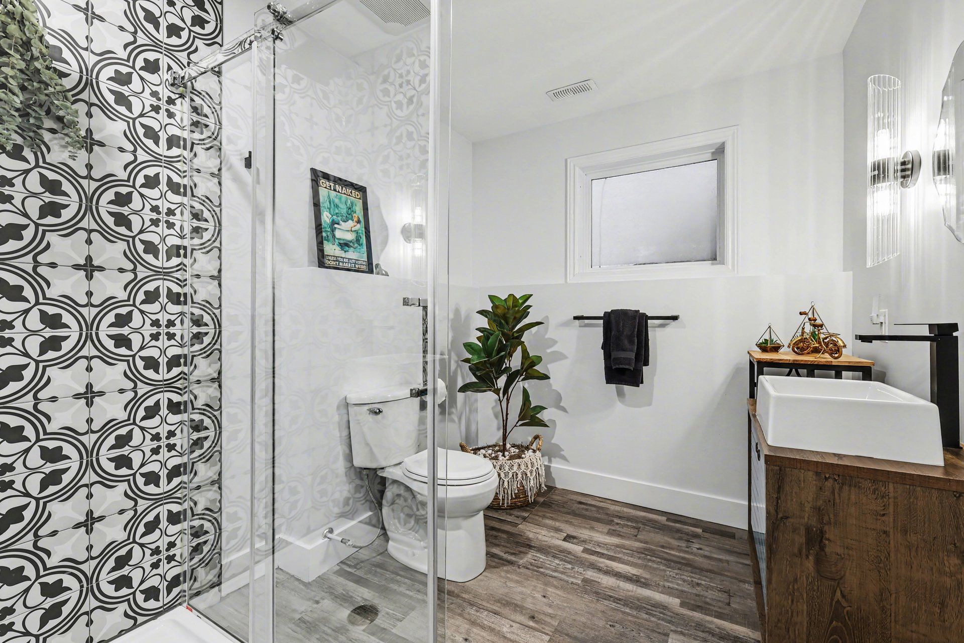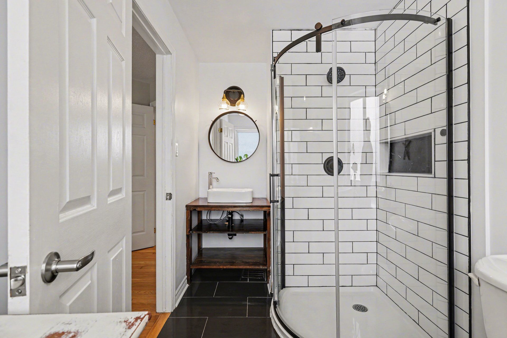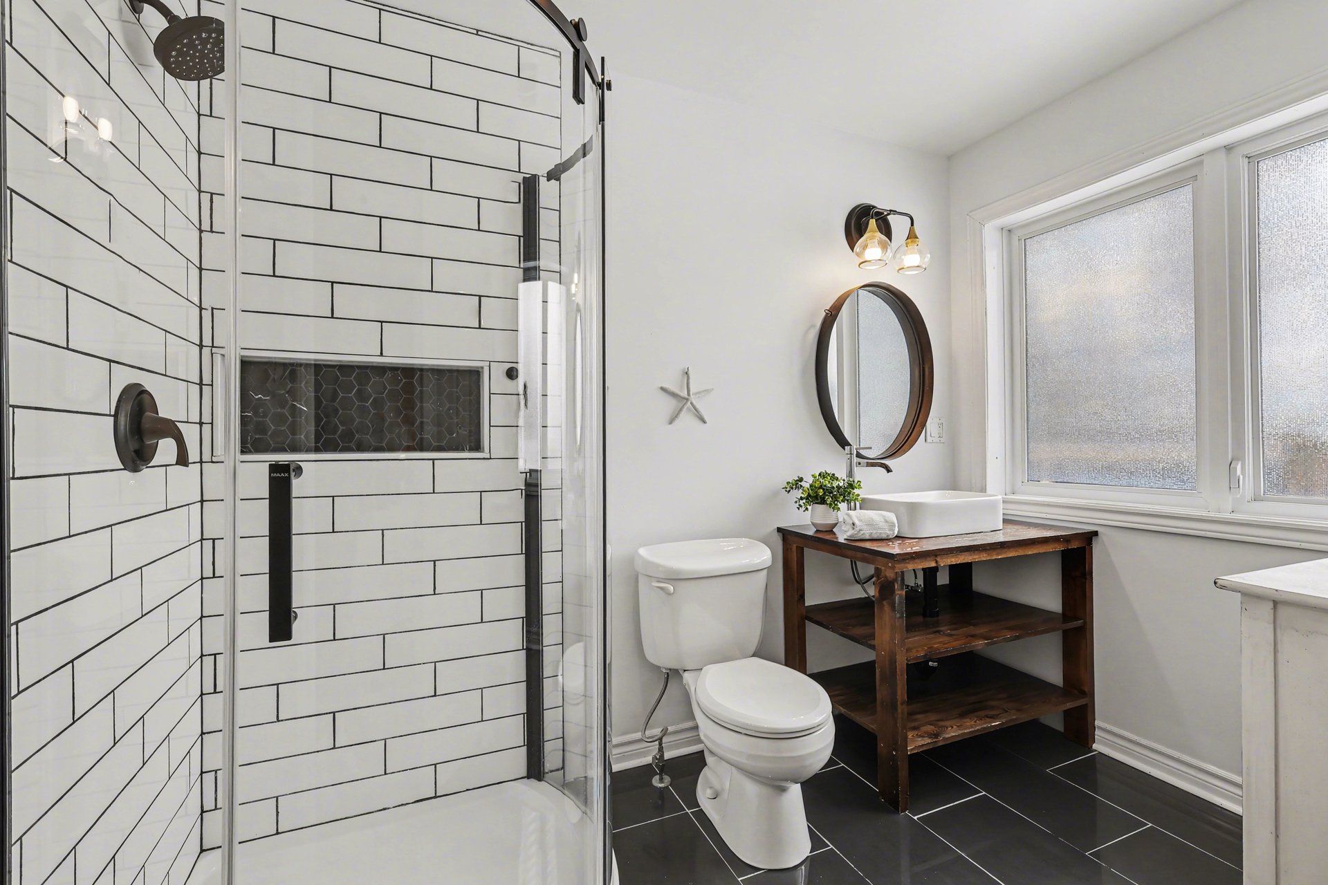 • Primary bedroom with ensuite featuring a double vanity and updated shower.