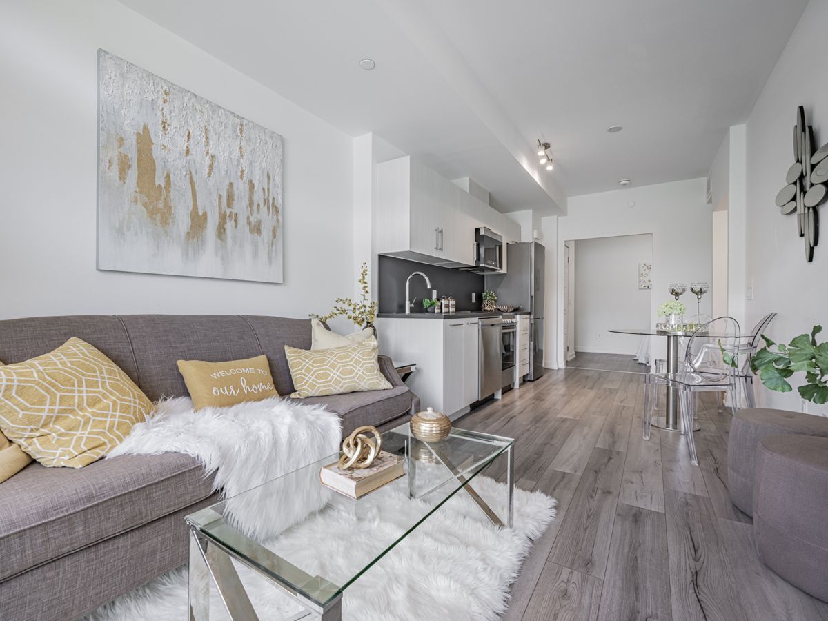 • Living/dining area has tall ceilings and a Juliette balcony.