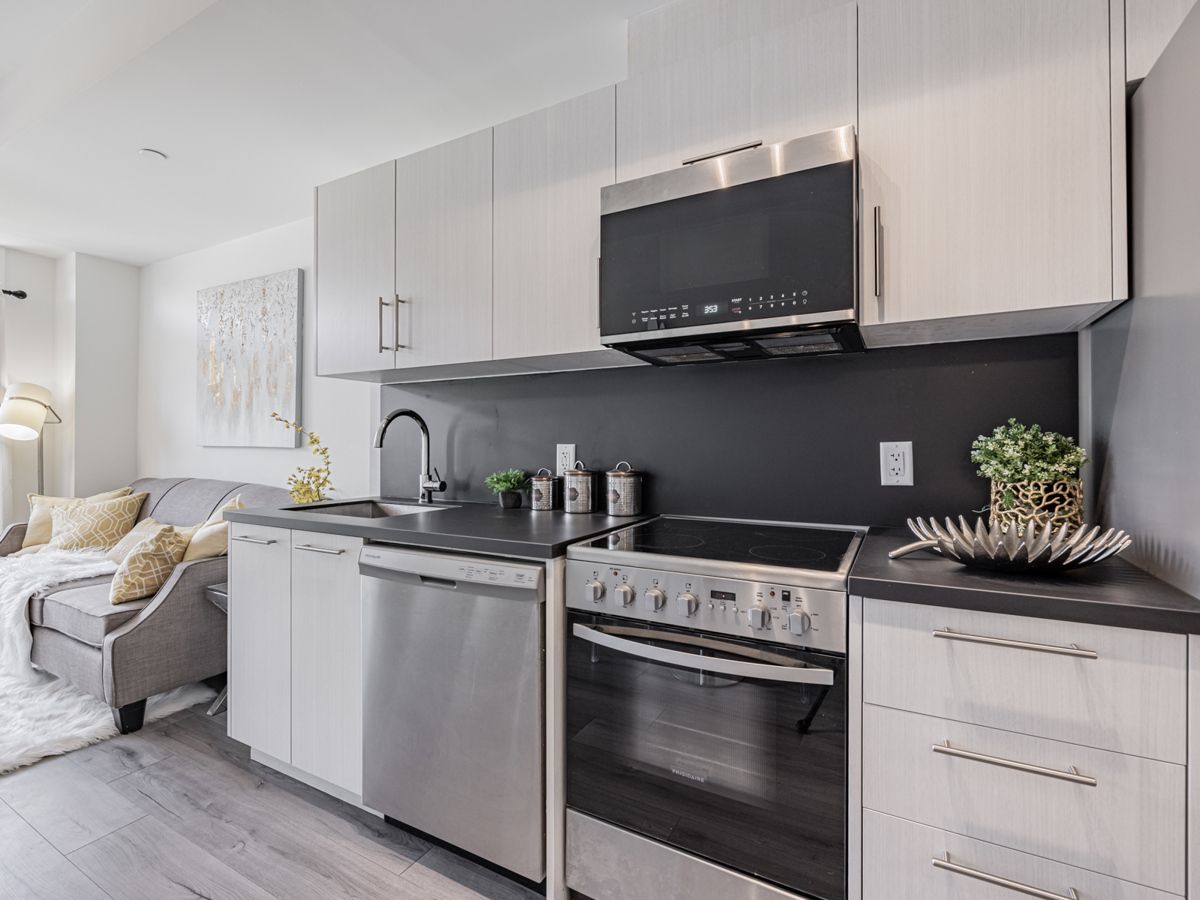 • Modern kitchen with stainless steel appliances and stone countertops.