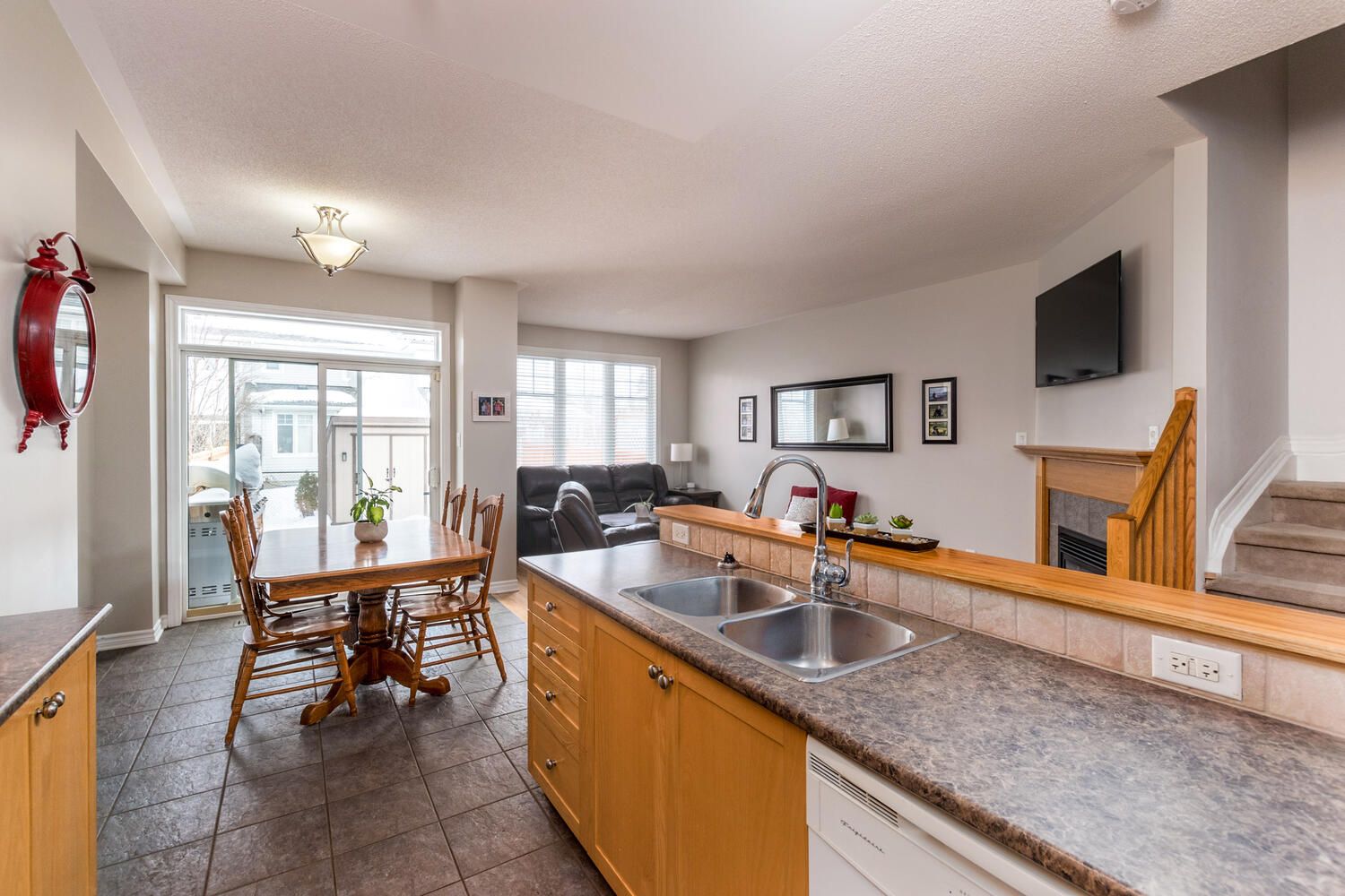 • Bright open-concept main floor with hardwood and gas fireplace.