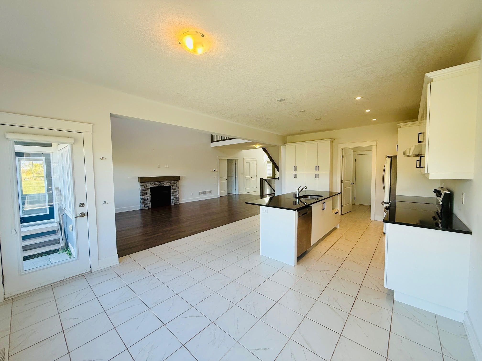 • Gourmet kitchen with stainless steel appliances and large island.
