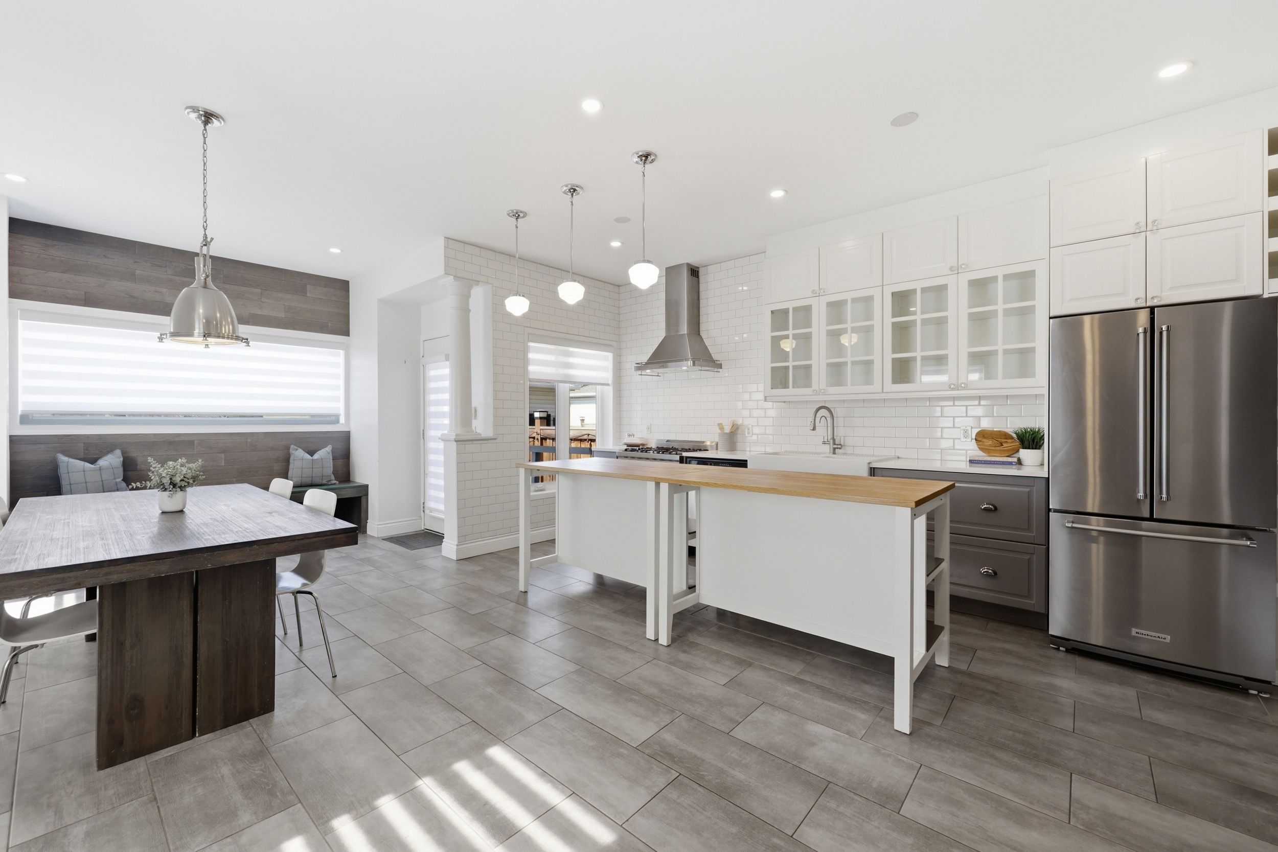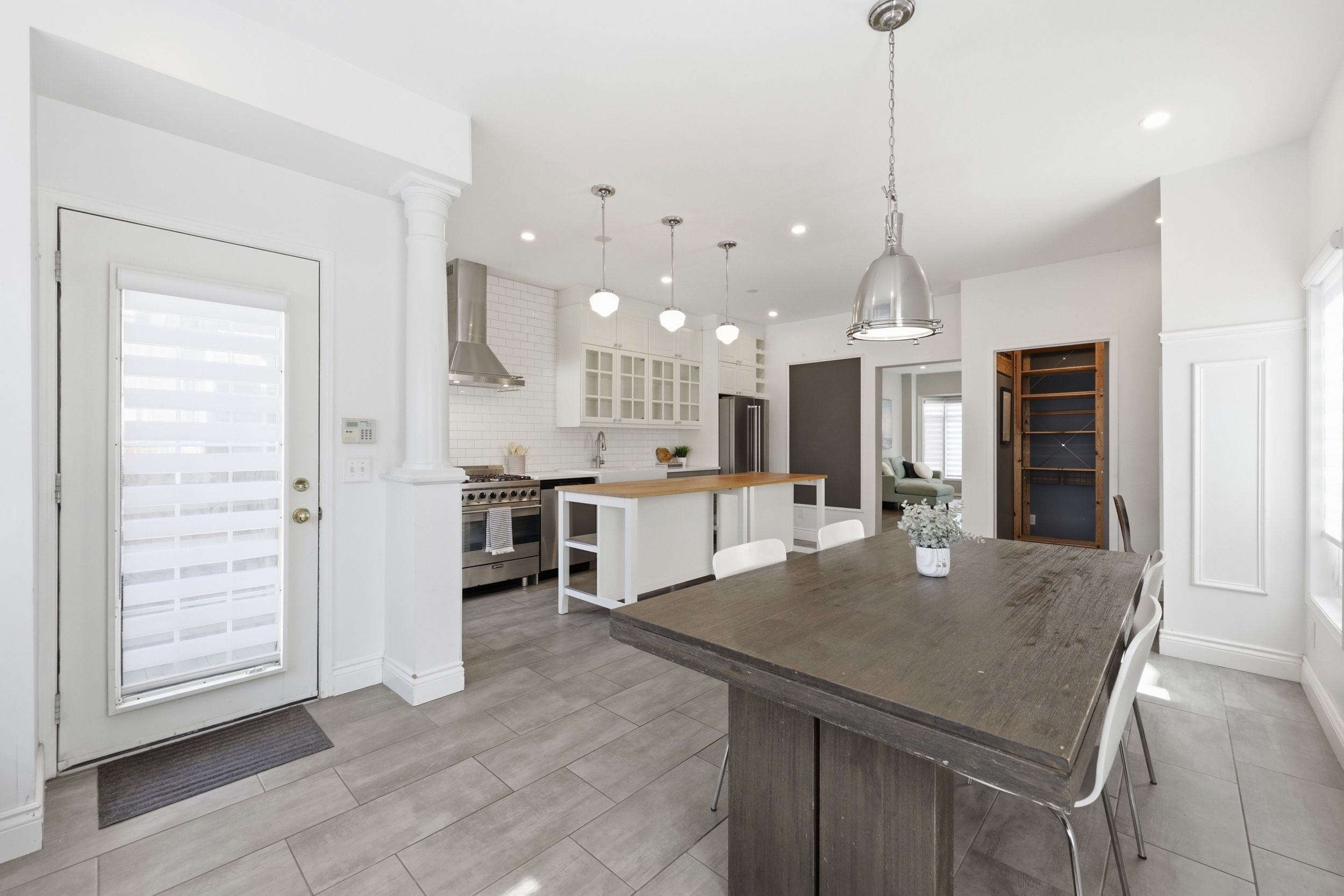 • Renovated chef's kitchen with stainless steel appliances and oversized pantry.