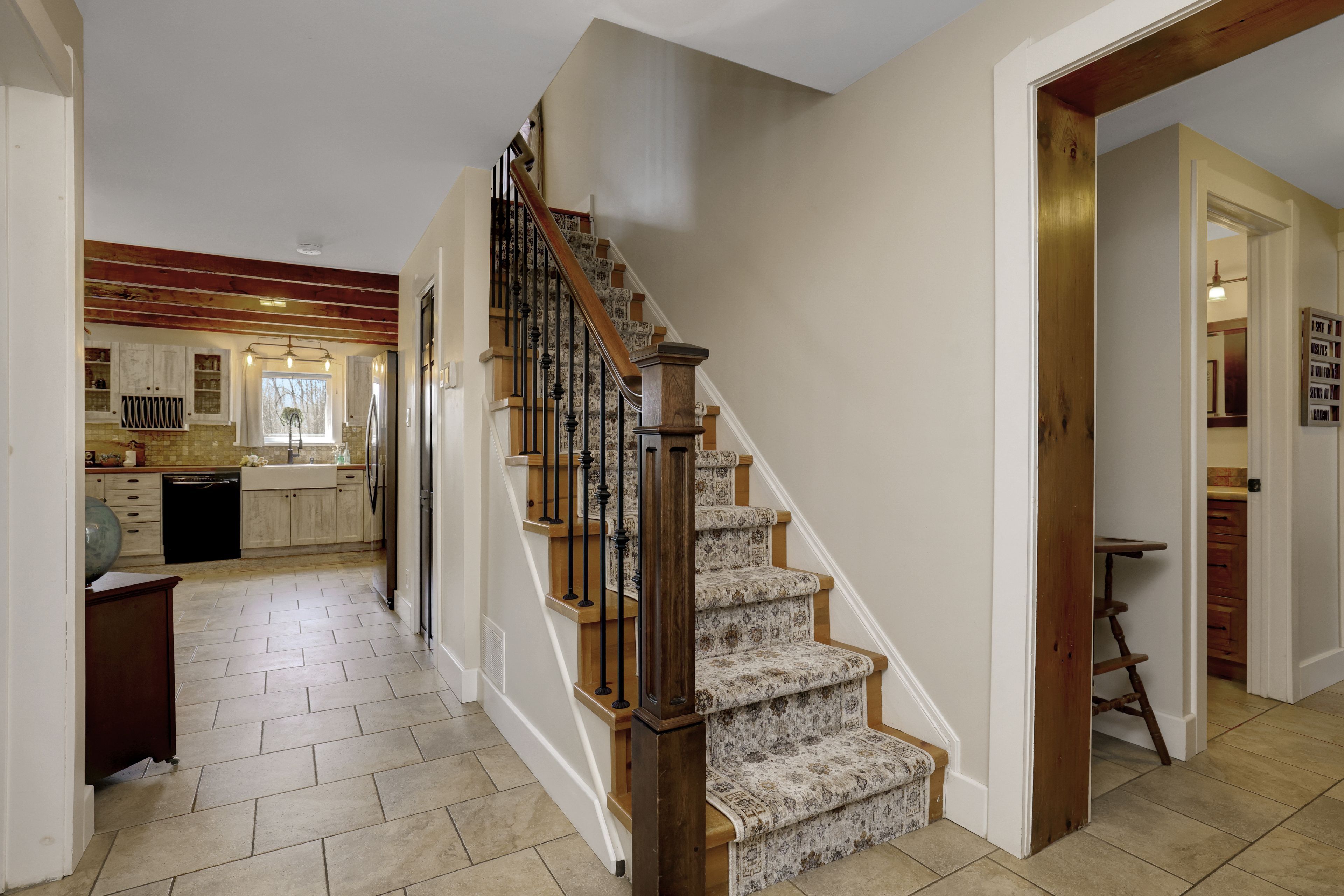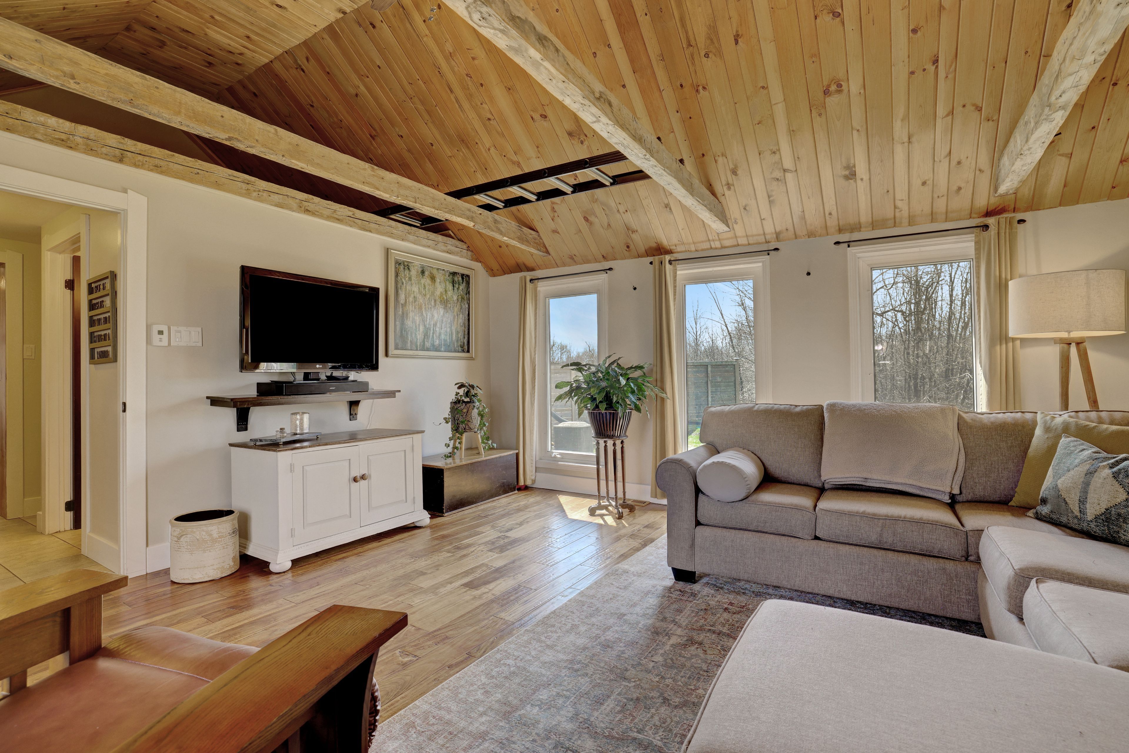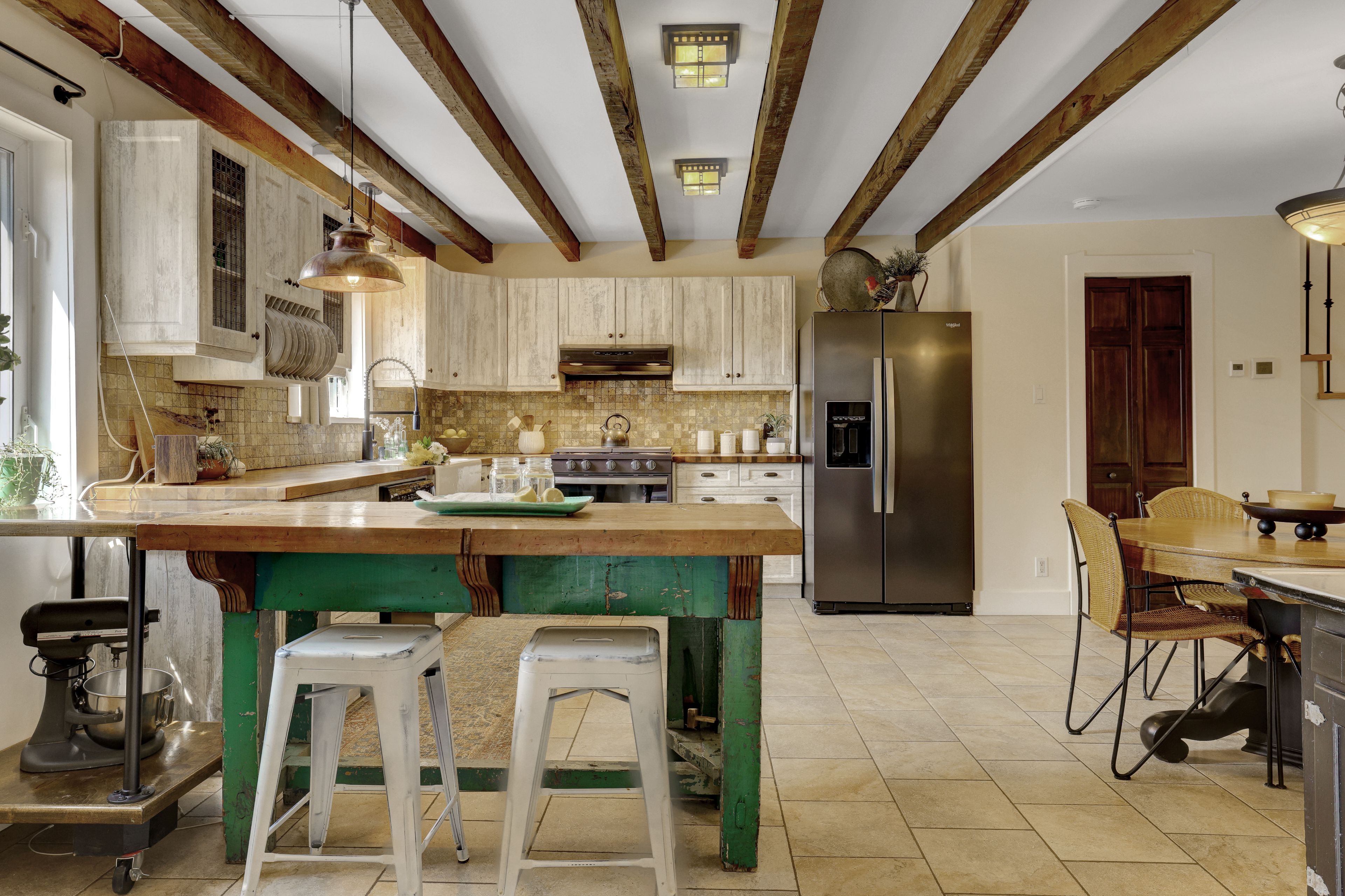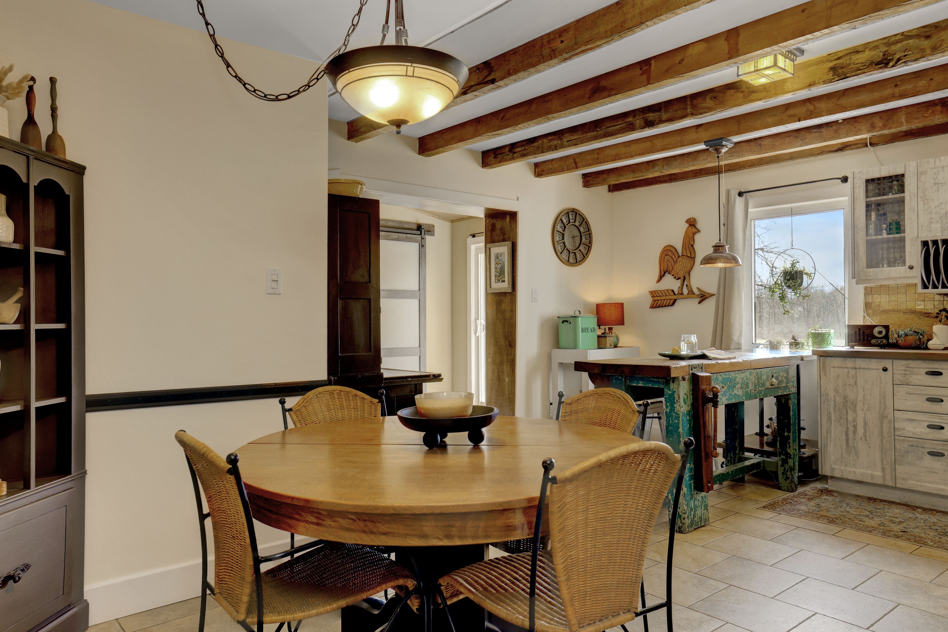 • Thoughtfully renovated interiors with exposed beams and warm accents.