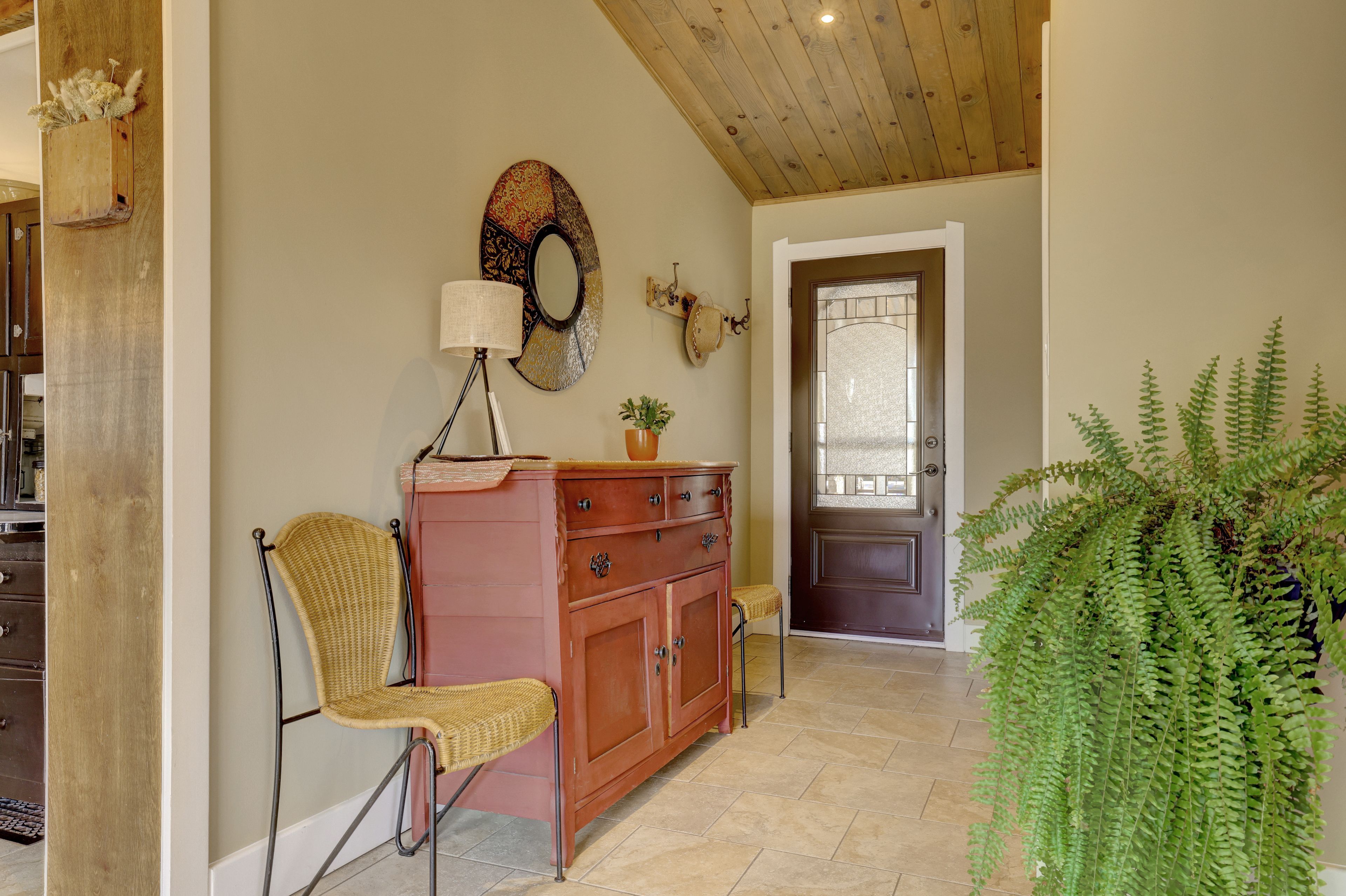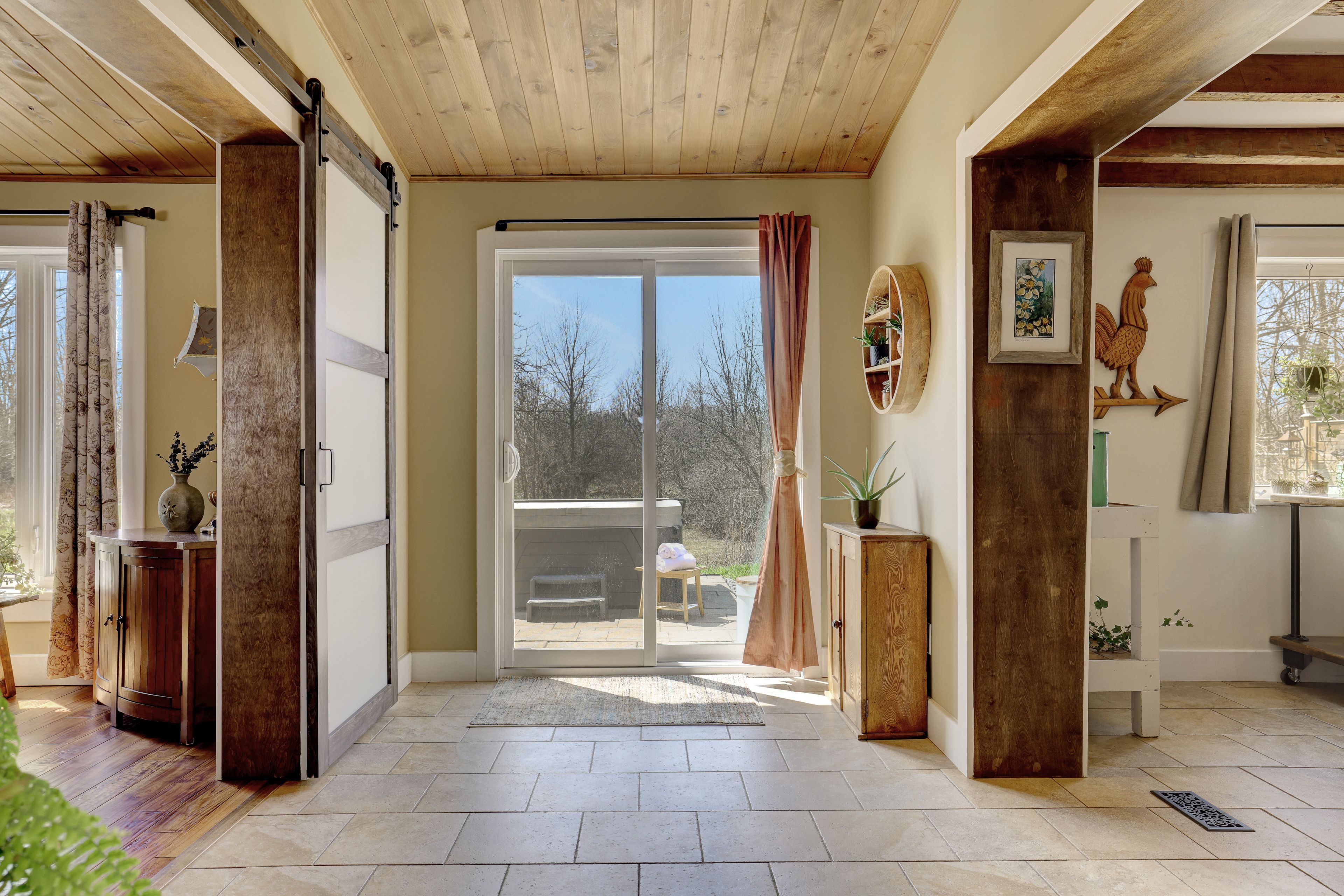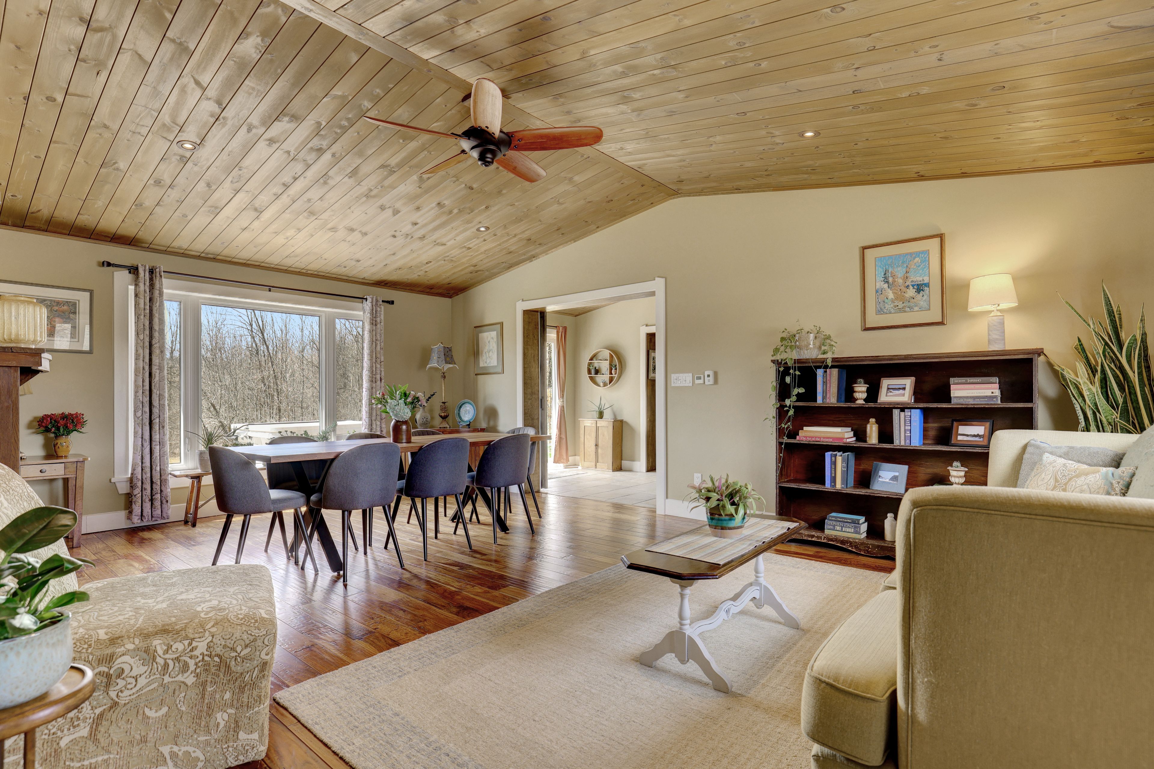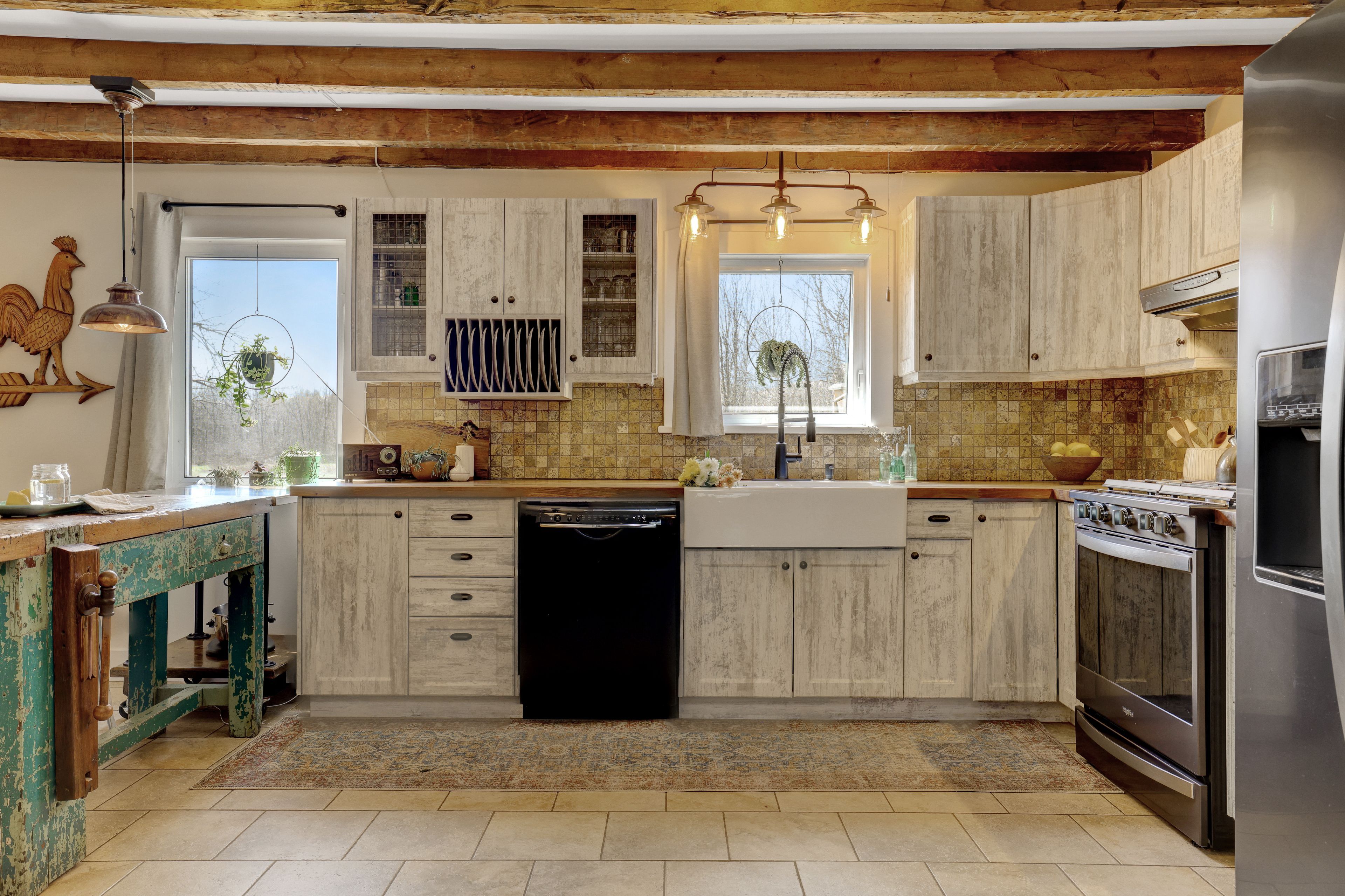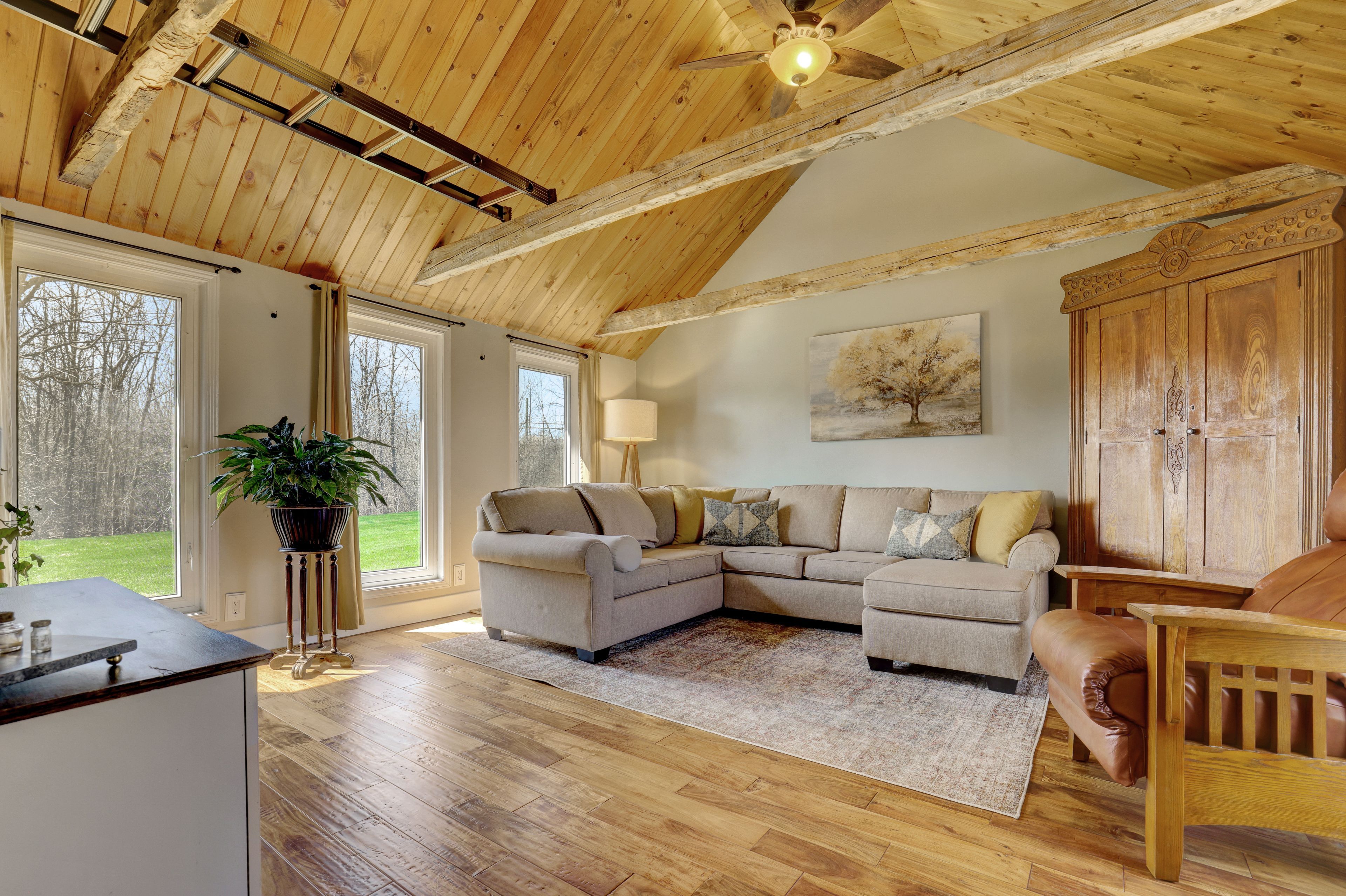 • Thoughtfully renovated interiors with exposed beams and warm accents.