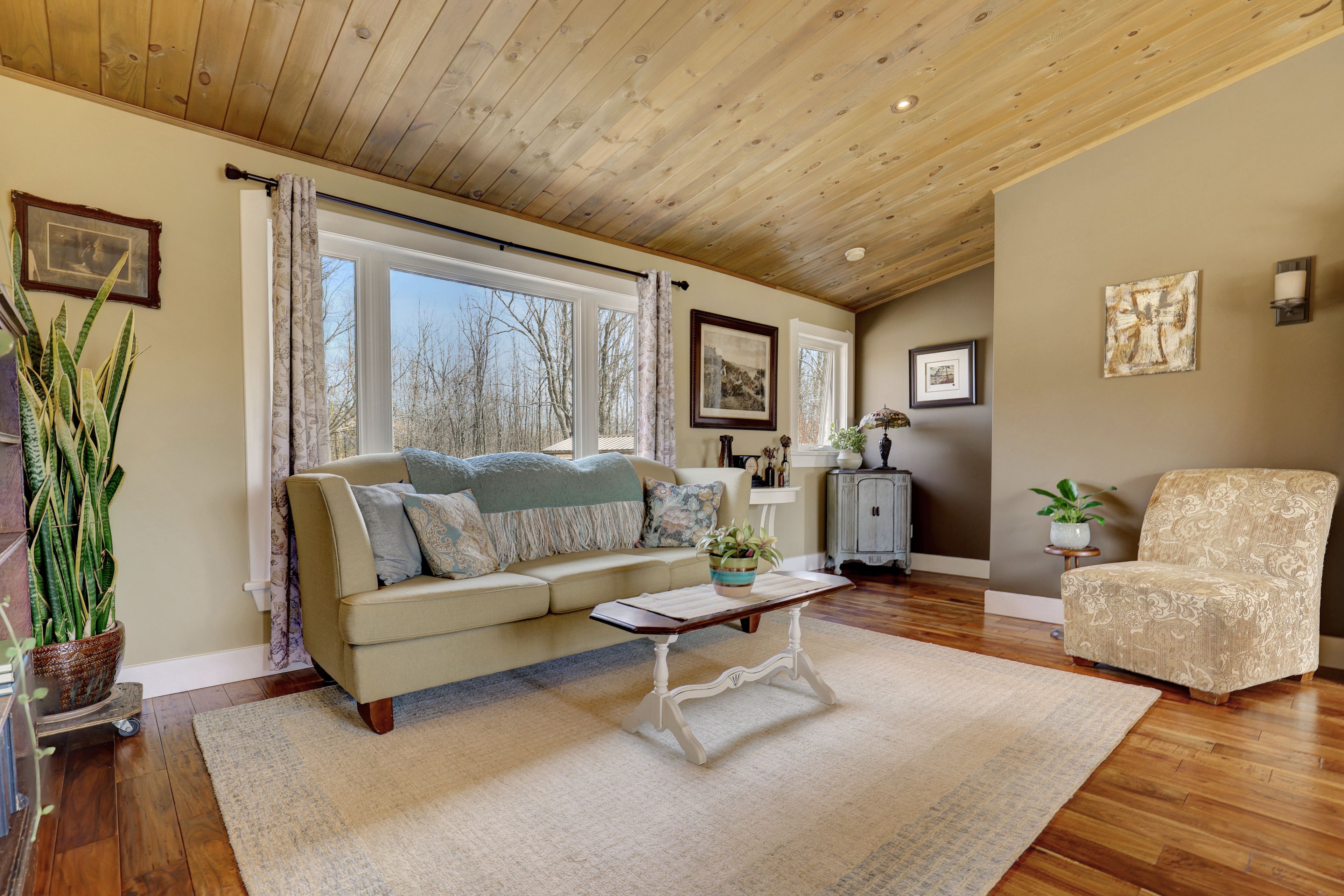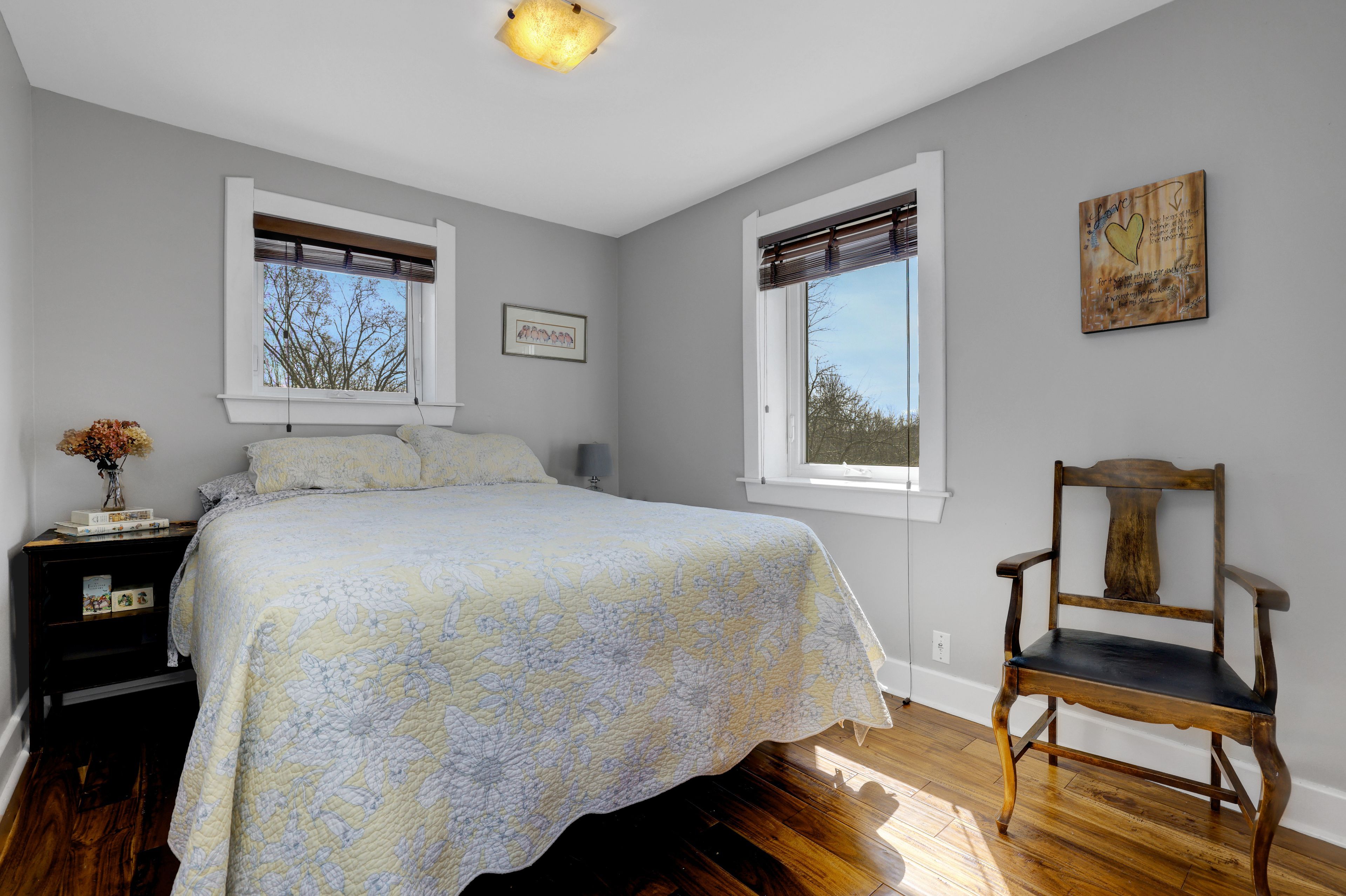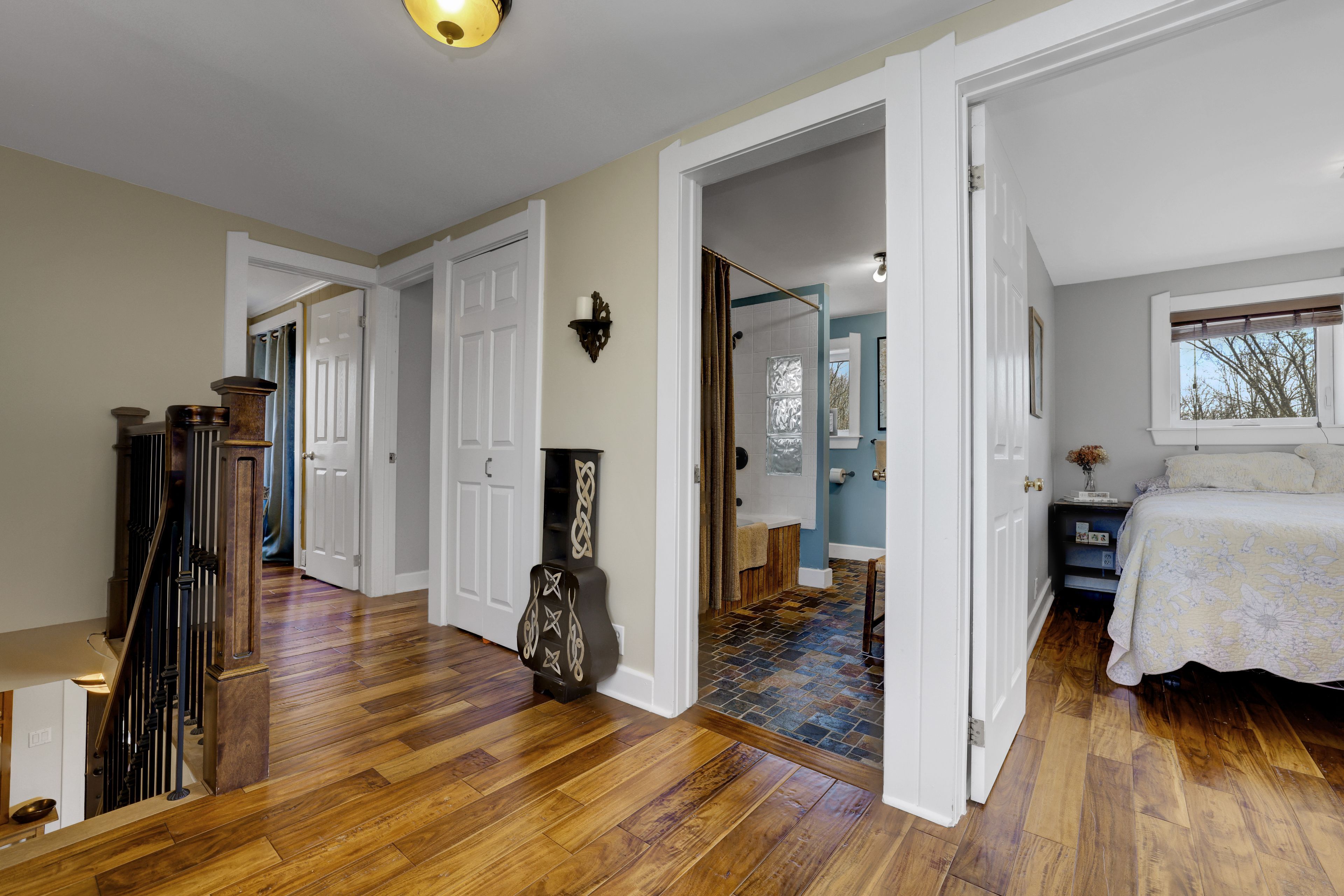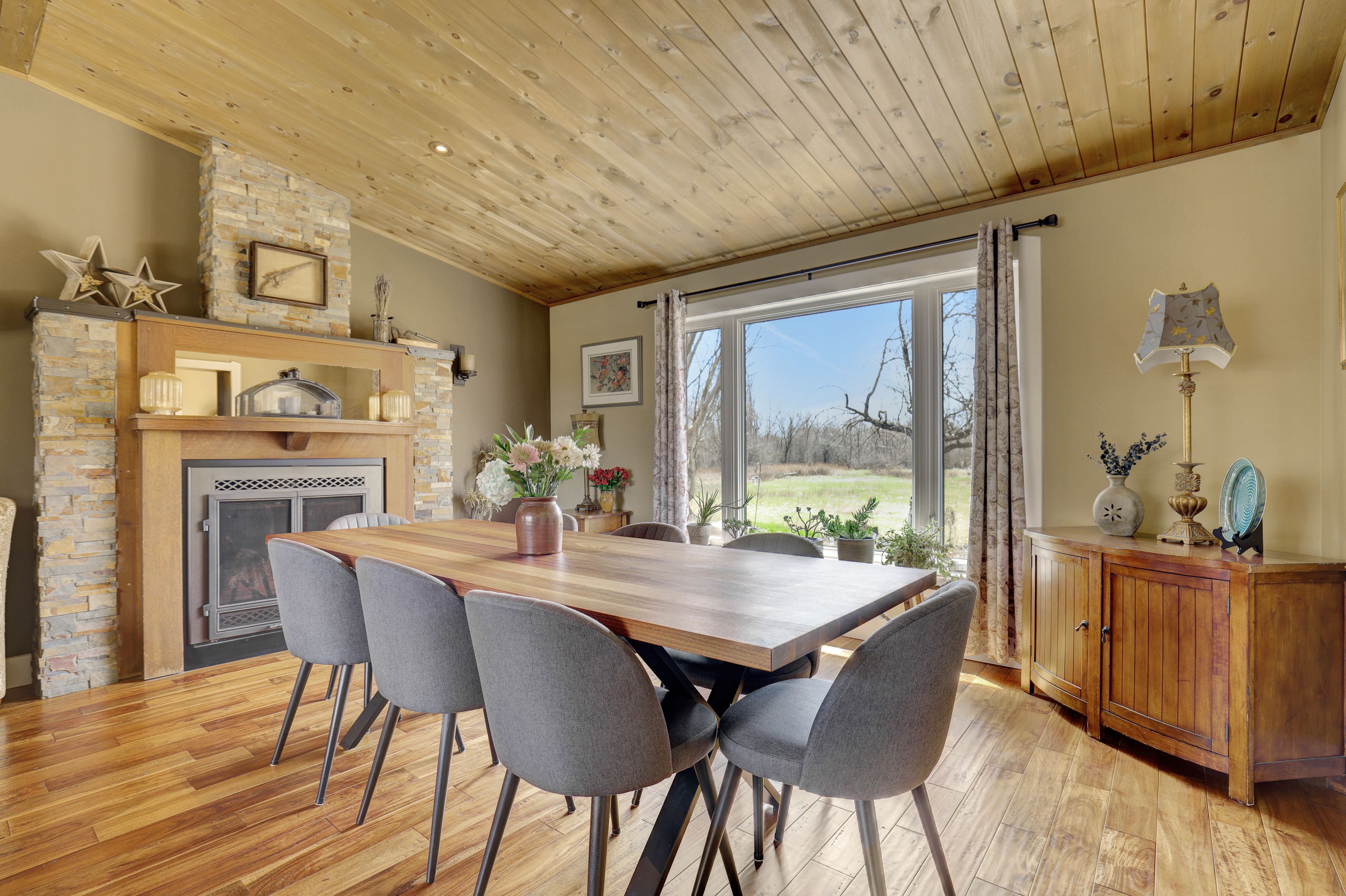 • Thoughtfully renovated interiors with exposed beams and warm accents.