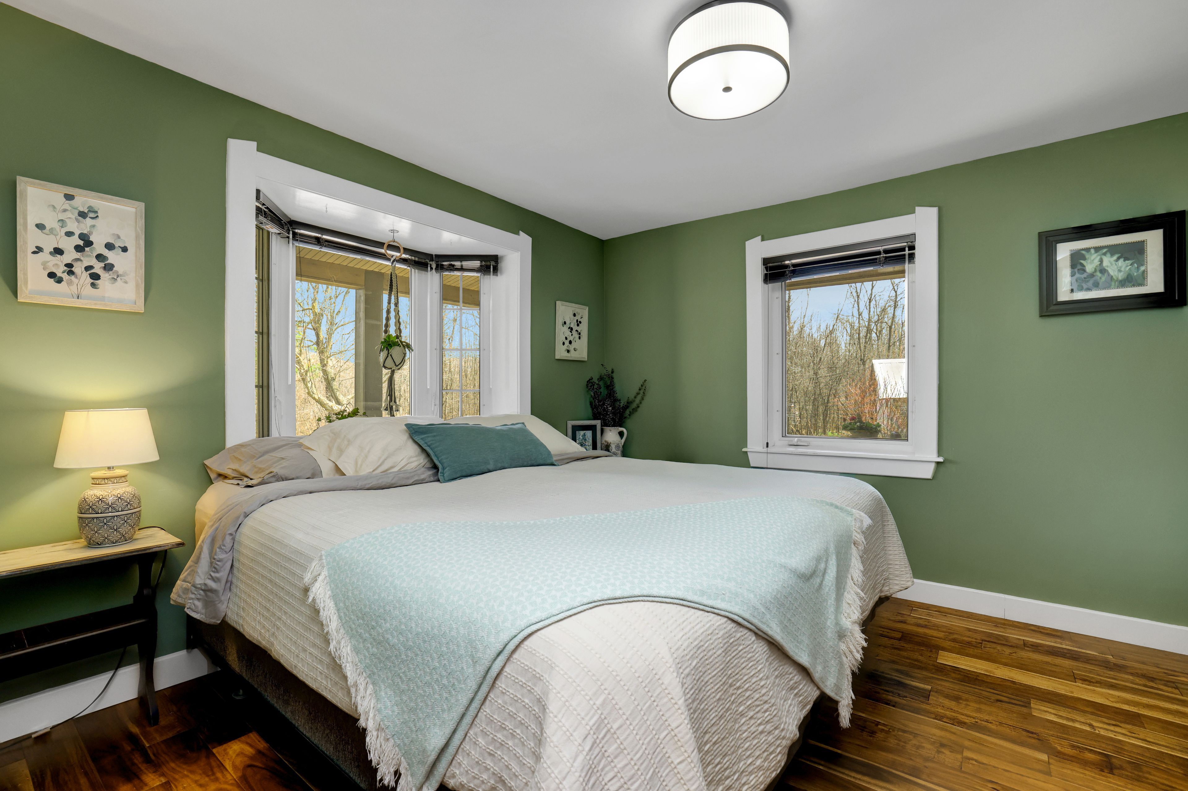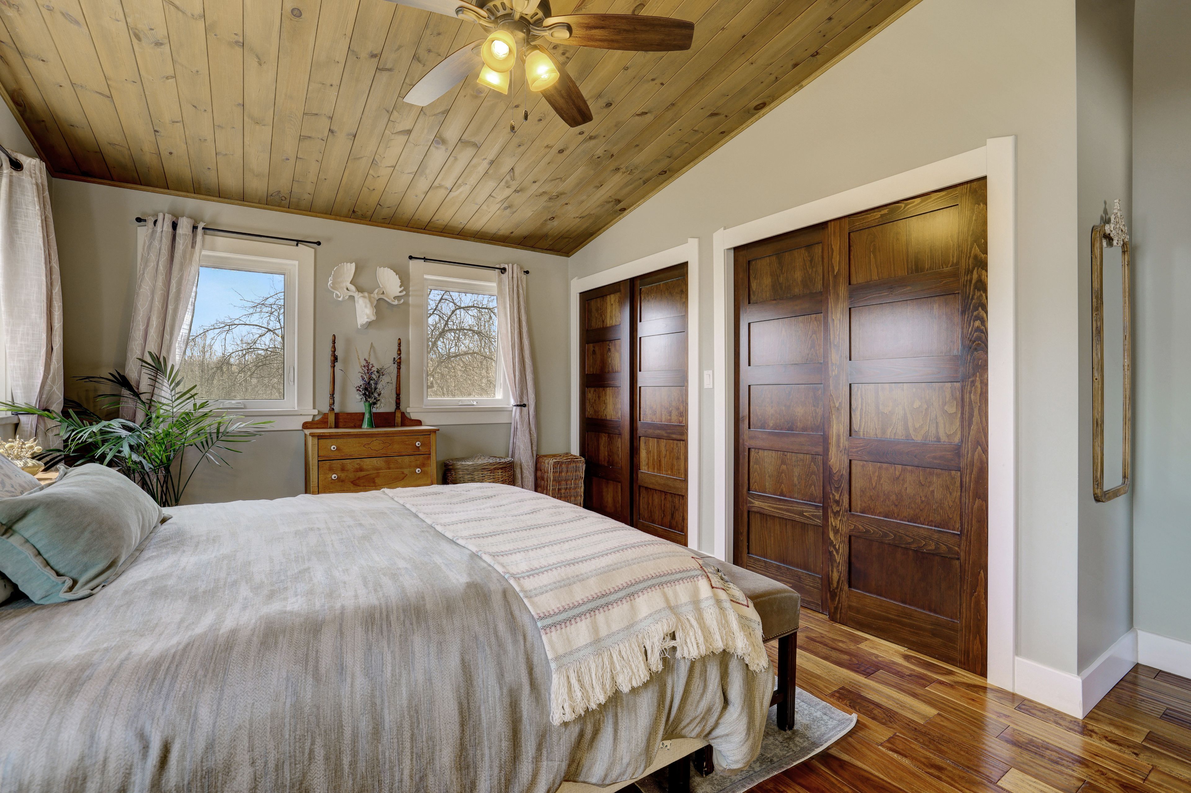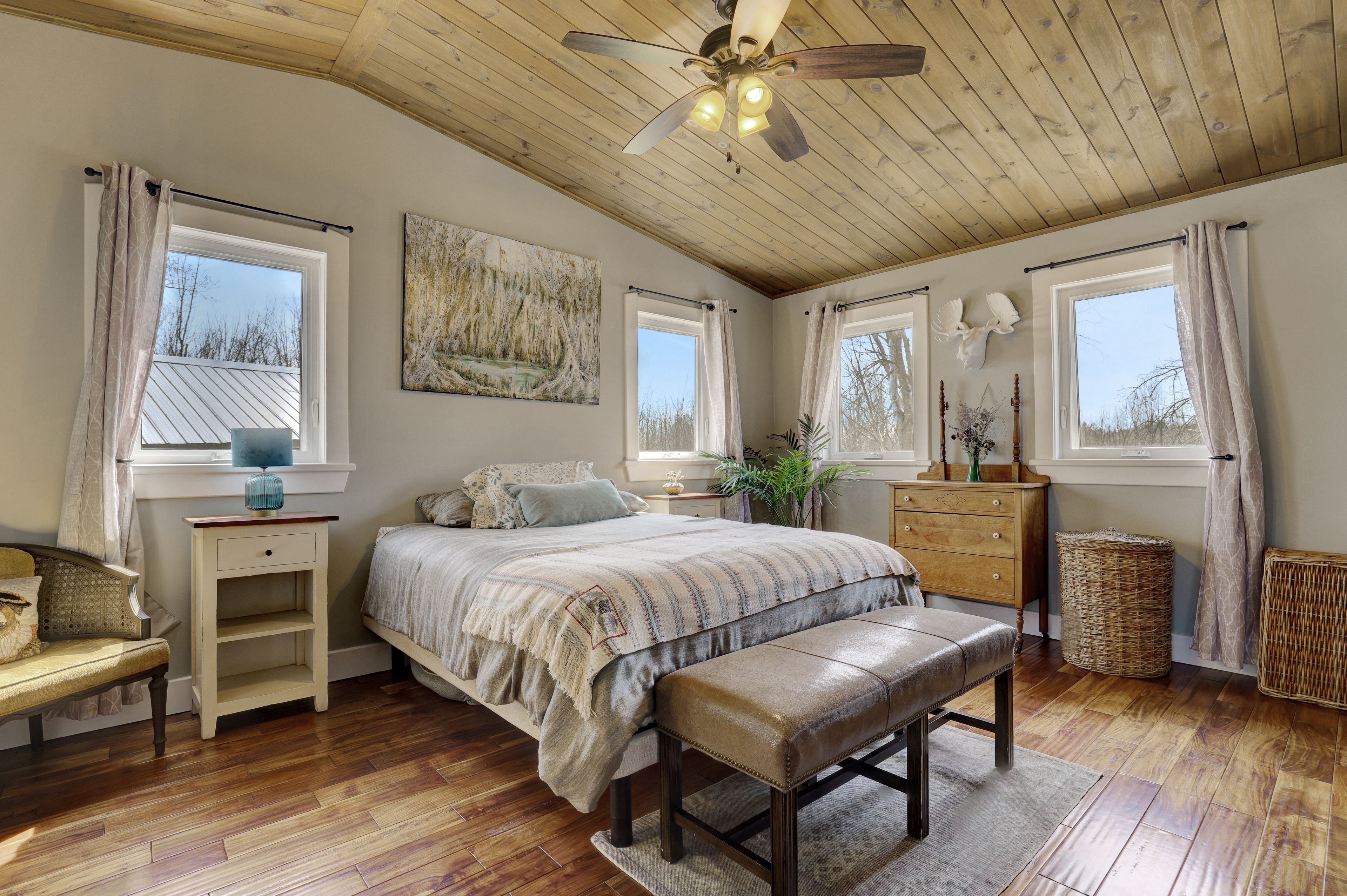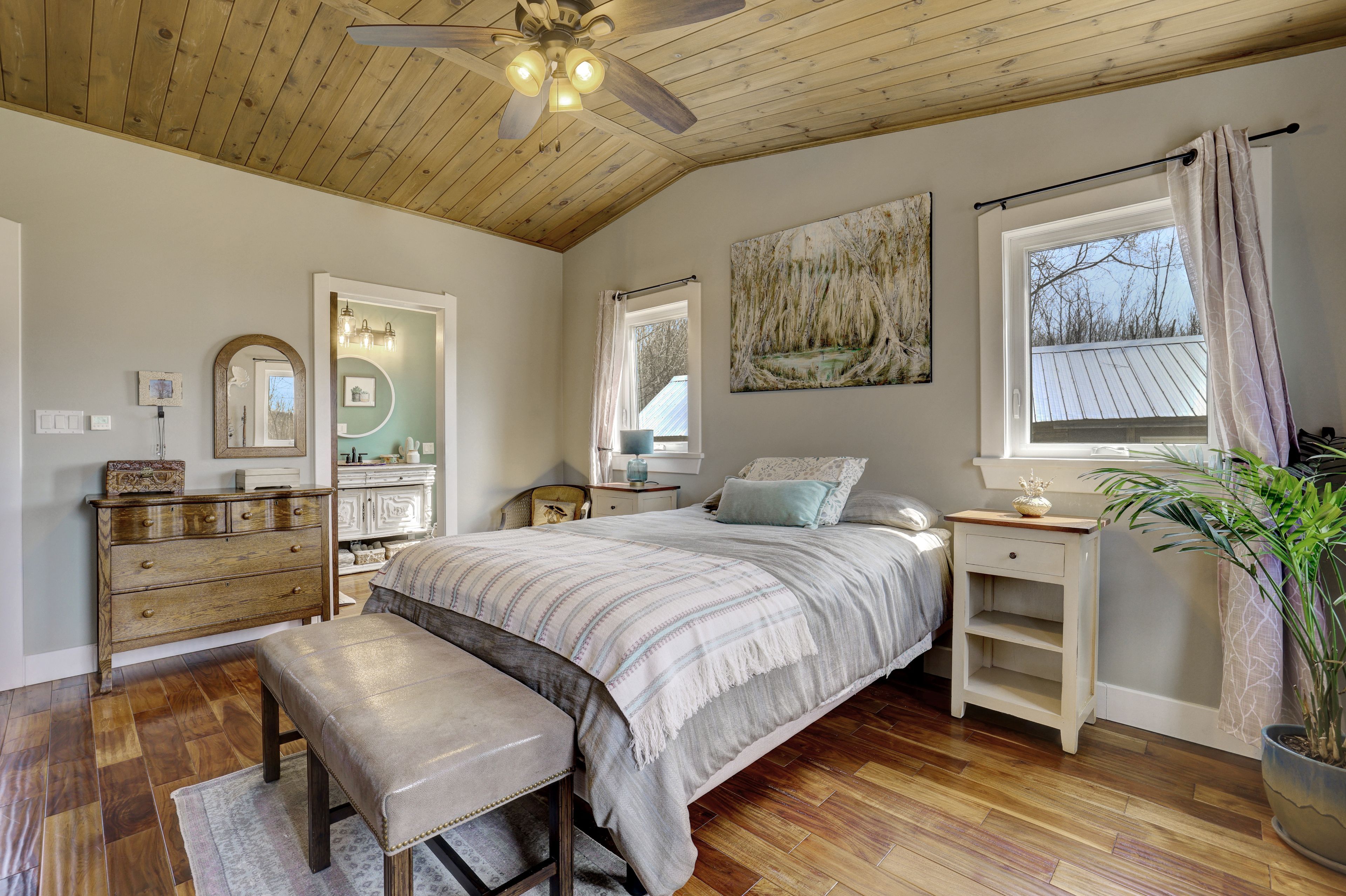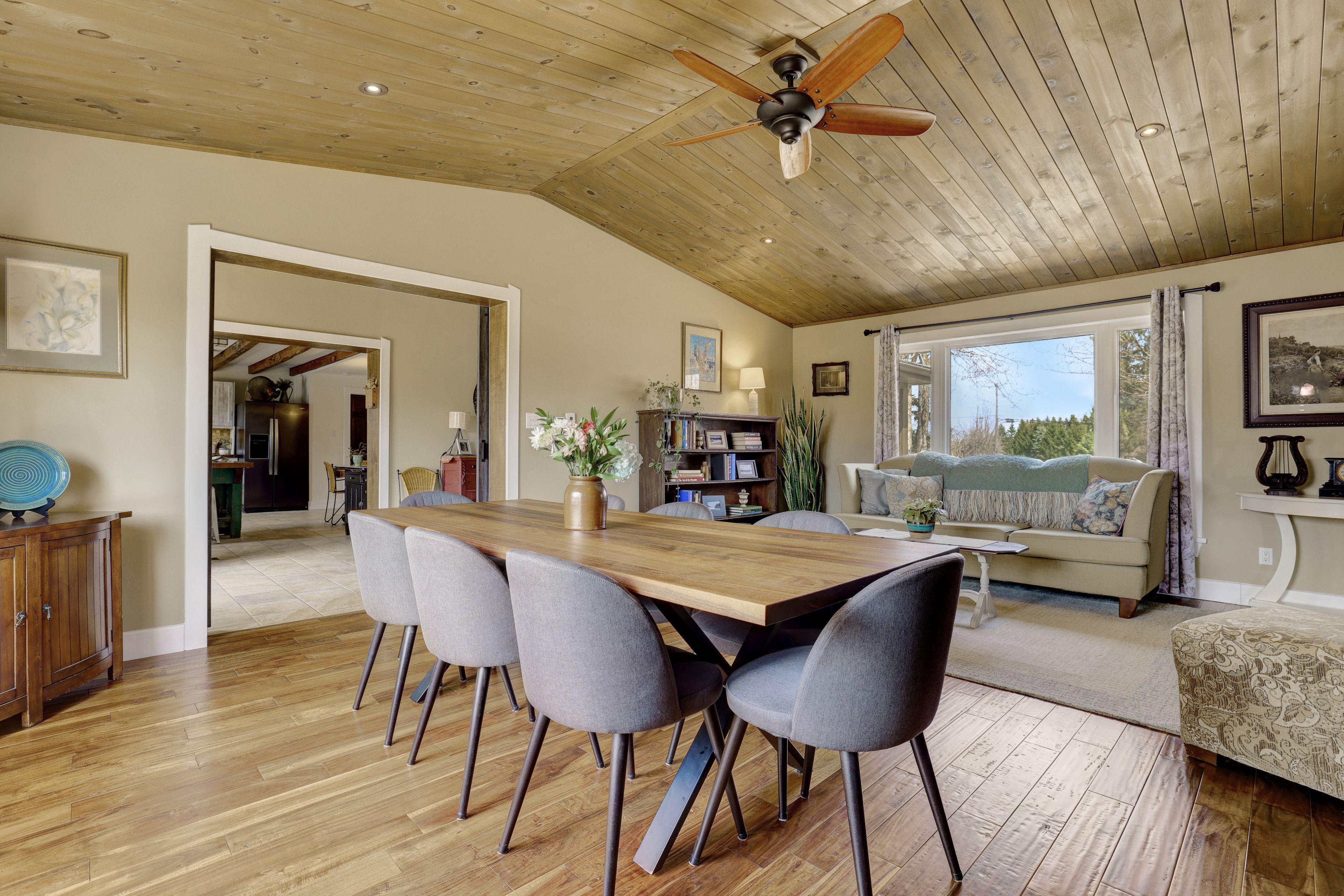 • Thoughtfully renovated interiors with exposed beams and warm accents.