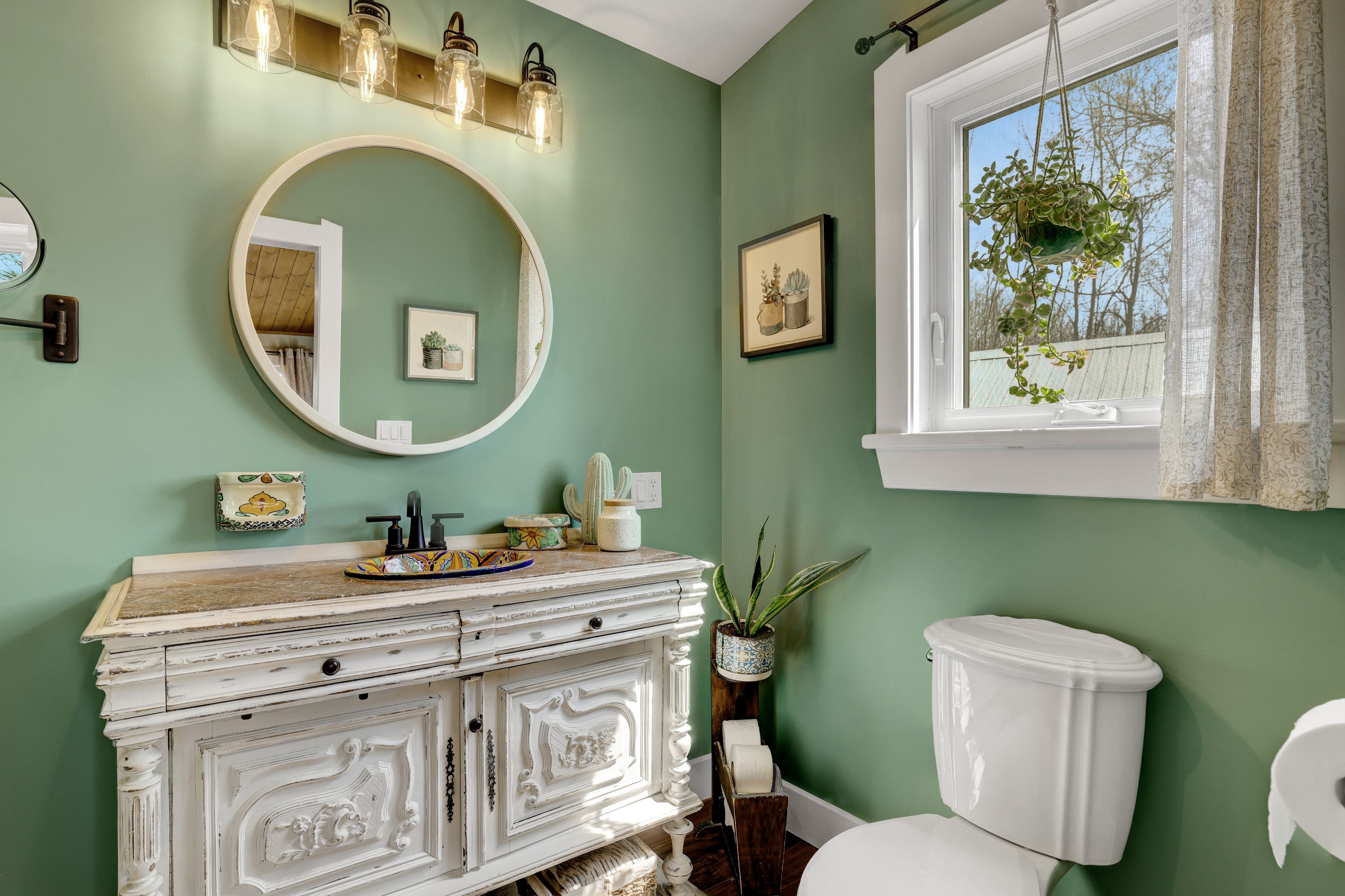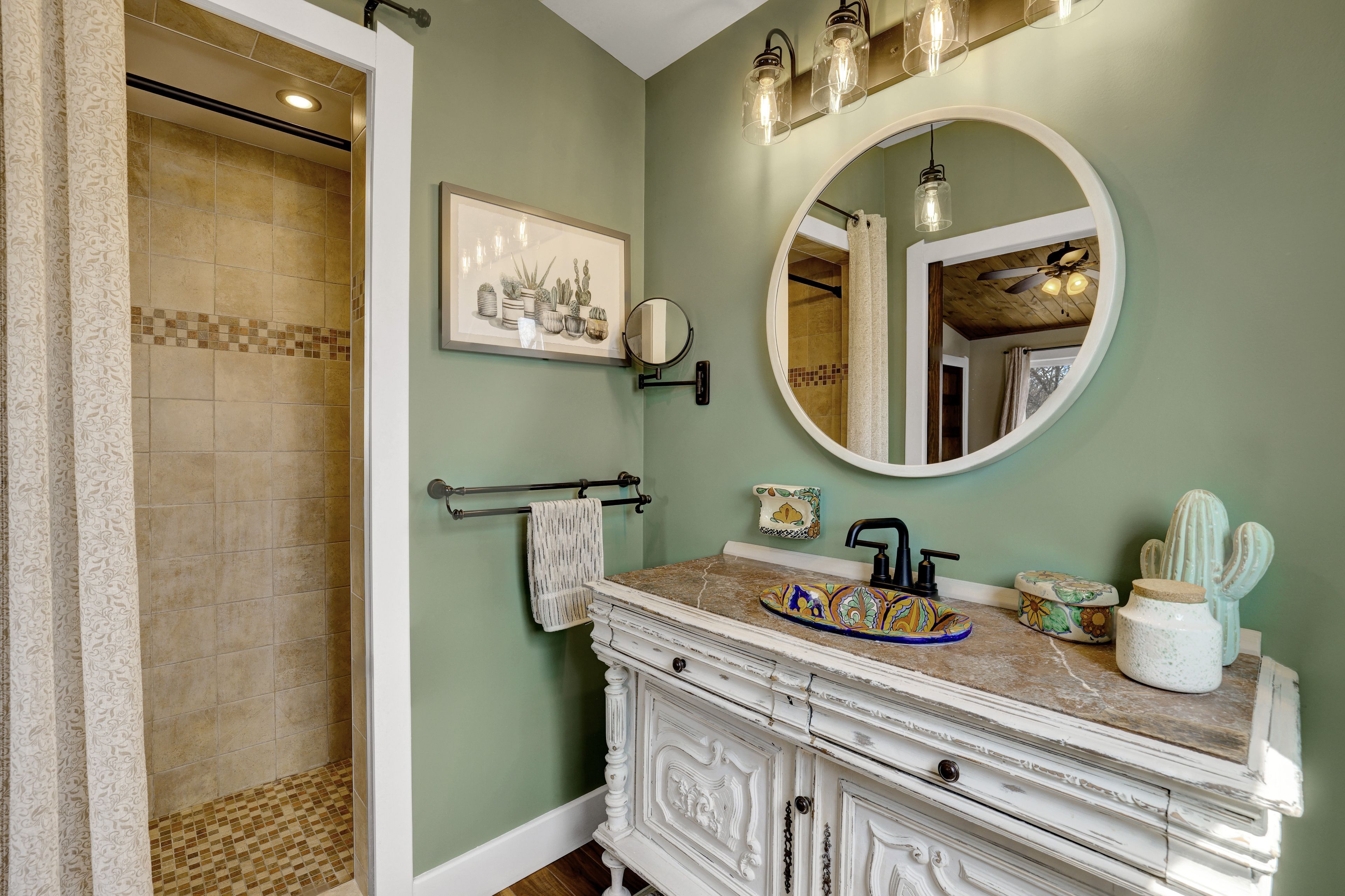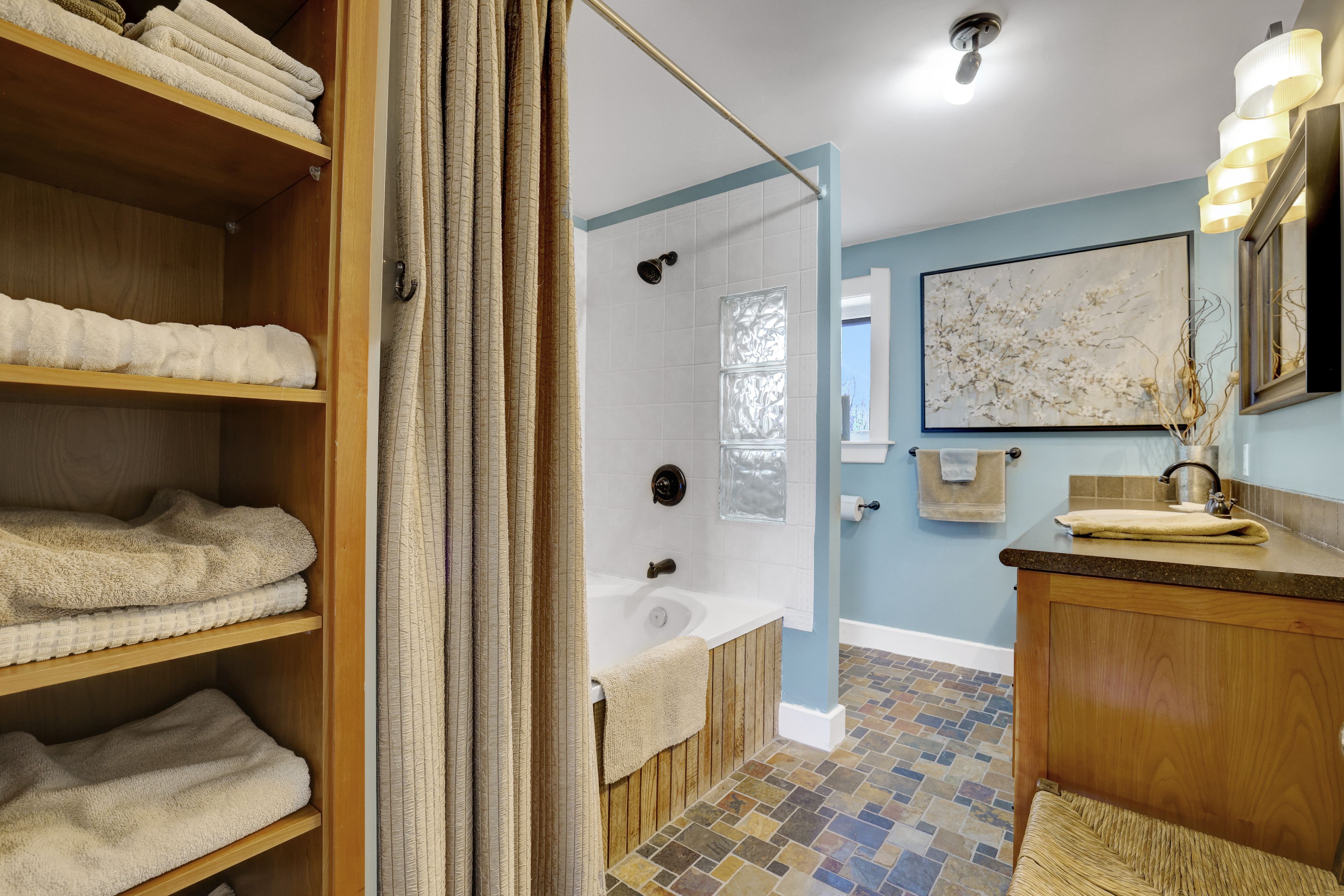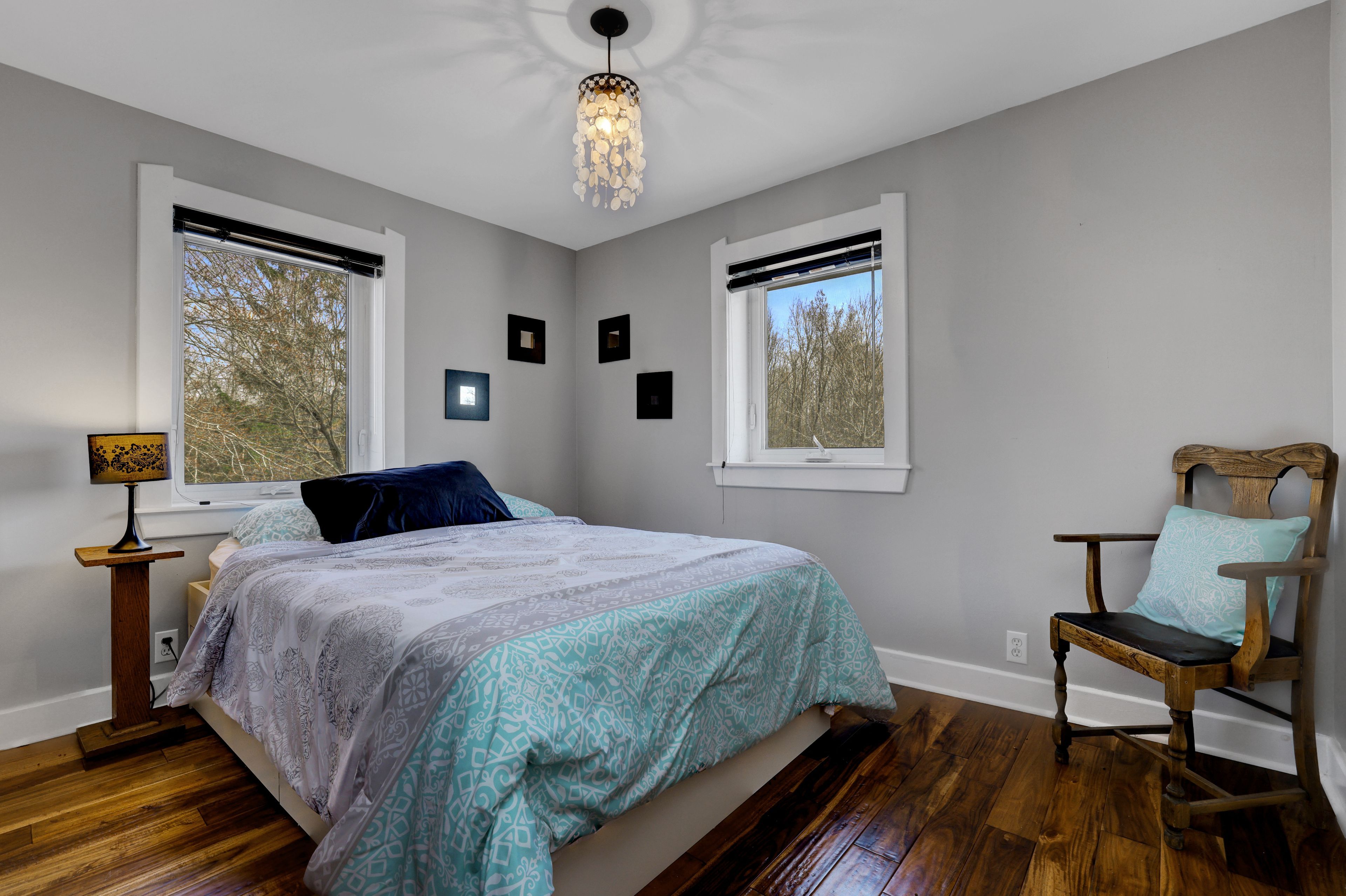 • Thoughtfully renovated interiors with exposed beams and warm accents.