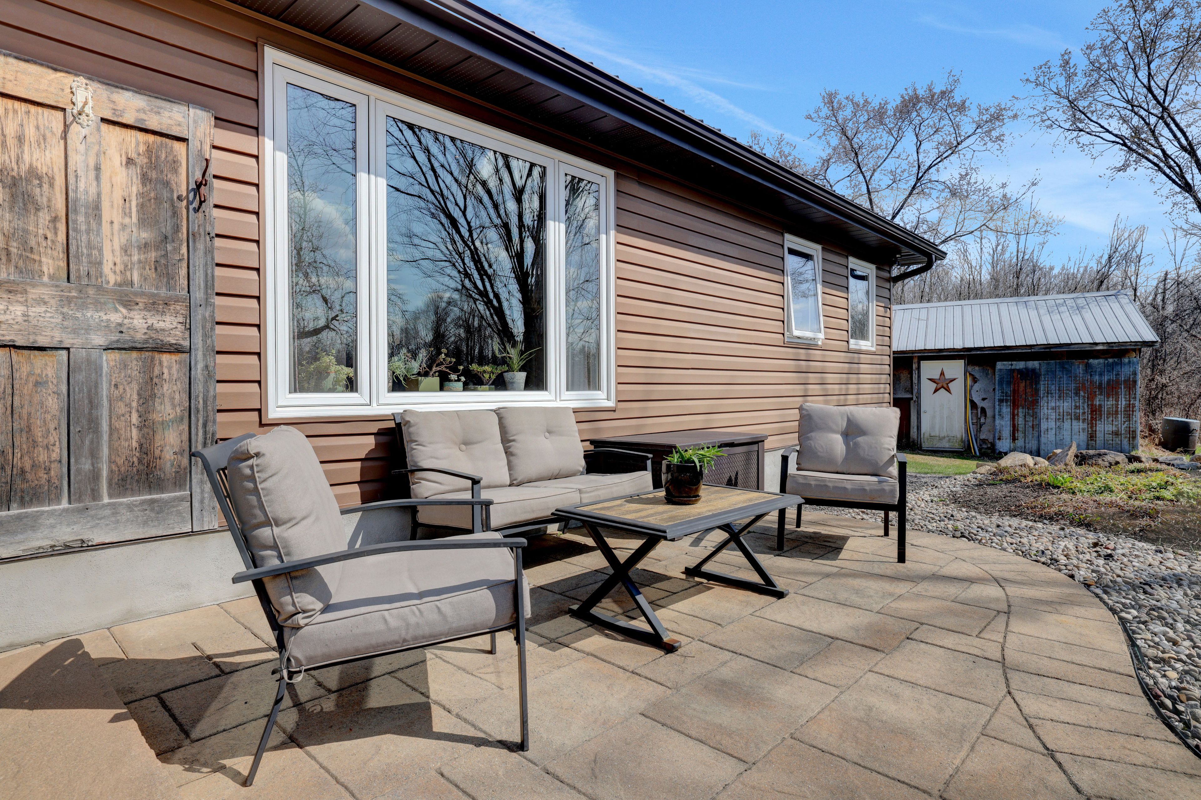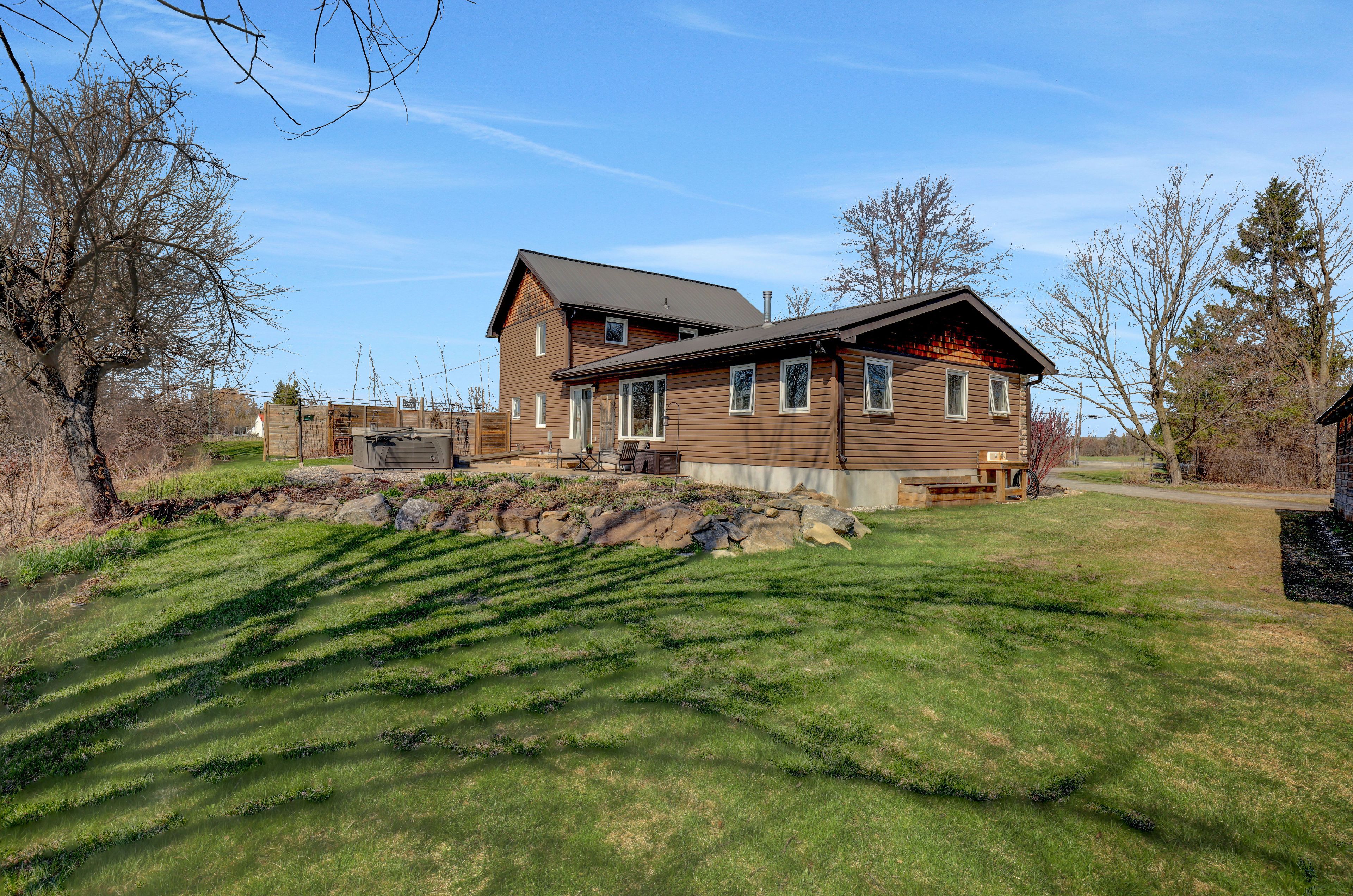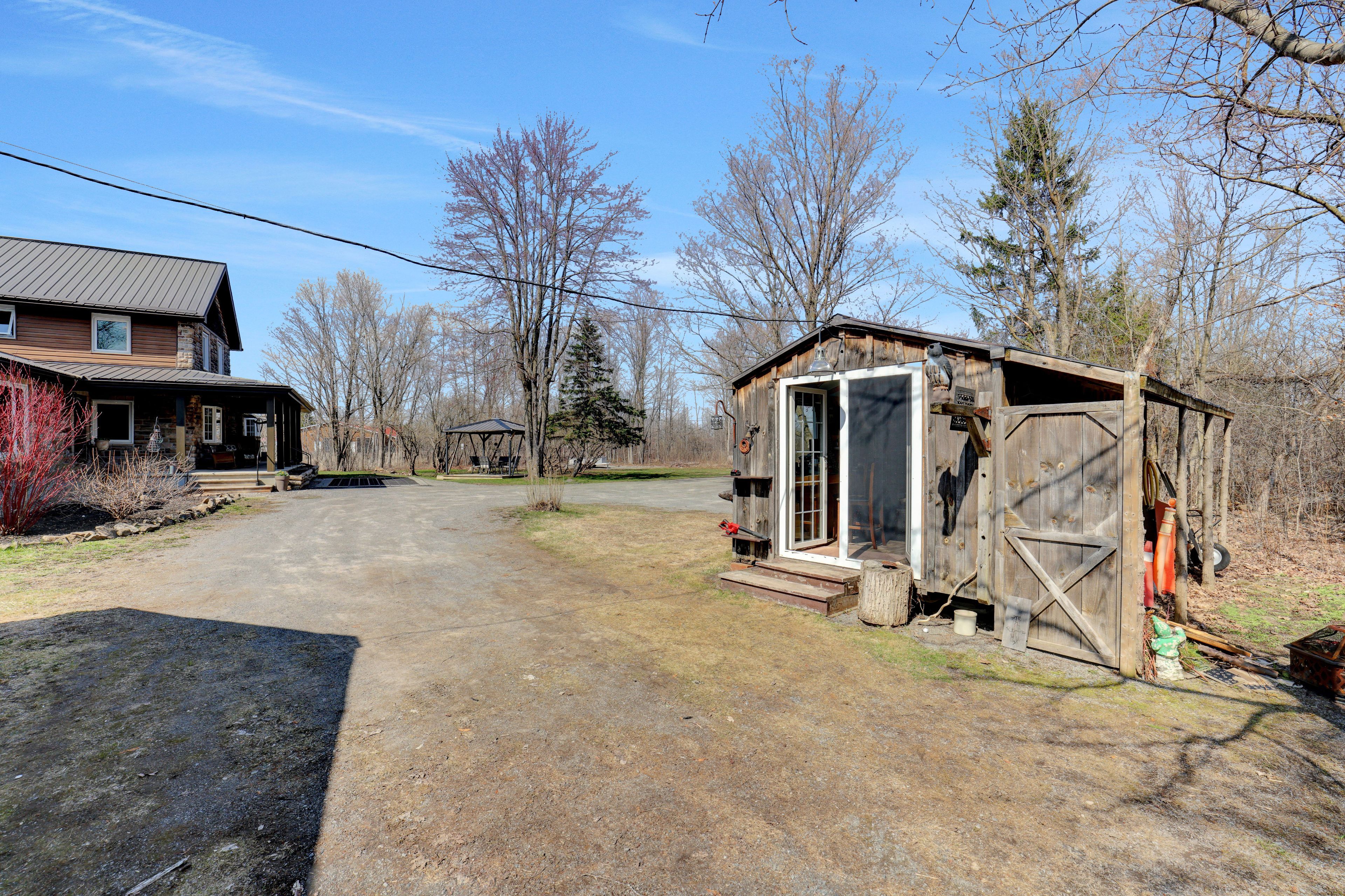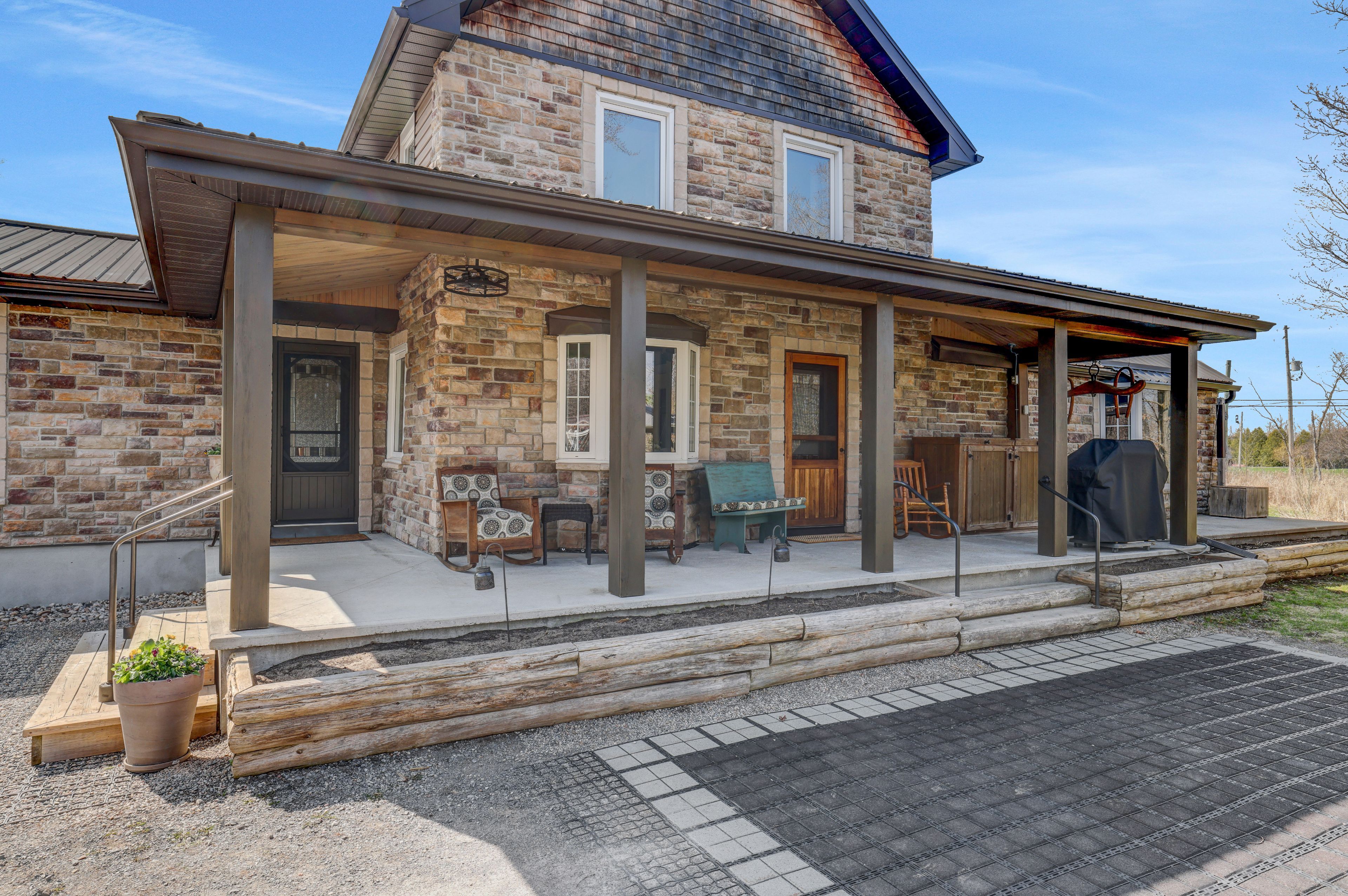 Welcome to a truly special countryside retreat where timeless character meets thoughtful, top-to-bottom renovation. This beautifully restored century farmhouse, set on 1. 8 acres of picturesque land, captures the essence of rustic living while delivering the comfort and efficiency today's buyers expect. From the moment you arrive, the inviting front veranda sets the tone-perfect for morning coffee as you take in peaceful views of open fields where birds gather and nature quietly unfolds. Inside, the home has been extensively renovated while preserving its authentic charm, highlighted by exposed wood beams, warm tongue-and-groove accents, and a cohesive farmhouse aesthetic throughout. Two well-designed additions elevate both space and functionality. One features a stunning dining room and cozy sitting area that flow seamlessly into a private primary retreat, complete with a beautifully finished ensuite. The second addition offers a welcoming living room, ideal for relaxing or entertaining while surrounded by the home's rich textures and natural warmth. The main level is thoughtfully laid out with the primary bedroom, a second bedroom, and convenient laundry, making everyday living both practical and accessible. Upstairs, you'll find three additional bedrooms and a spacious, updated bathroom-perfect for family or guests. Outdoors, the lifestyle continues with a hot tub, gazebo, expansive lawn, and a tranquil wooded area that adds both privacy and charm. Two outbuildings enhance the property's versatility: a classic old barn full of character and a smaller shed currently used as a workshop. With radiant floor heating adding year-round comfort and every detail carefully considered, this property offers a rare blend of heritage appeal and modern convenience-an ideal escape for those seeking refined country living just beyond the everyday.