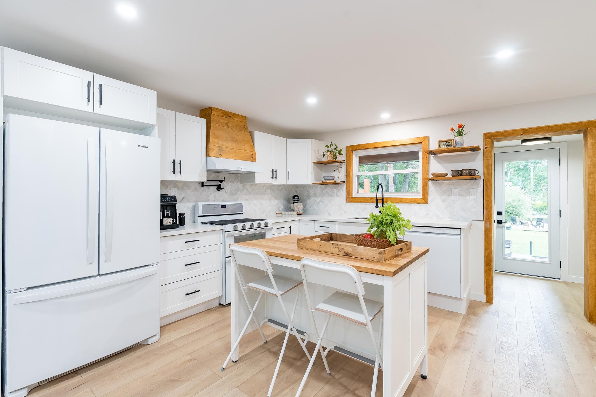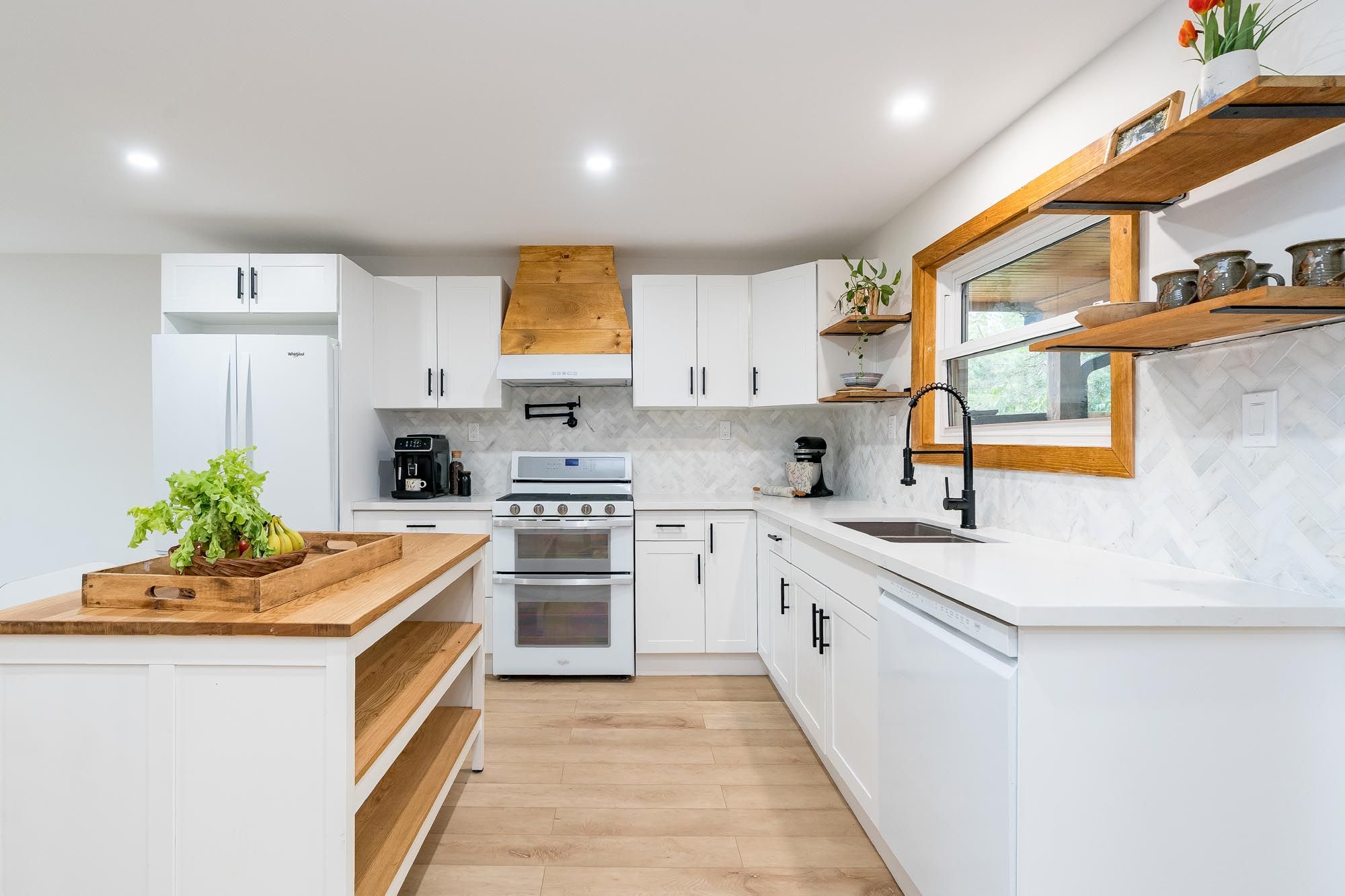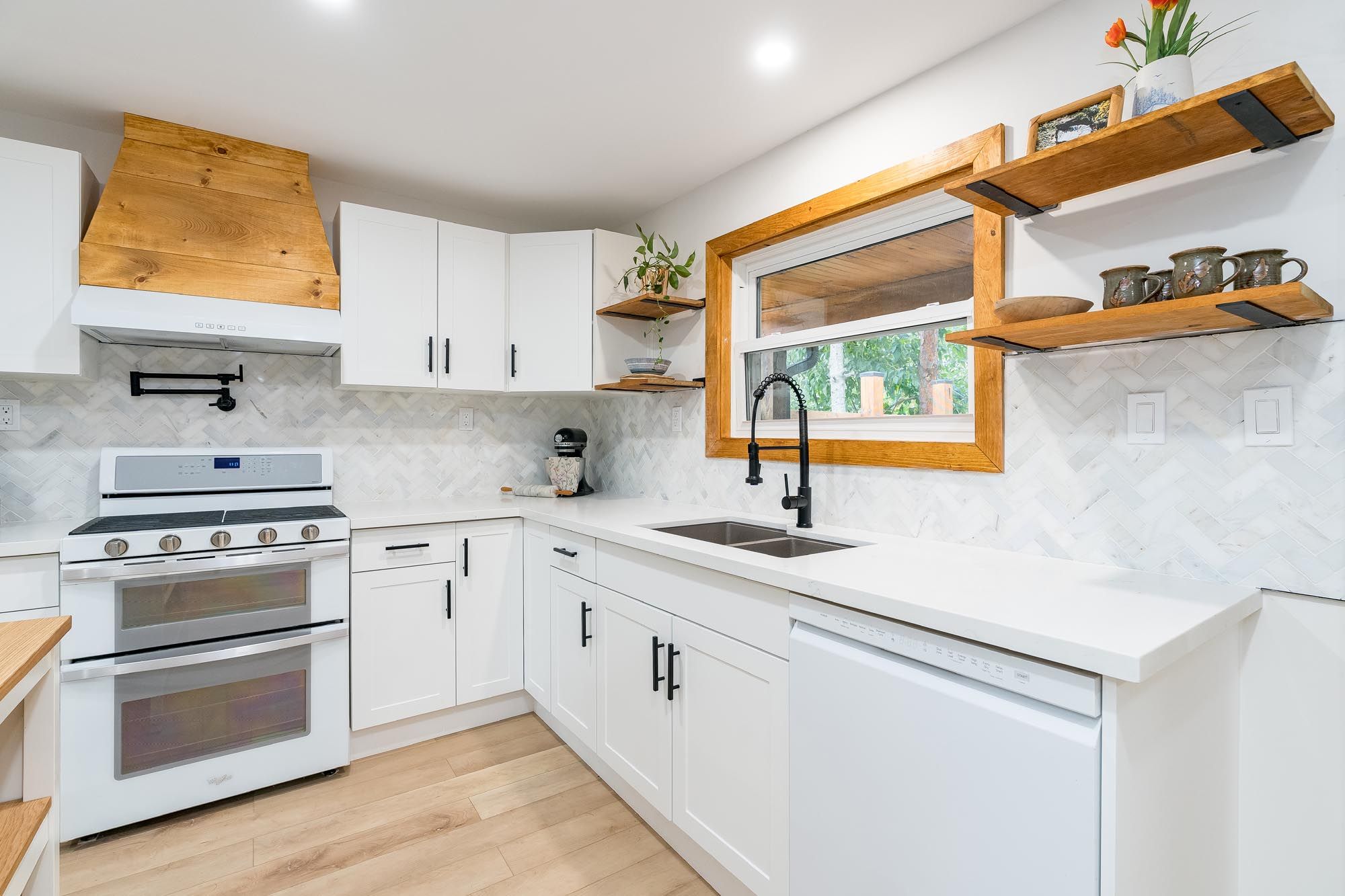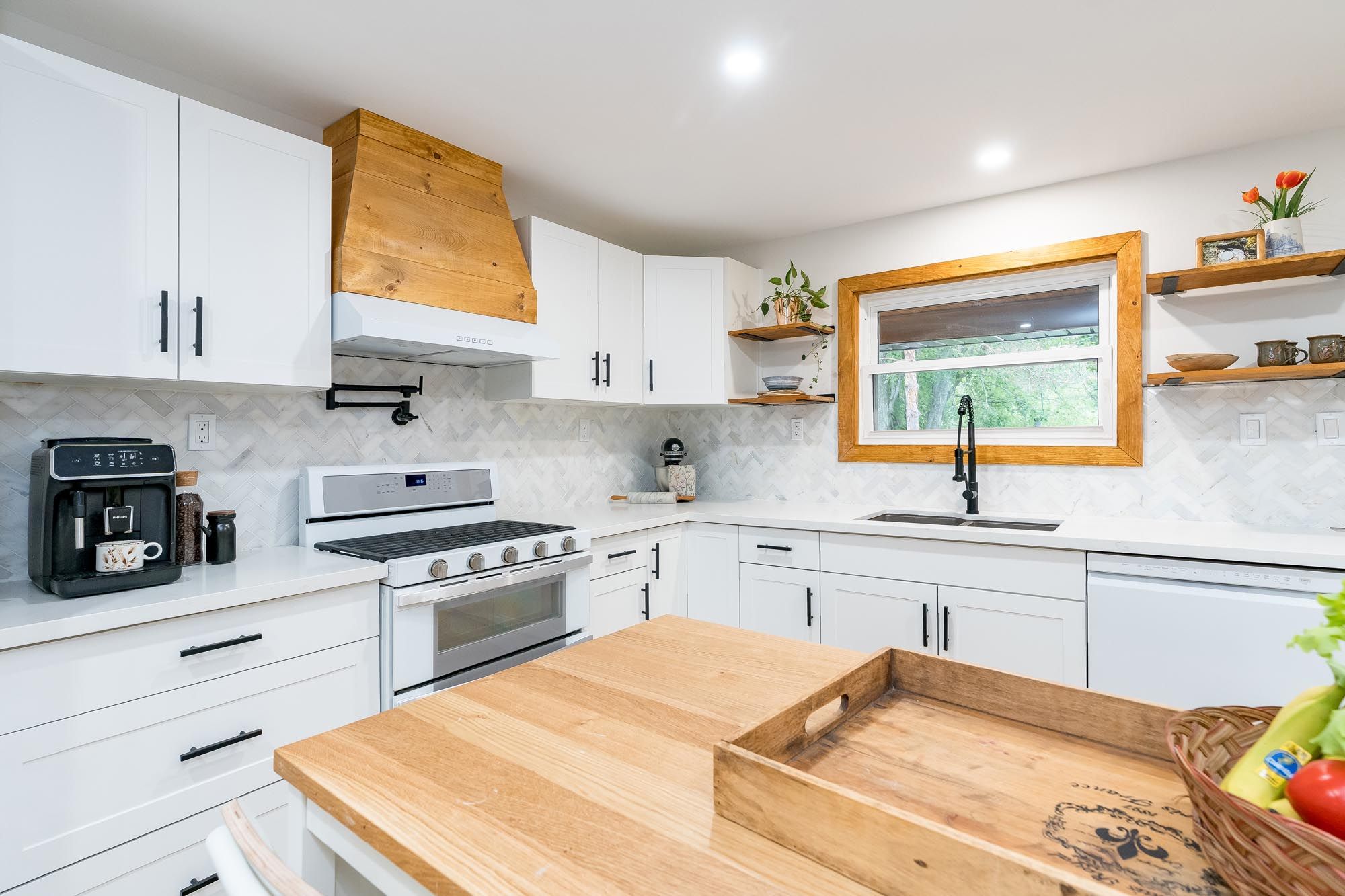 • Stylish kitchen with quartz countertops and a unique herringbone backsplash.