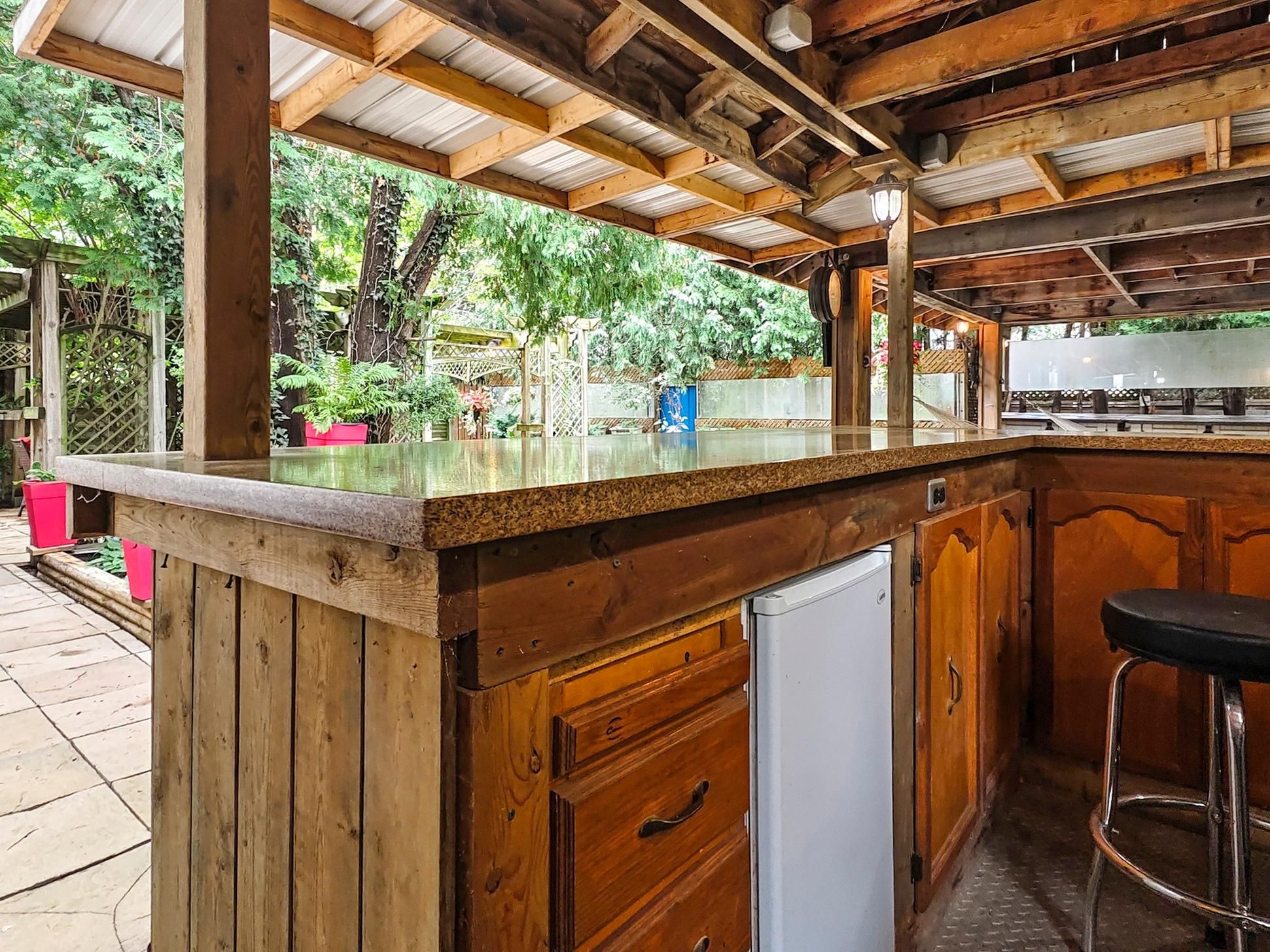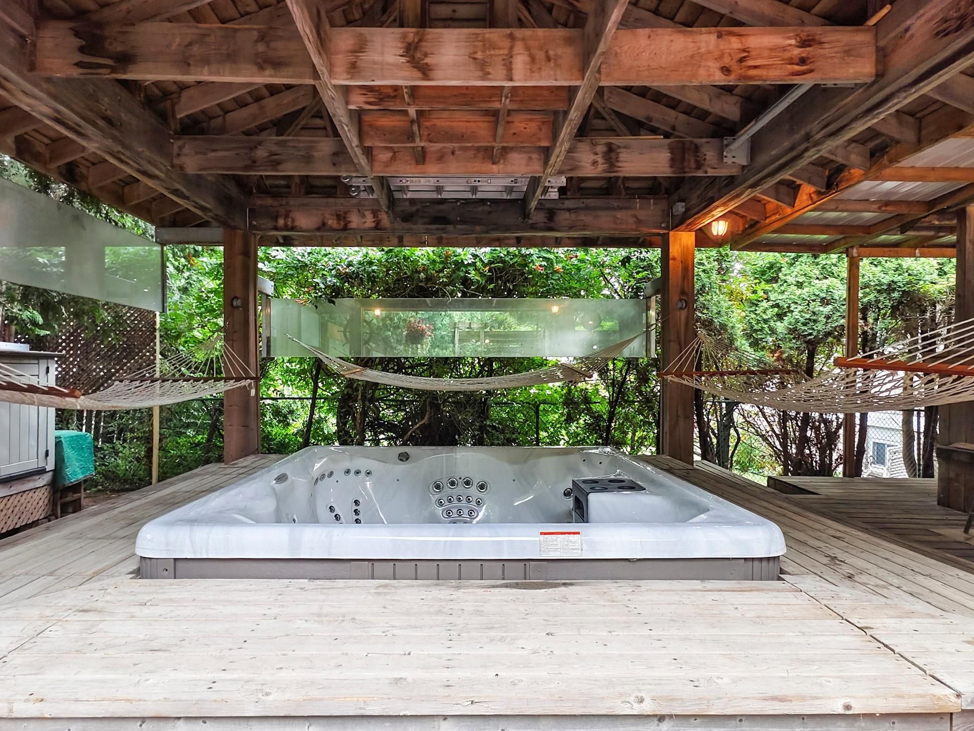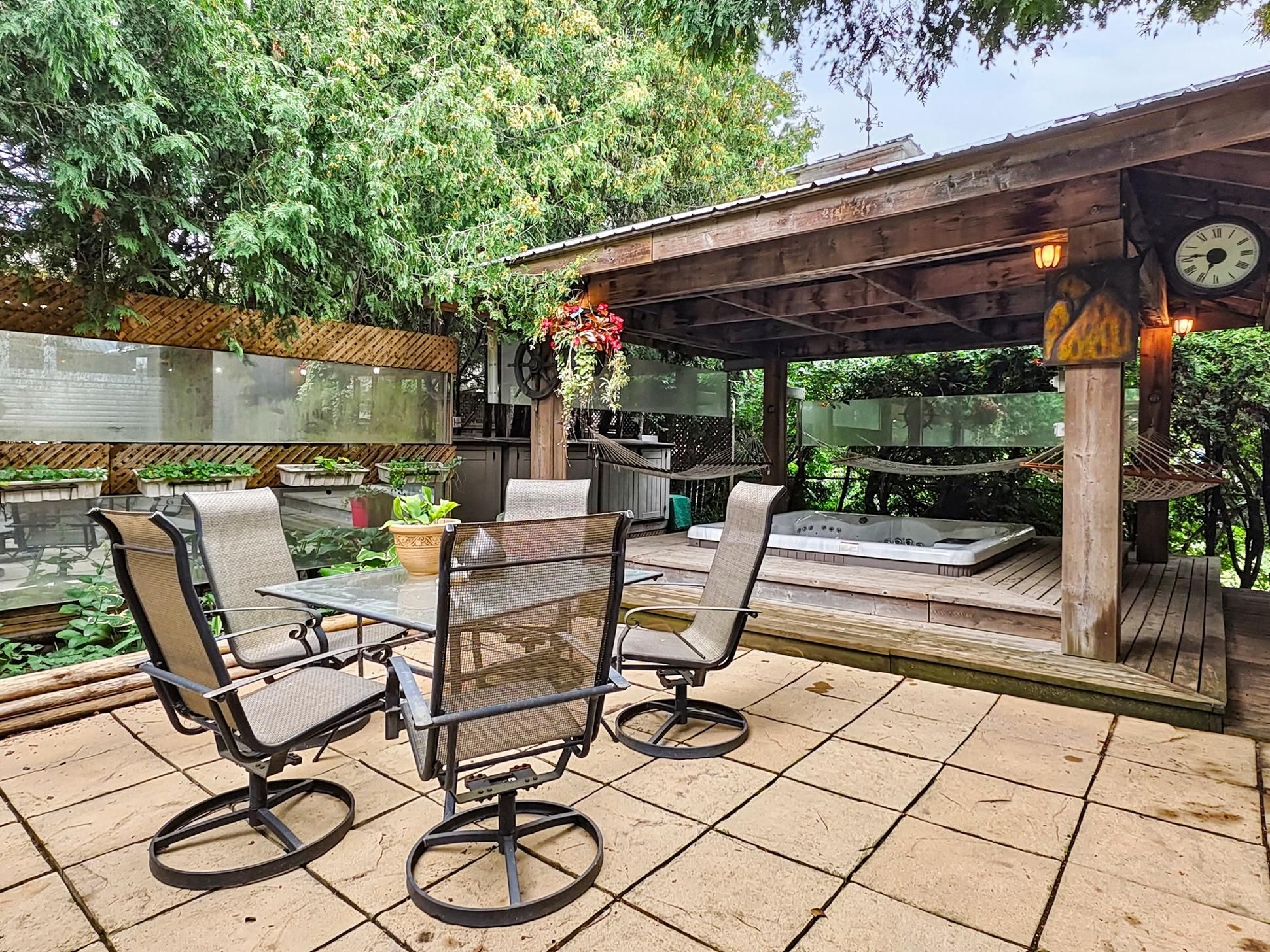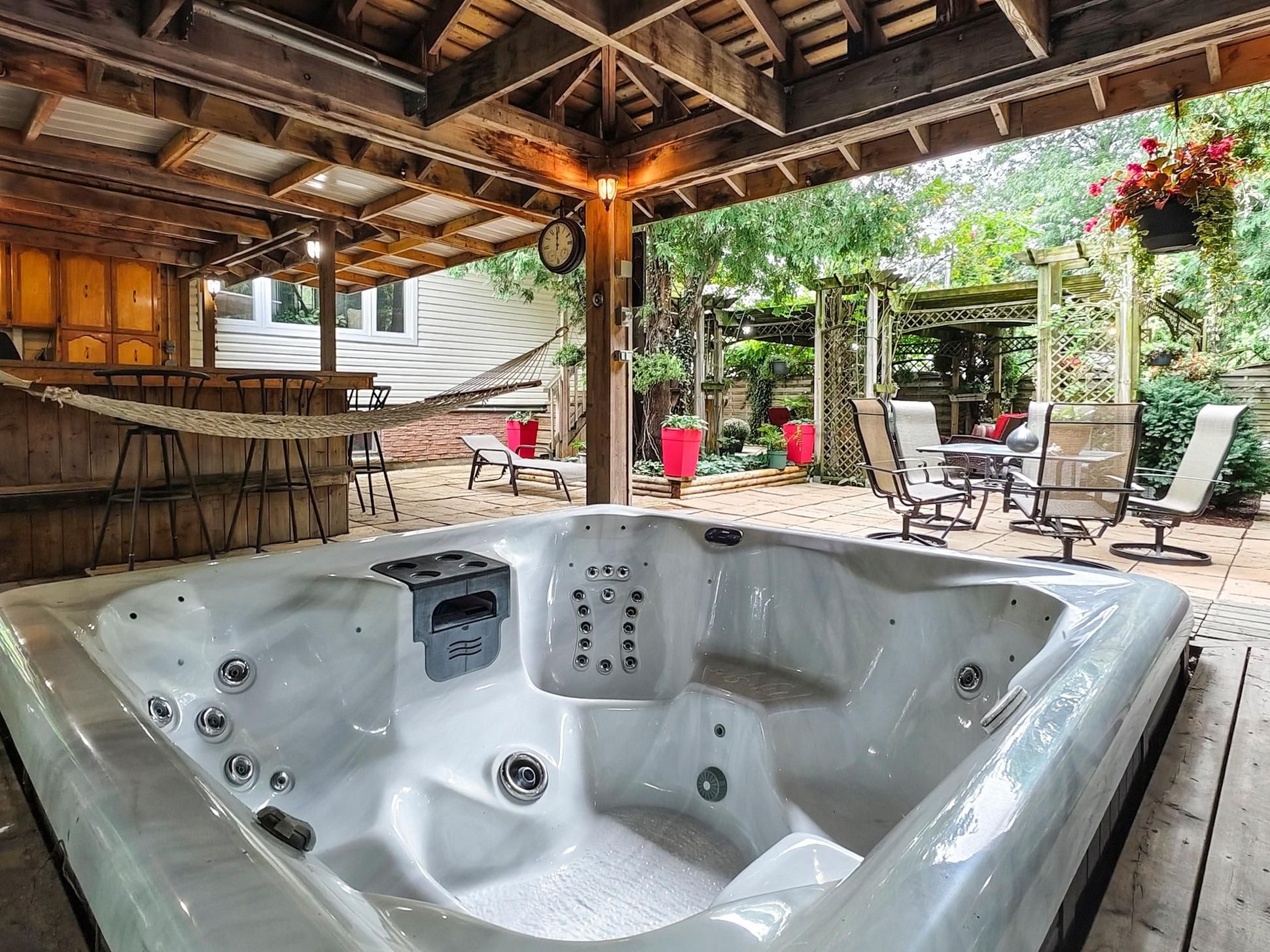 • Exceptional backyard with hot tub, outdoor kitchen, and mature trees.
