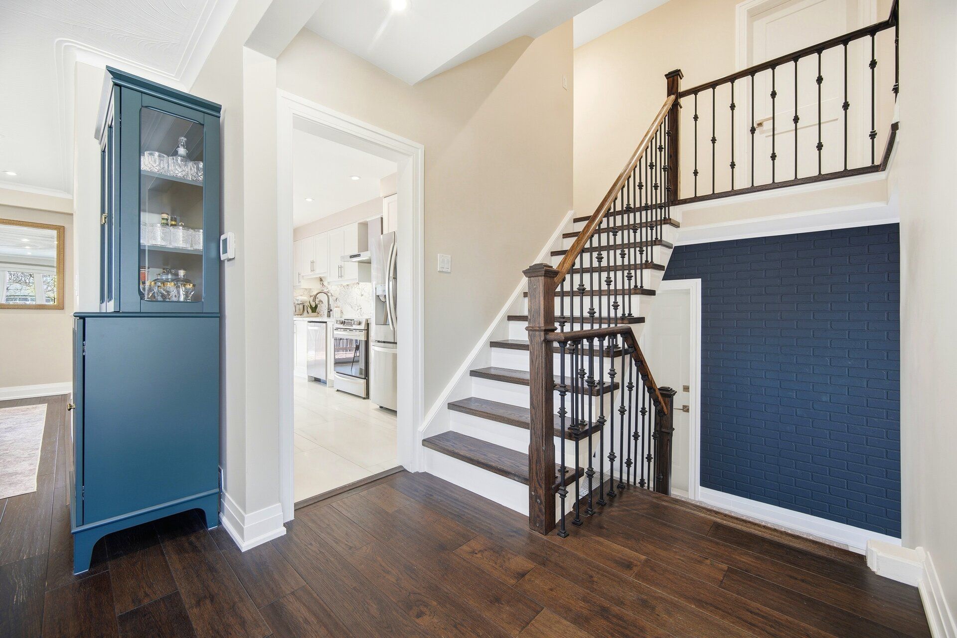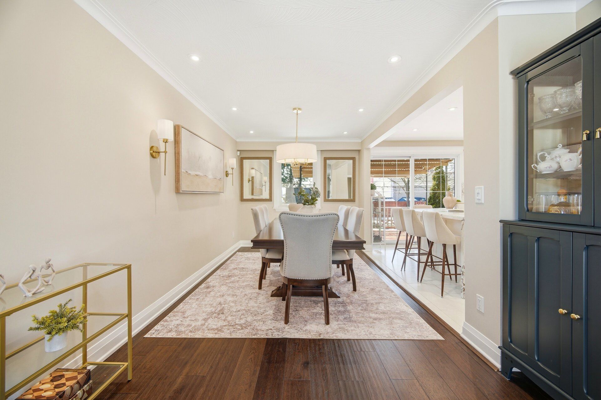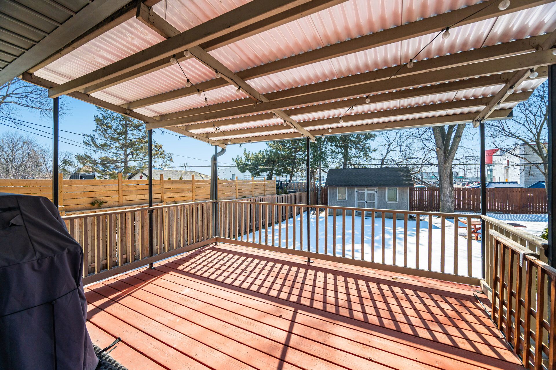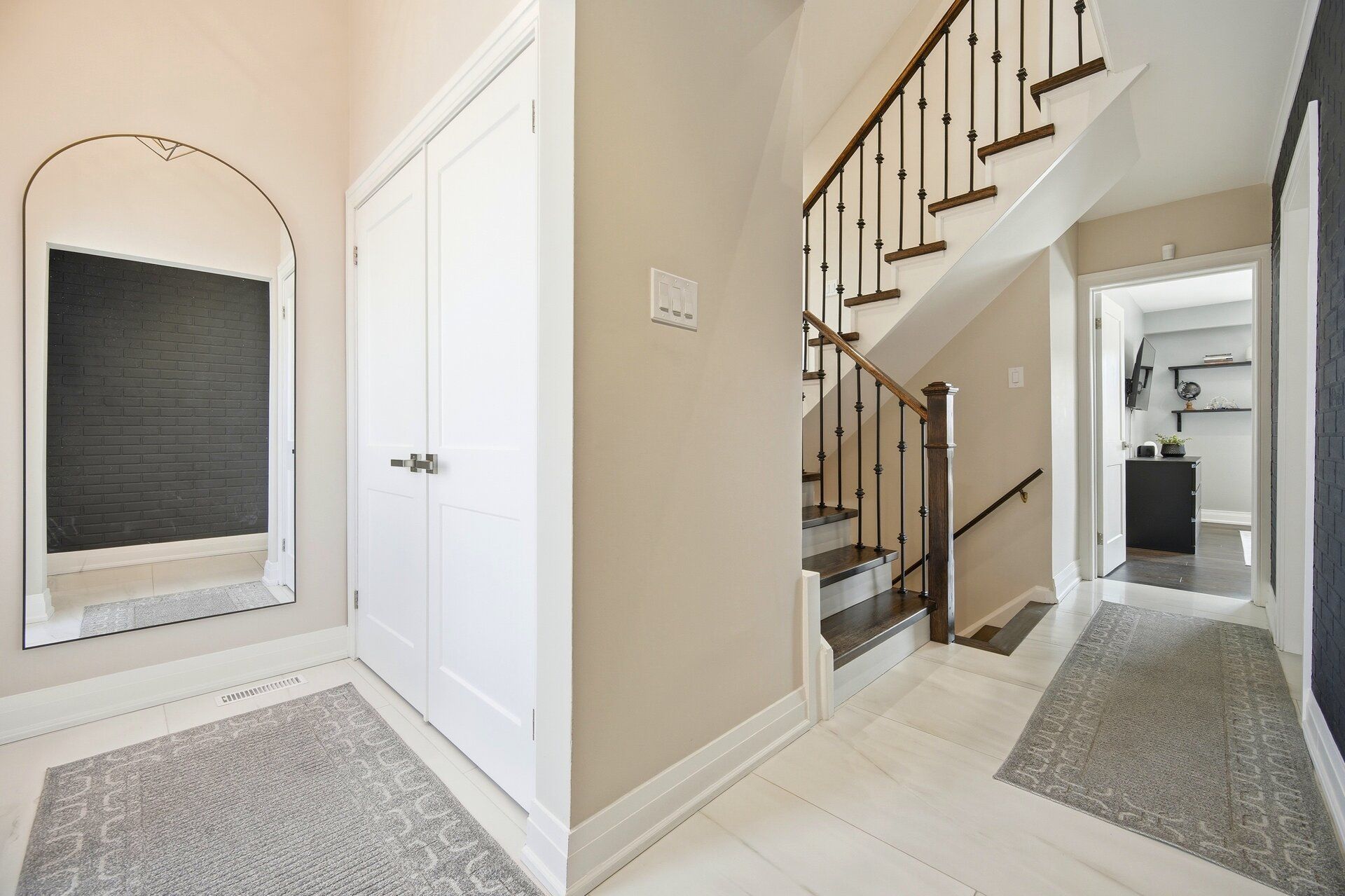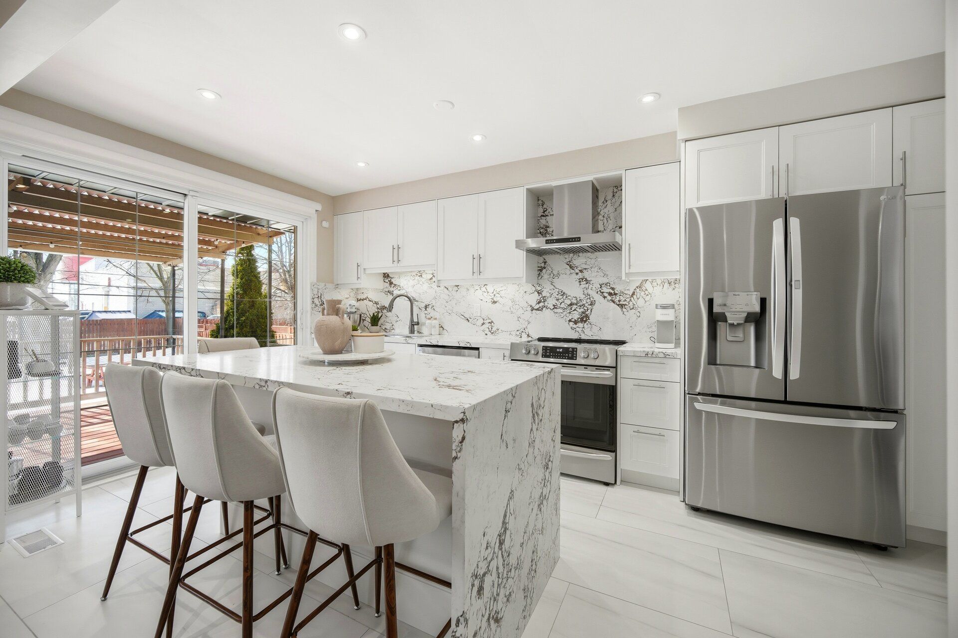 Where style meets comfort, this beautifully renovated 4-level sidesplit blends modern design with lasting quality. Featuring 4 bedrooms, 3 baths and a landscaped 150-ft lot, this home delivers space, function and sophistication in every detail. Inside you'll find imported italian porcelain tiles, engineered hardwood floors, chandelier lighting and inside access to an oversized garage with built-in shelving. The newly renovated kitchen shines with a quartz waterfall island, italian porcelain floors, pot lights, under-cabinet lighting and large sliding doors opening to a covered wood deck and private, treed backyard with no houses - perfect for relaxing or entertaining. The living and dining rooms offer crown moulding, oversized windows with remote blinds, potlights and upgraded lighting throughout. Upstairs the primary bedroom overlooks the backyard and features electronic blackout blinds, alongside two additional bedrooms and a stunning3-piece bath finished in blue italian porcelain with a mosaic shower floor and glass enclosure. The lower level is designed for everyday living and entertaining, featuring a custom laundry room with quartz counters and cabinetry, plus an incredible home theatre with a 100-inchprojection screen, smart projector, included l-shaped seating and ambient lighting. A new3-piece bath adds even more convenience and style. Major updates include new aluminum garage door, furnace, ac, roof, windows, doors, plumbing, hvac and smart home security. Freshly painted and move-in ready - offering luxury, efficiency and peace of mind. Located close to transit, highways, schools and all amenities. Click virtual tour!