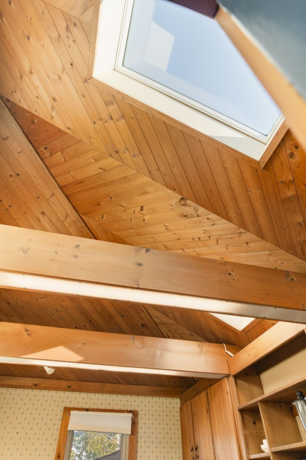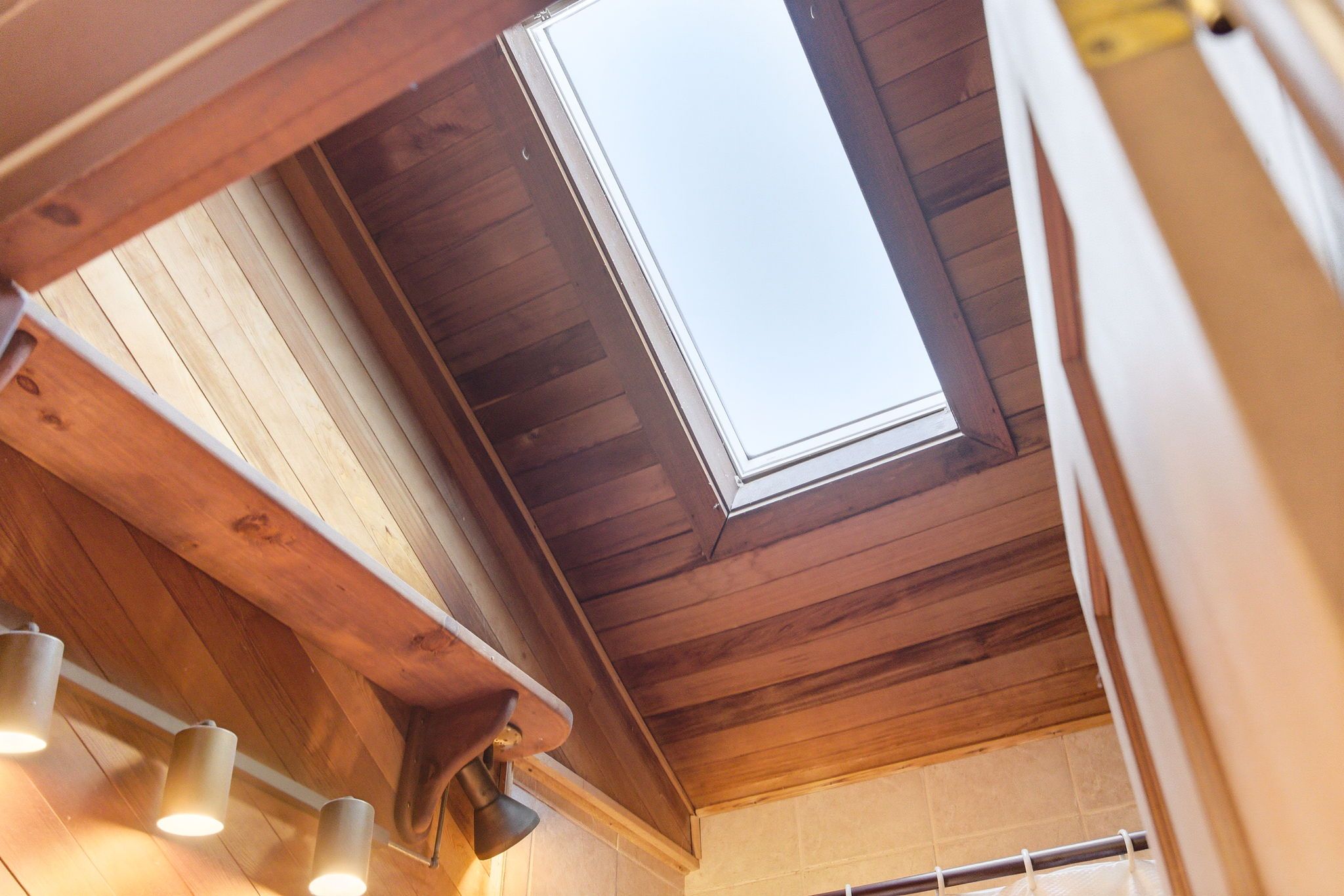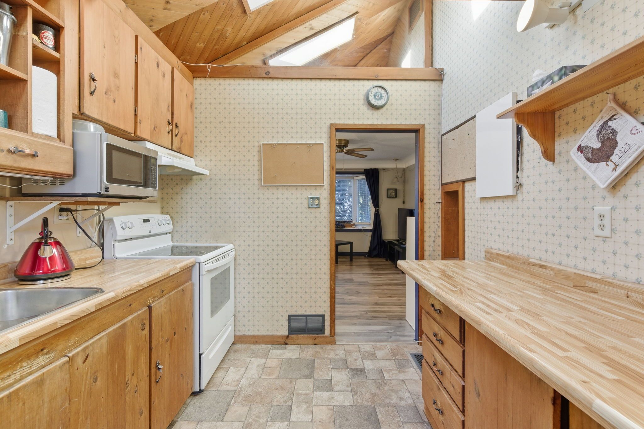 • Cozy kitchen with vaulted ceilings and skylights for plenty of natural light.