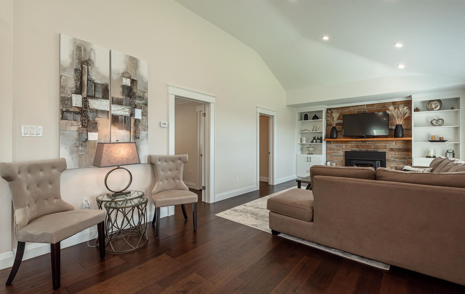 • Inviting living room with a wood-burning fireplace and custom built-ins.