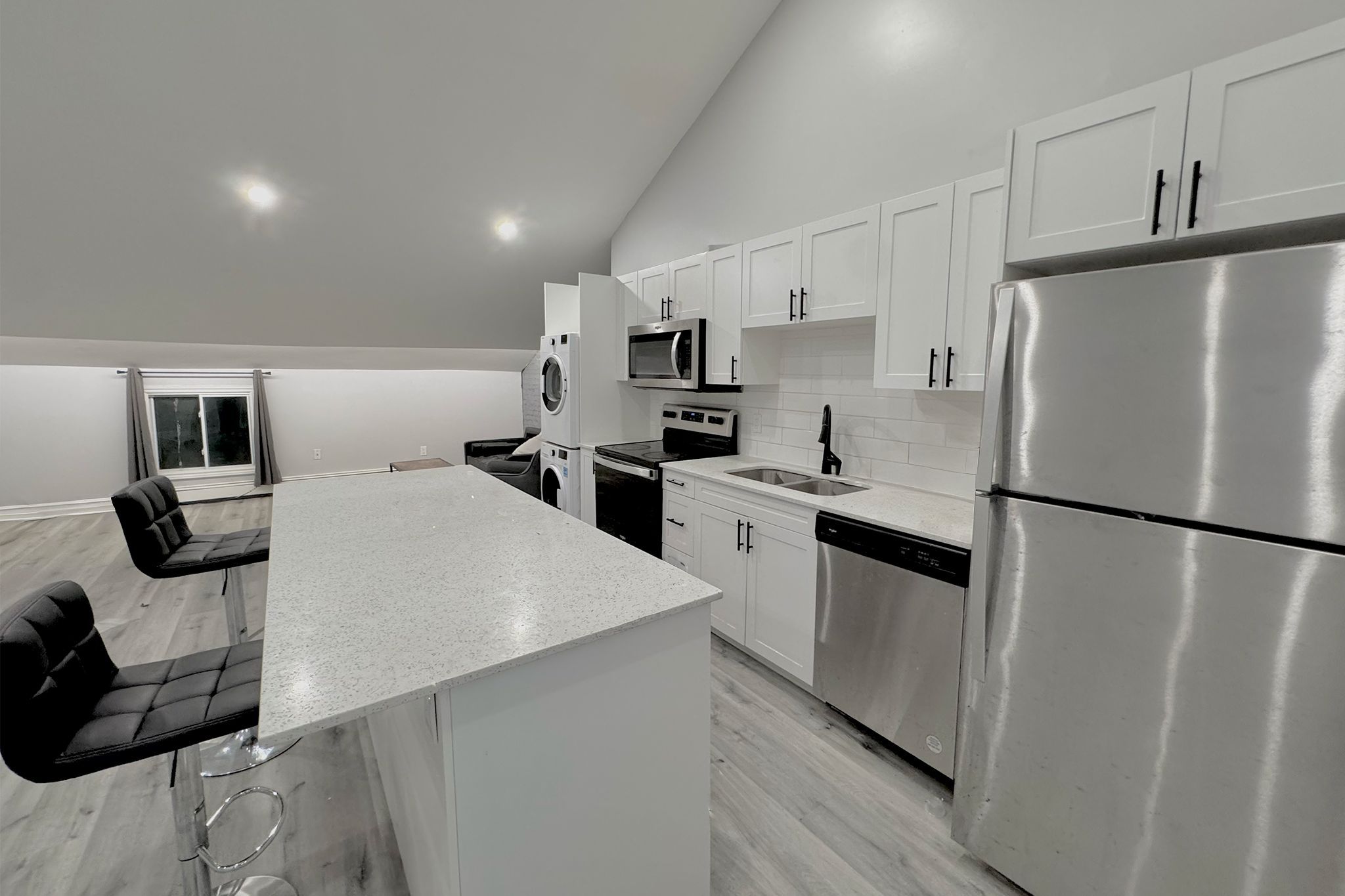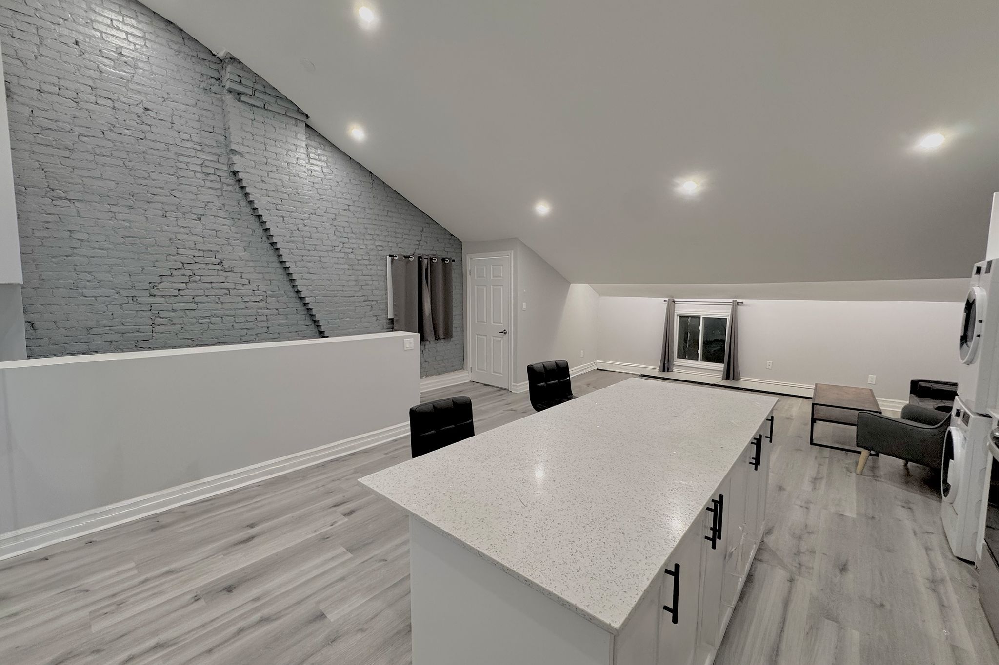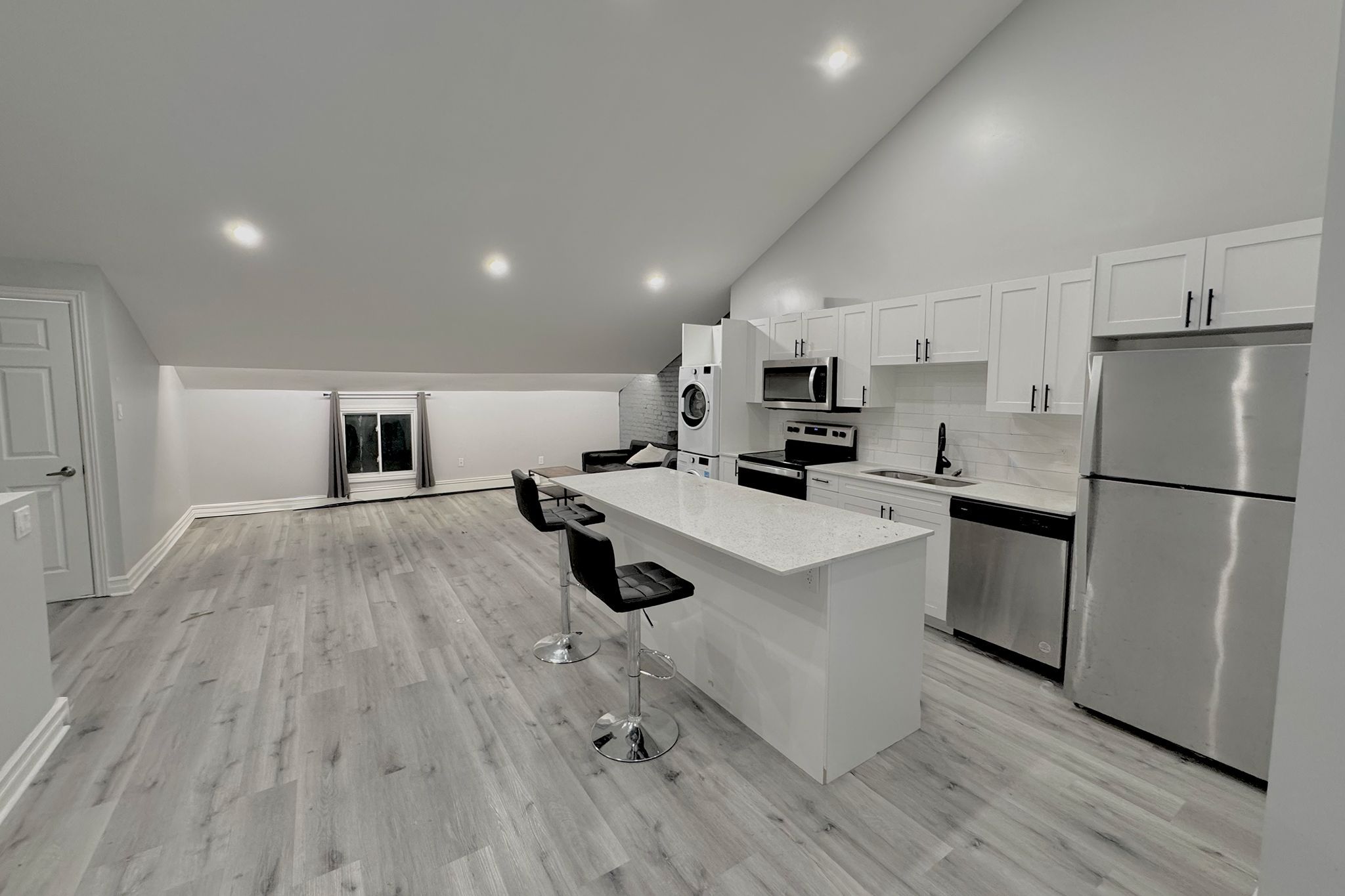 Fully renovated penthouse style apartment offering modern all-inclusive living in the heart of downtown st. Thomas. This top-floor 2-bedroom, 1-bath unit in a 3-storey walk-up features soaring vaulted ceilings over 20 feet in areas, creating an incredible sense of space and light. The open-concept layout is highlighted by a sleek kitchen with a large quartz island and stainless steel appliances, including a dishwasher and over-the-range microwave. Spacious bedrooms, large closets and updated lighting. Generous living and dining areas make it perfect for entertaining, while in-unit laundry adds everyday convenience. One off-site parking space included. Tenant to install ac unit if needed. Advertised price already includes a $100/m discount for 1 year only.