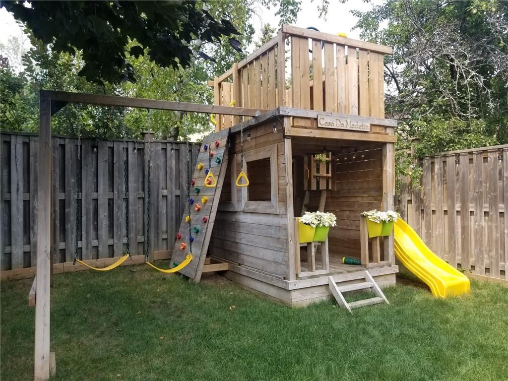 • Private backyard with fireplace, open pergola, and play structure.