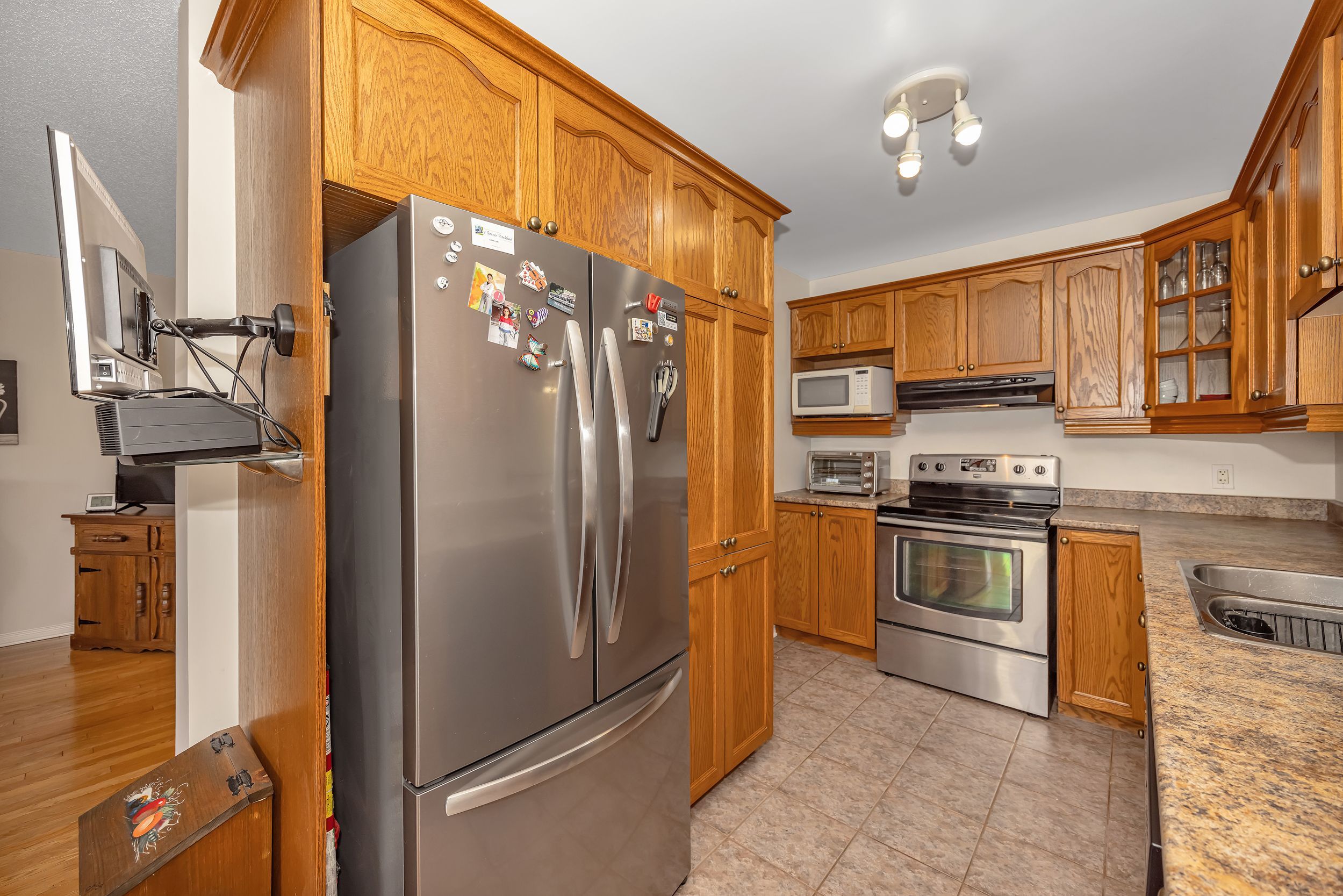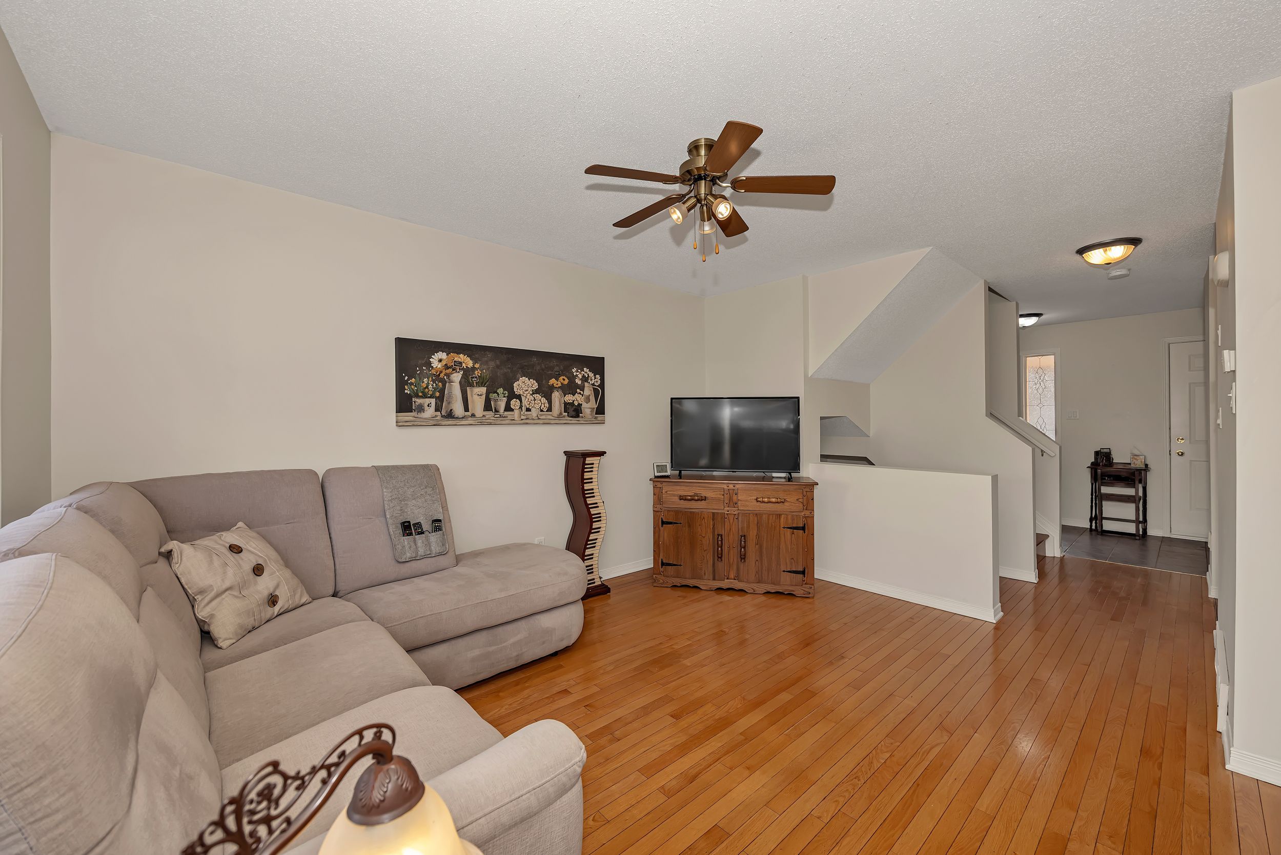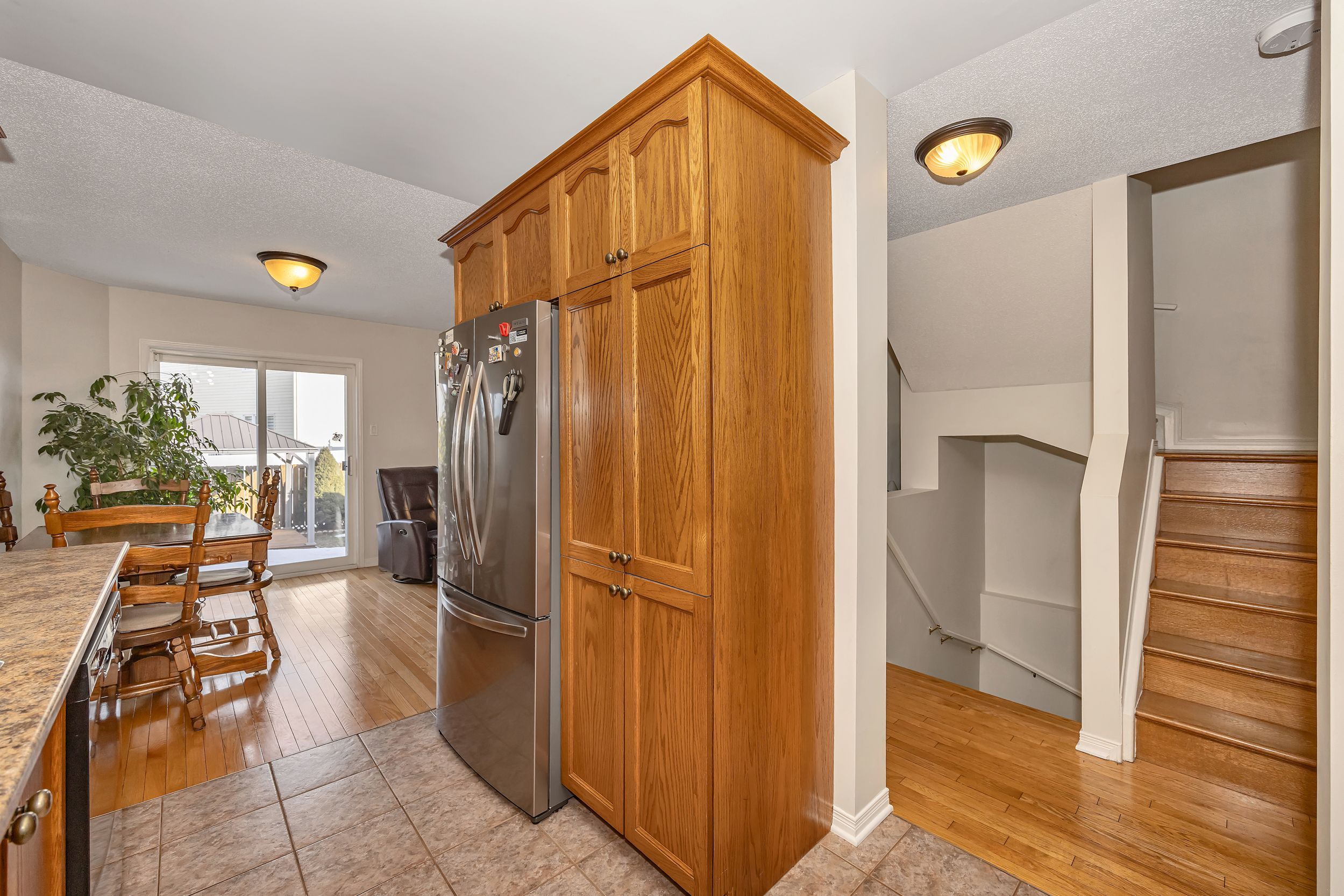 • Open-concept main floor with hardwood and ceramic flooring.