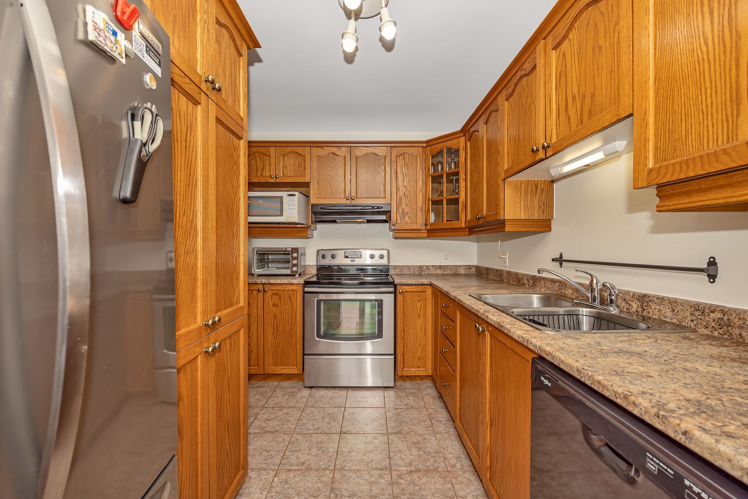 • Spacious living area and well-appointed kitchen with stainless steel appliances.