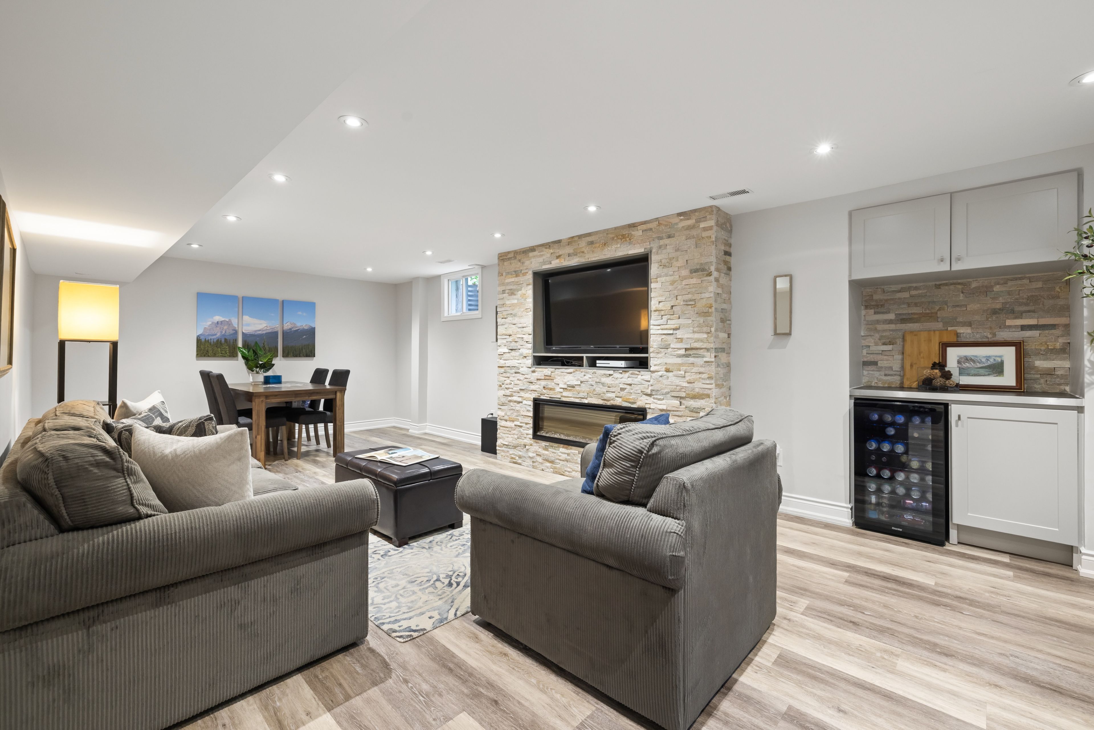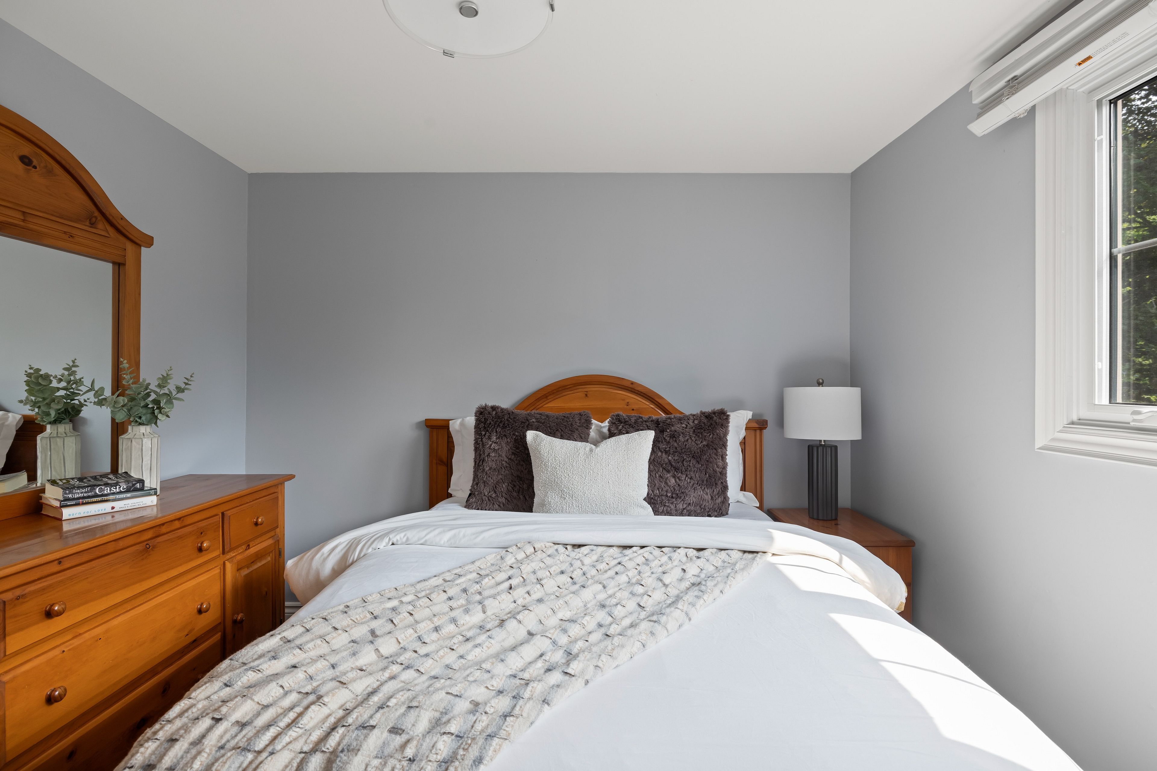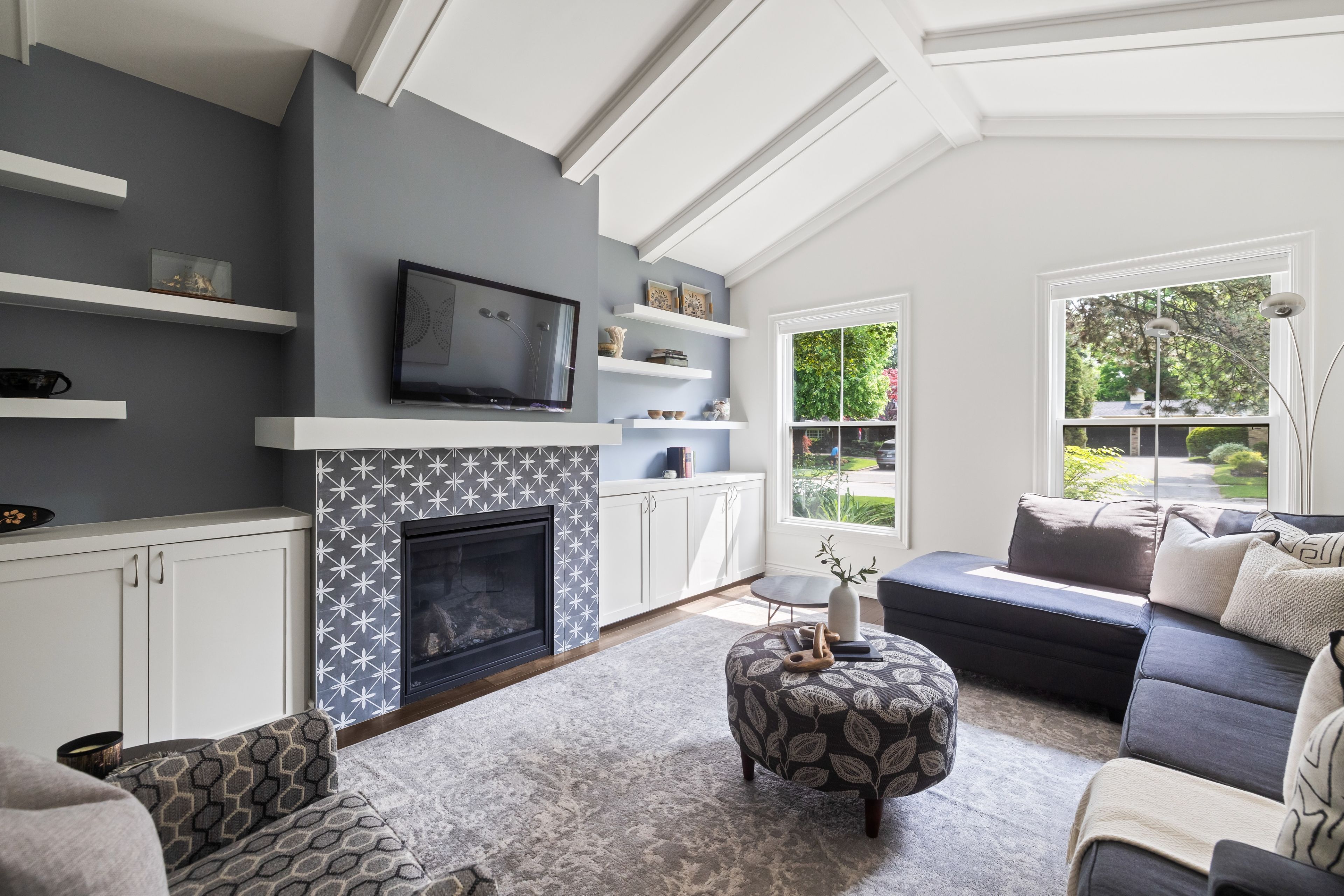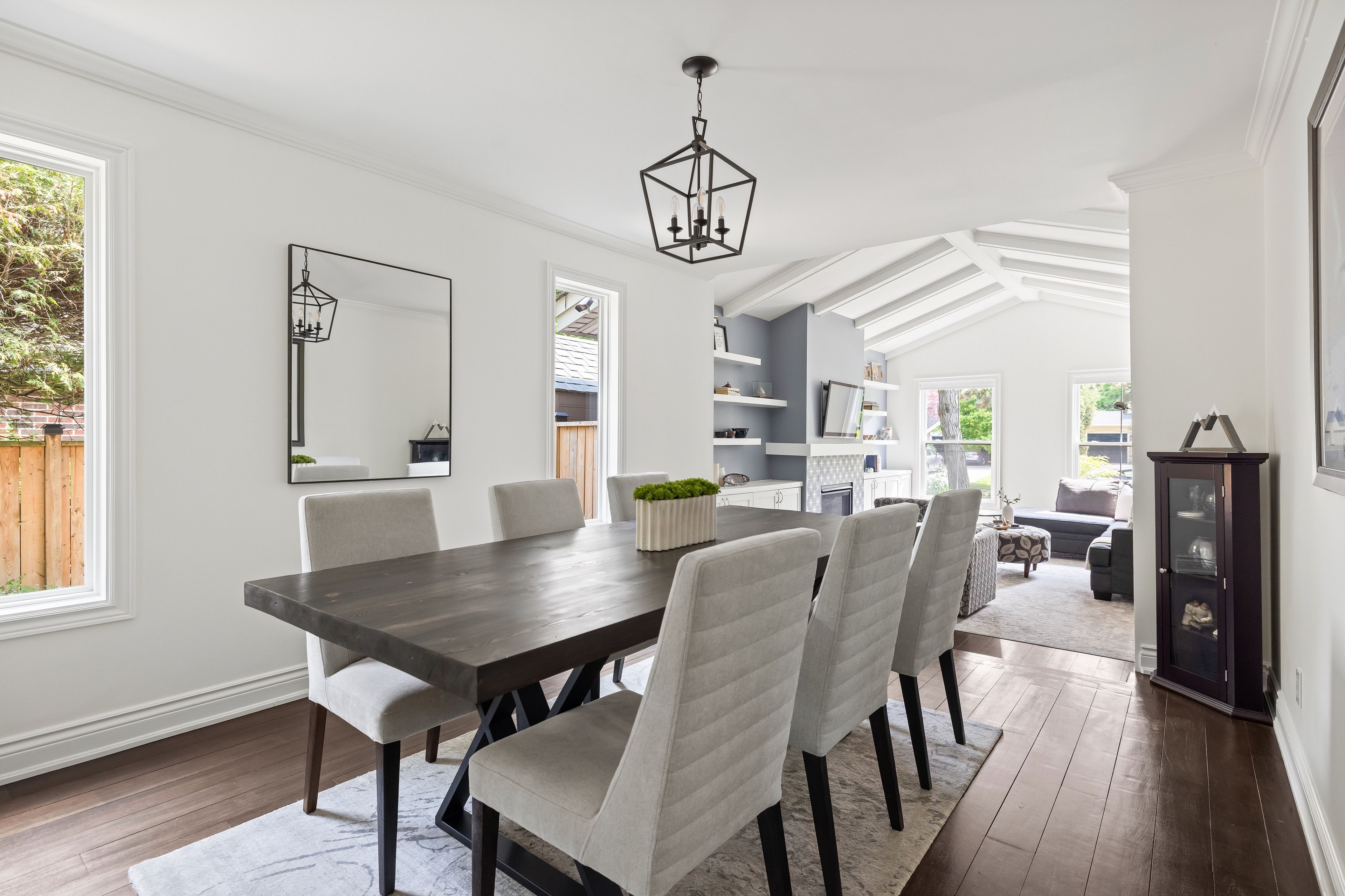 • Bright, carpet-free interior with natural light and vaulted ceilings in the living room.