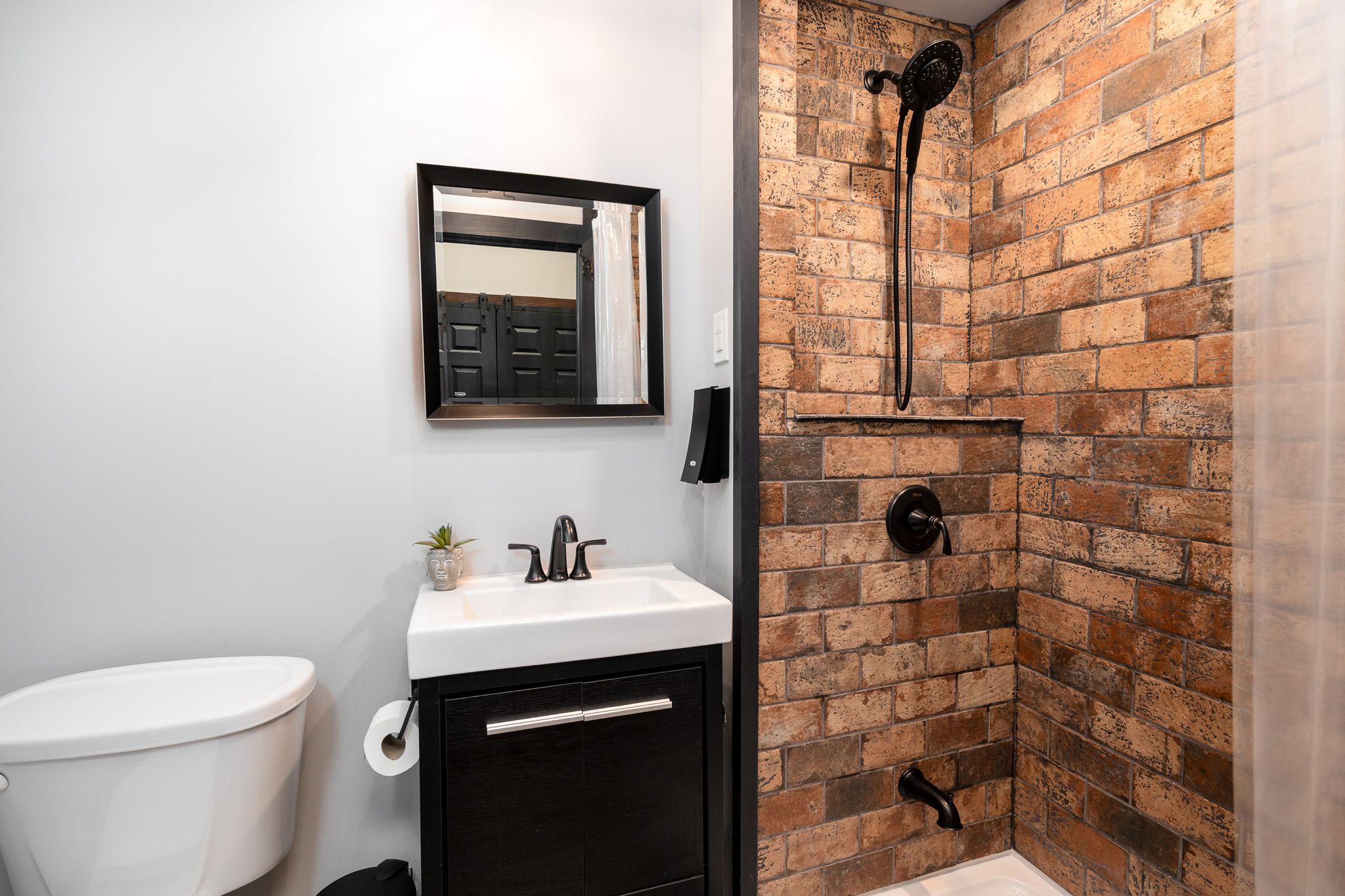 • Stylish two-level residential loft featuring exposed brick and modern finishes.