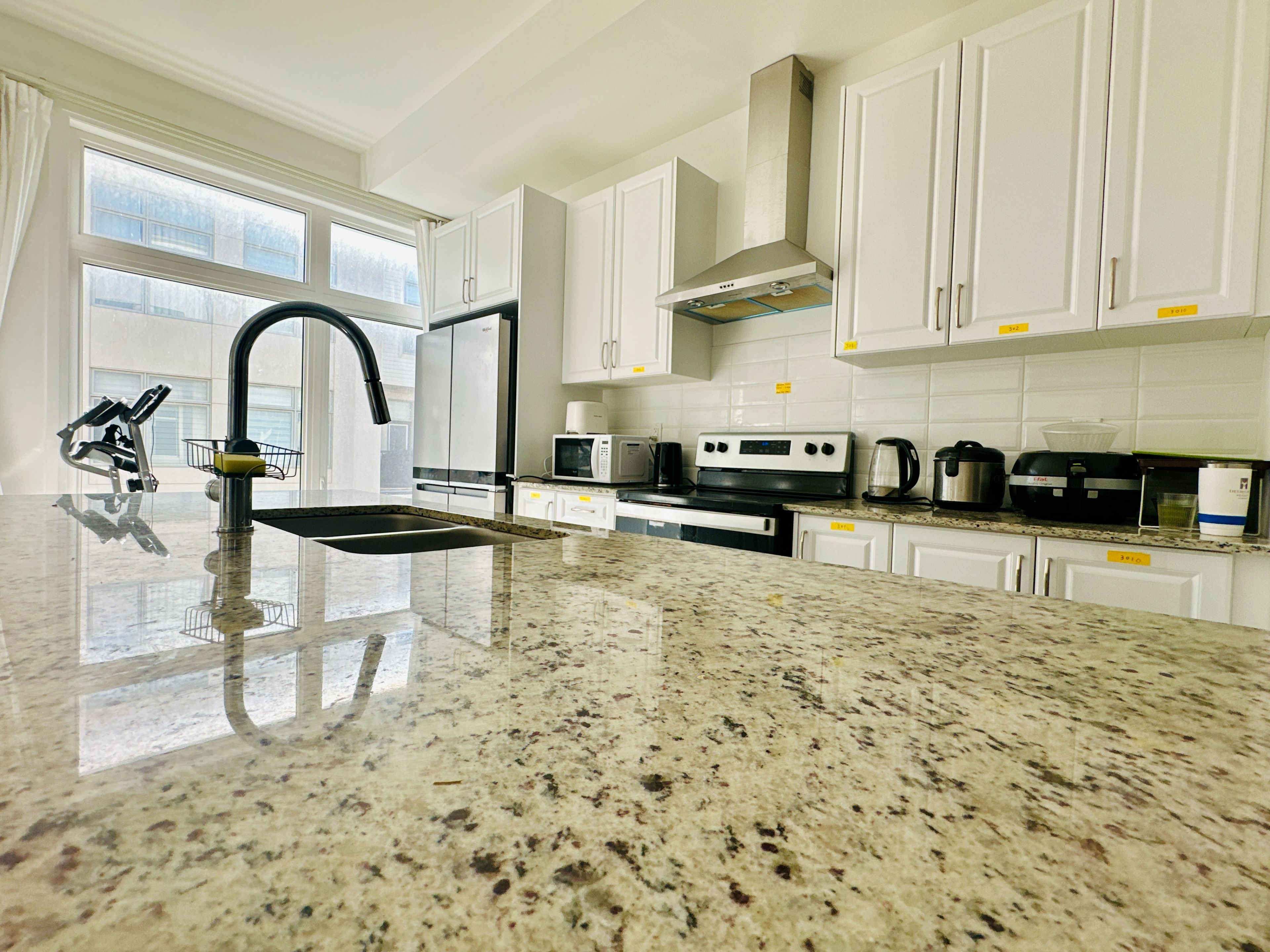 • Upgraded gourmet kitchen featuring granite counters and a center island.