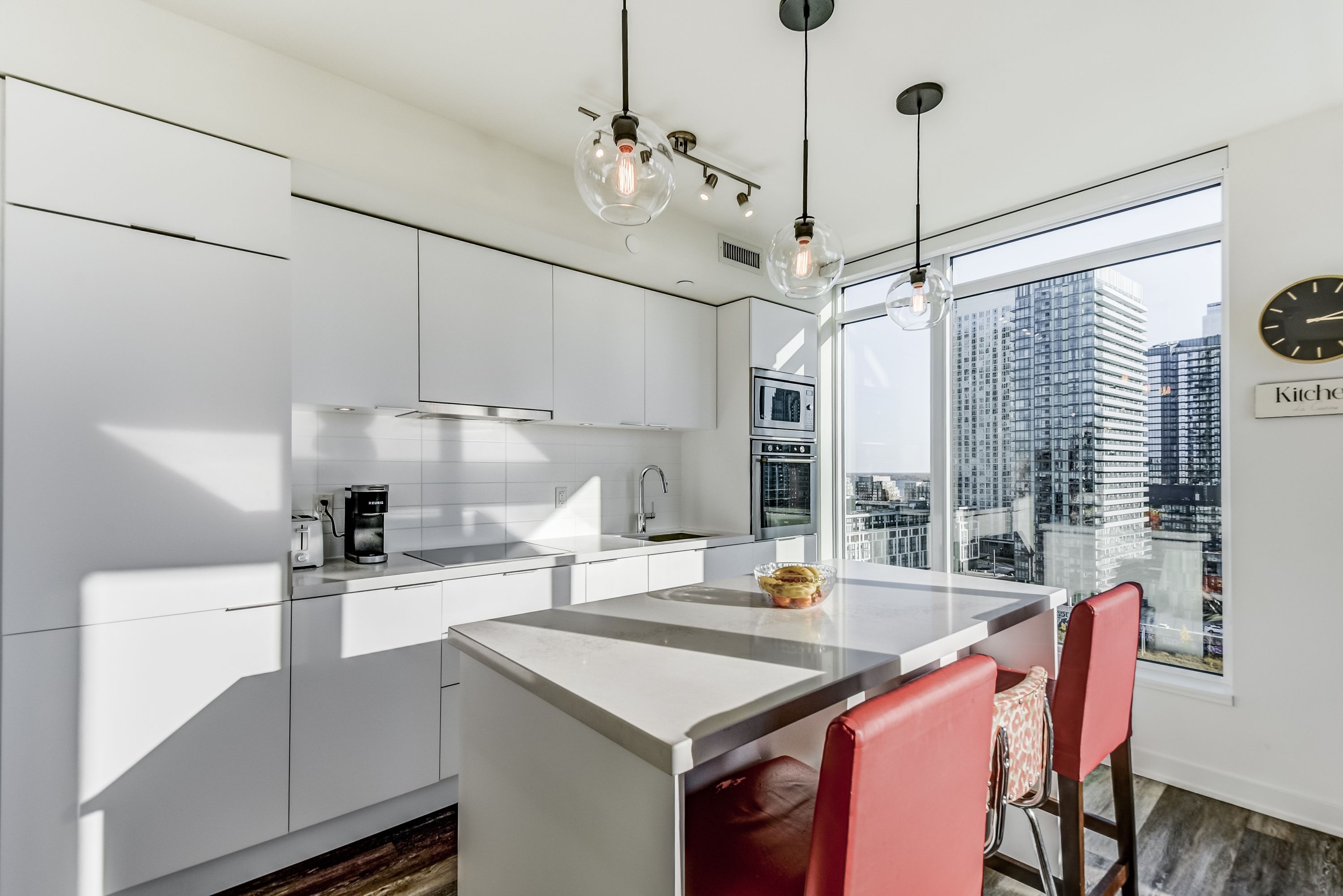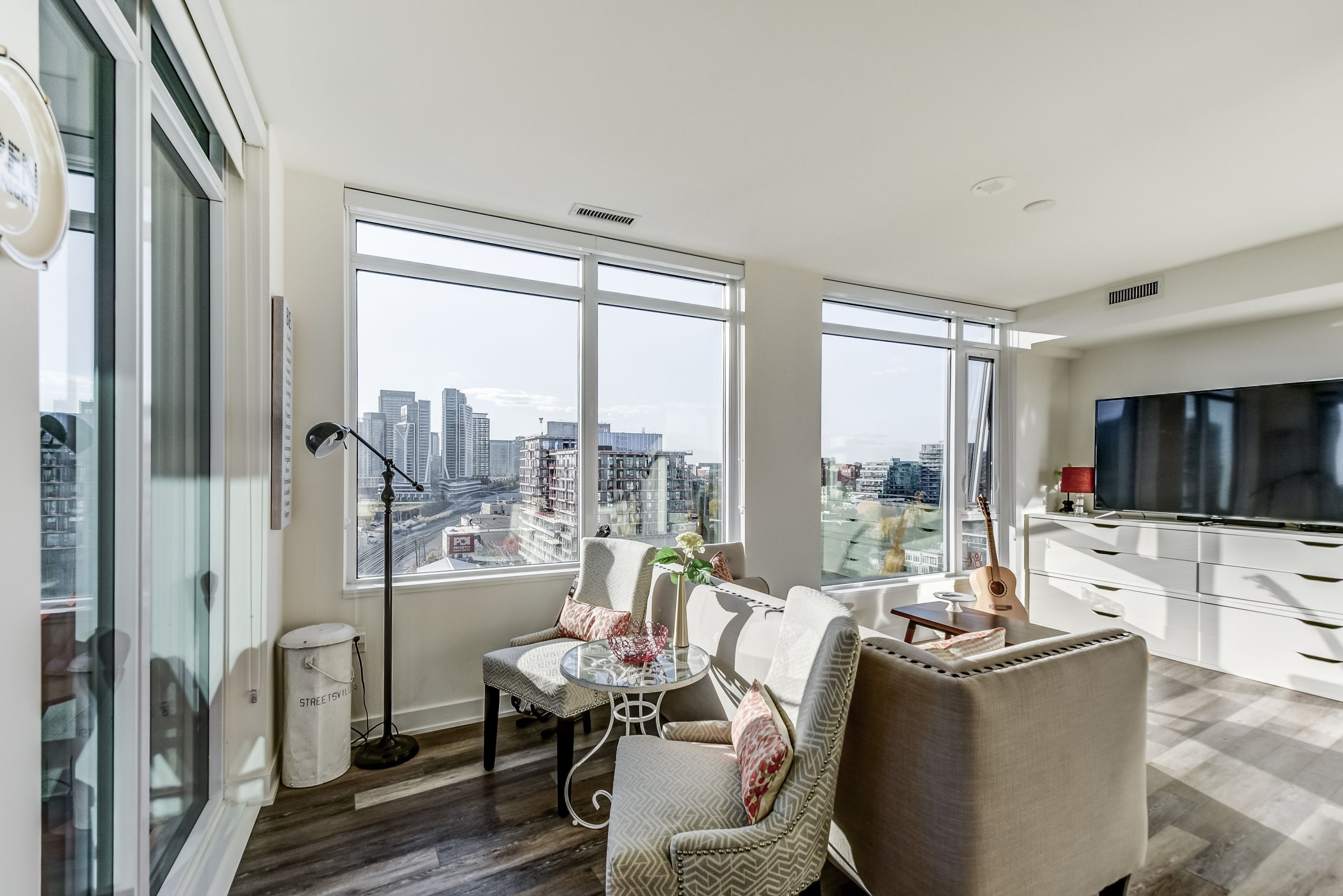 Immaculate large corner unit with spectacular views! This luxury executive rental is located in the desirable minto westside king west condos. Natural light pours in the large windows on both sides. Lovely open concept space, upscale modern kitchen with island, b/i appliances overlooking the living and dining area. Great primary bedroom with full ensuite, double vanity sinks and walk in closet. 2 full baths. Den can be dining area or office. It can also be converted back to a separate bedroom. 5 star amenities in this building. A most vibrant to community with top restaurants, farm boy, stacktmarket, the well waterworks food hall. Easy access to great trails, parks and the waterfront.
