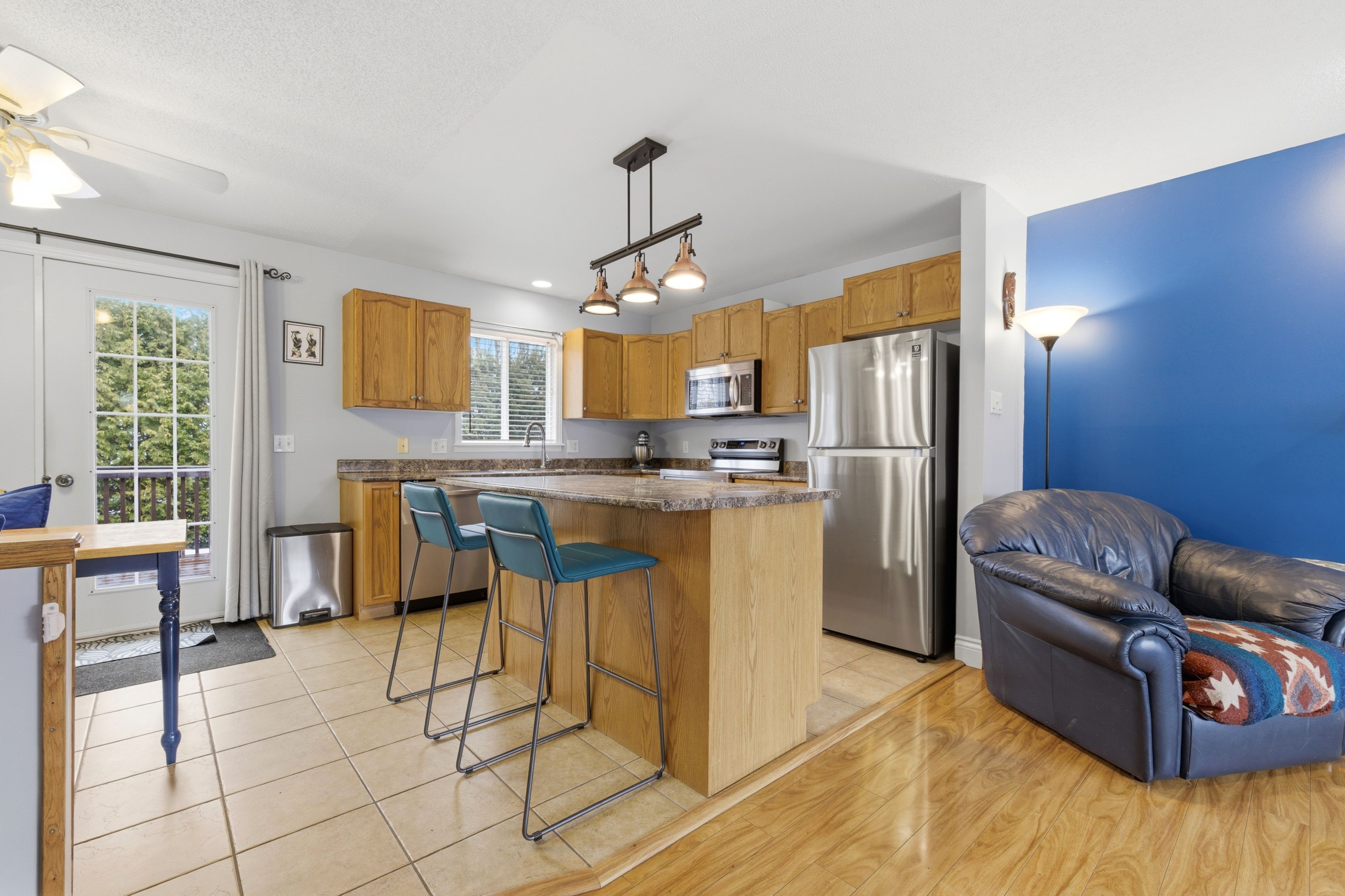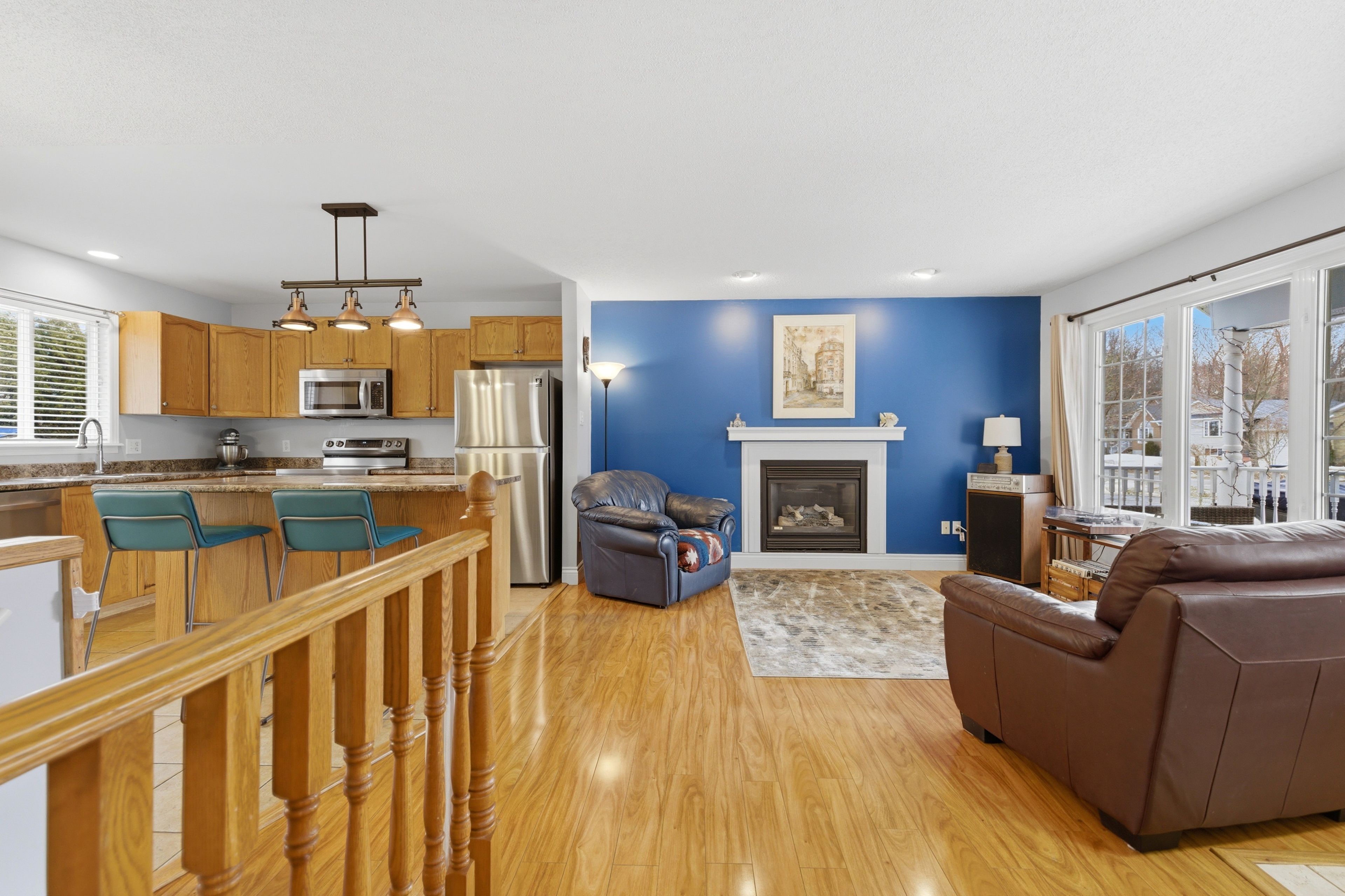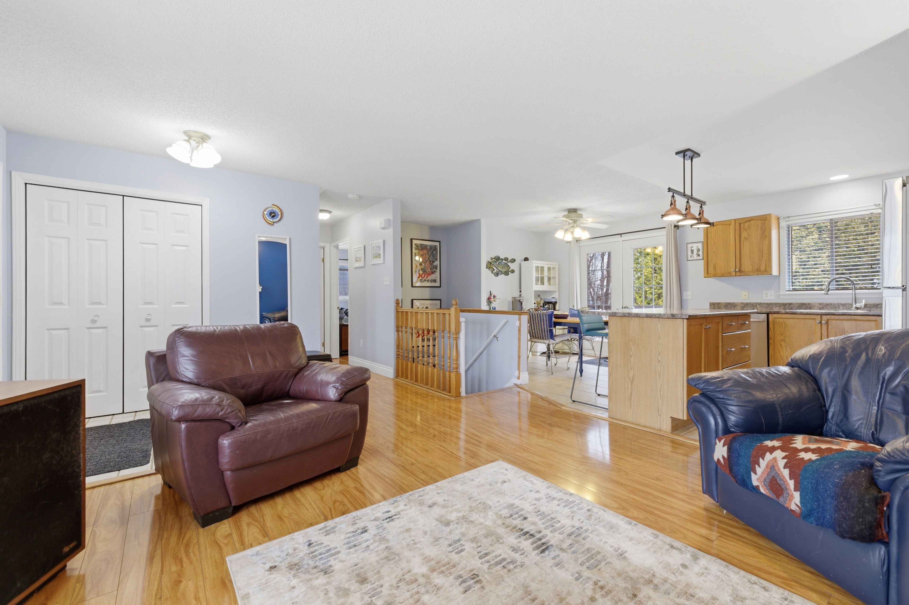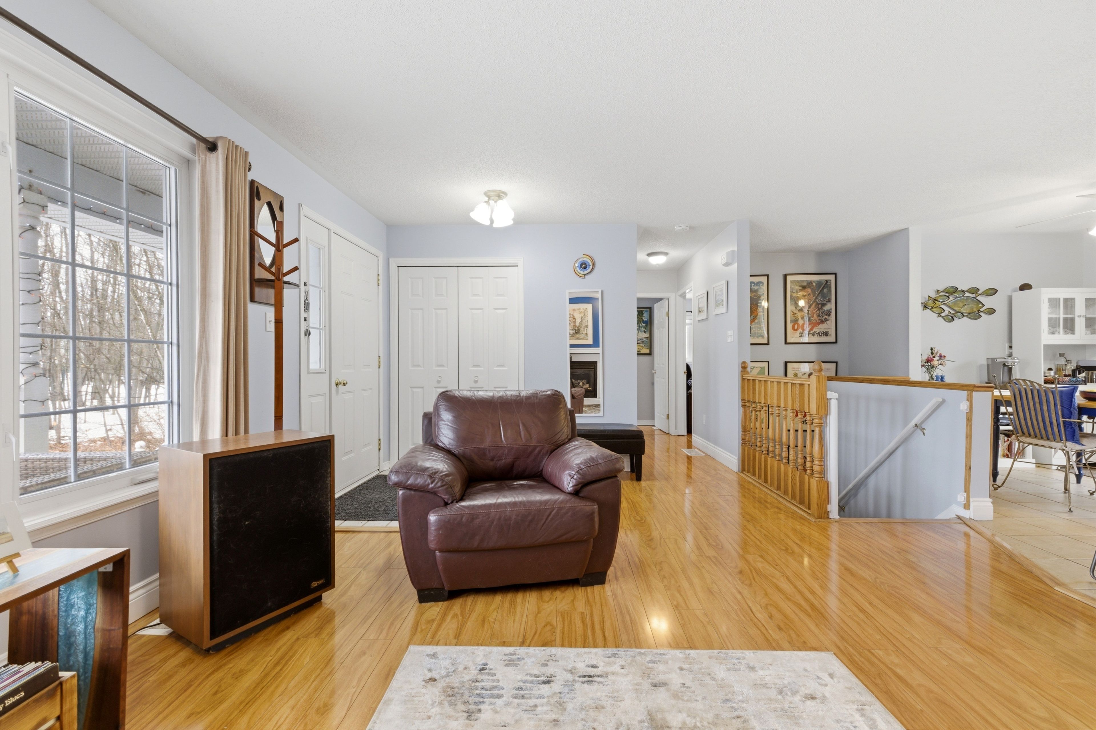 • Bright and clean interior with natural light and warm flooring.