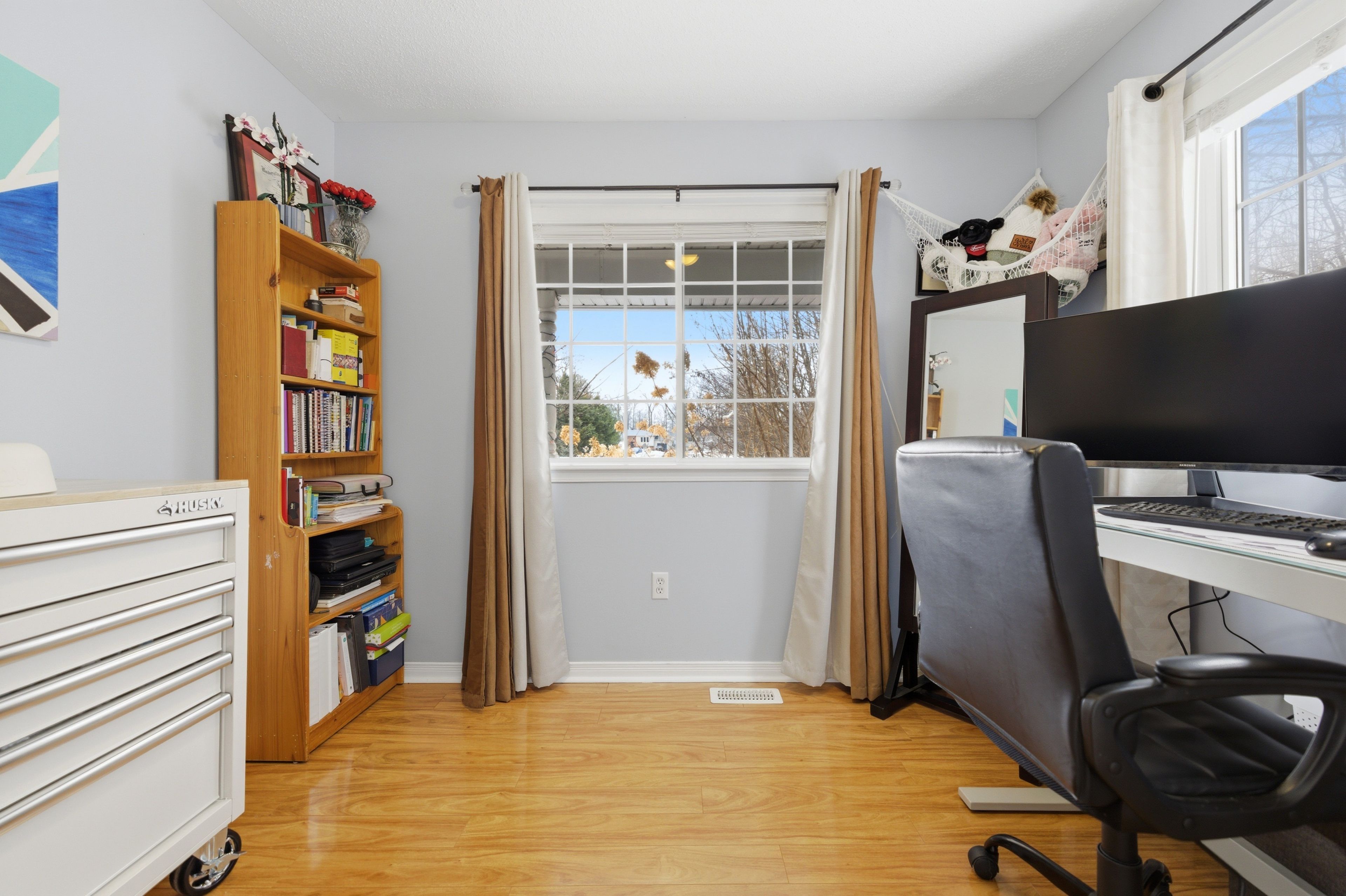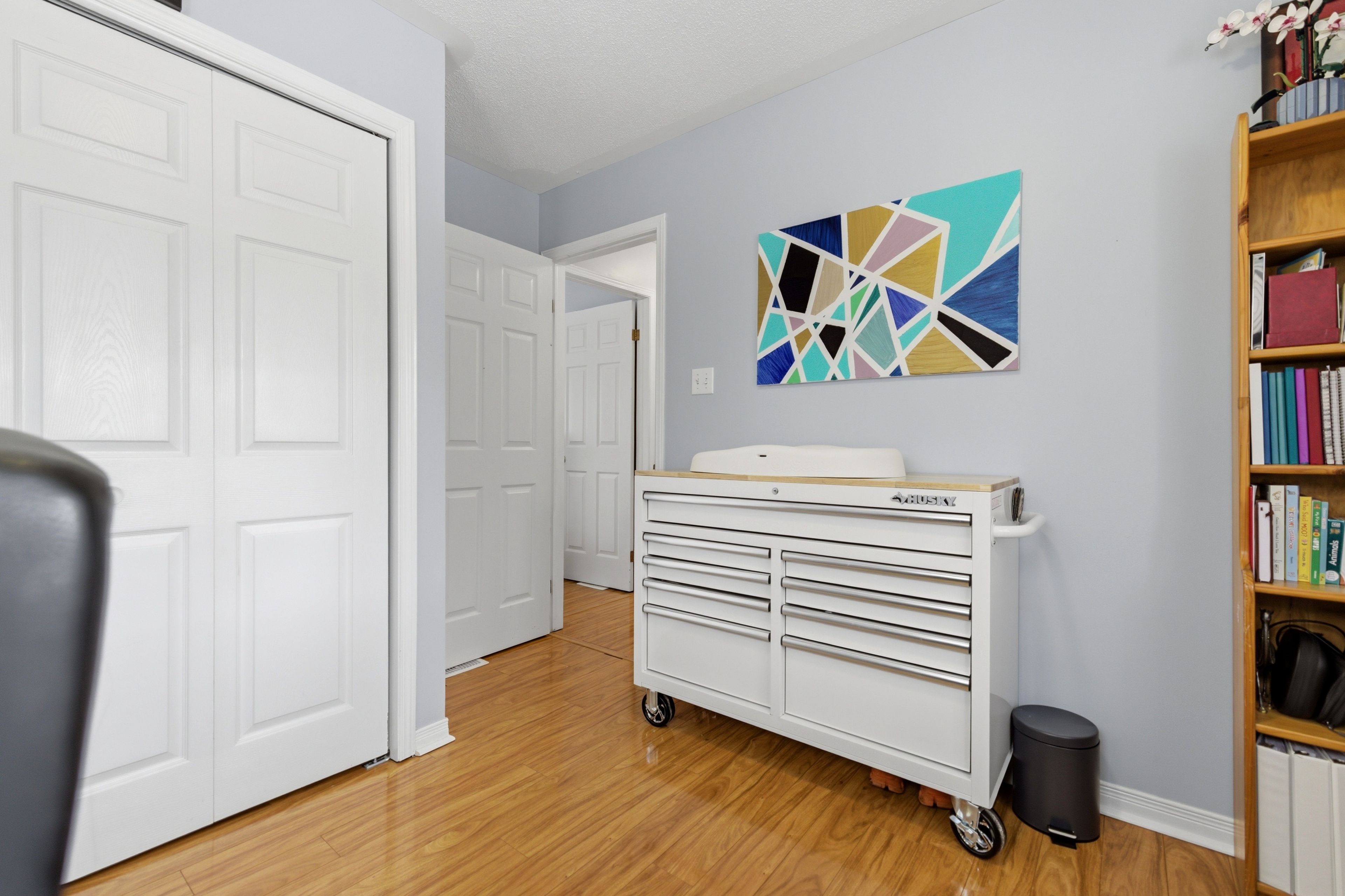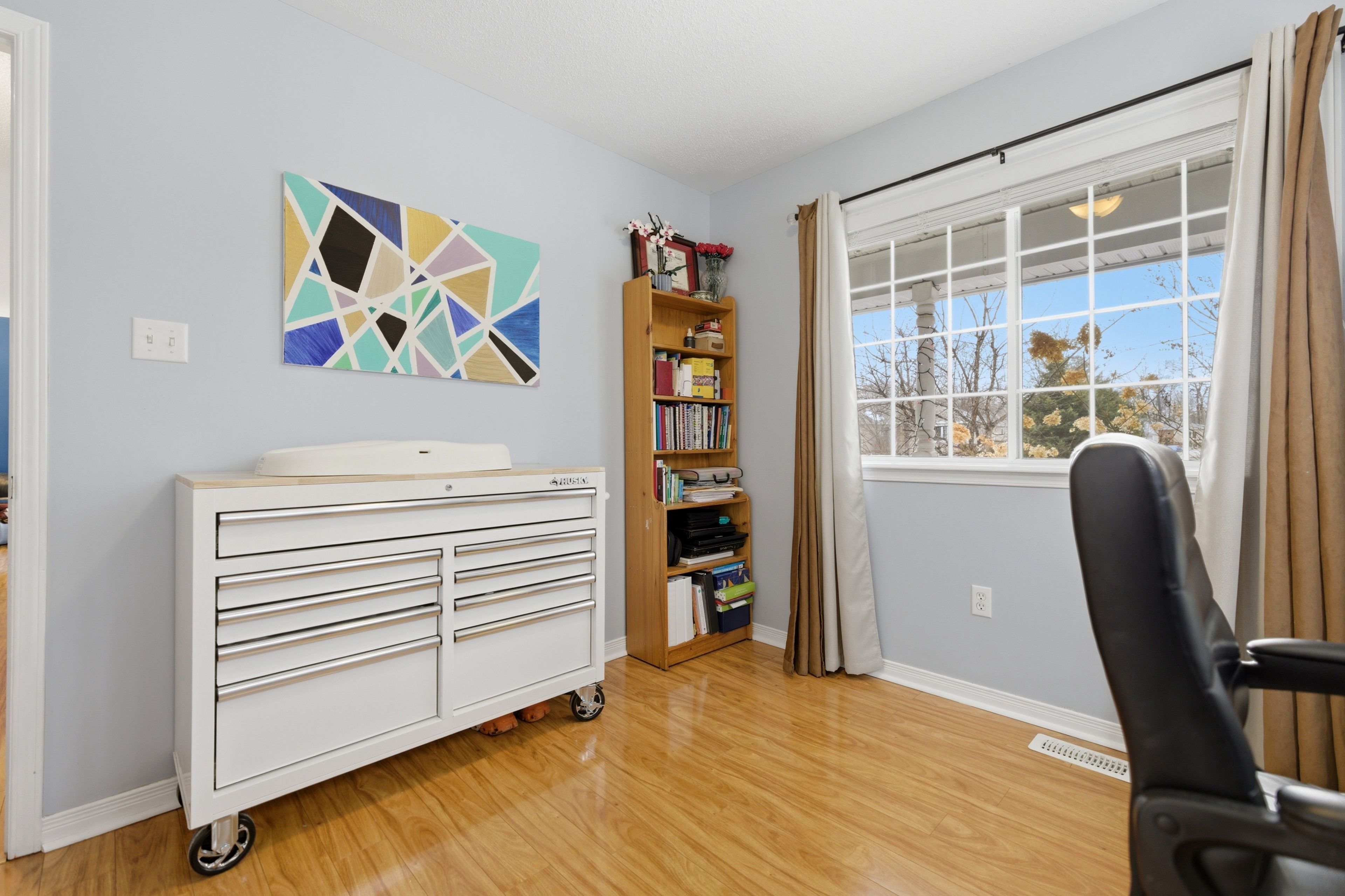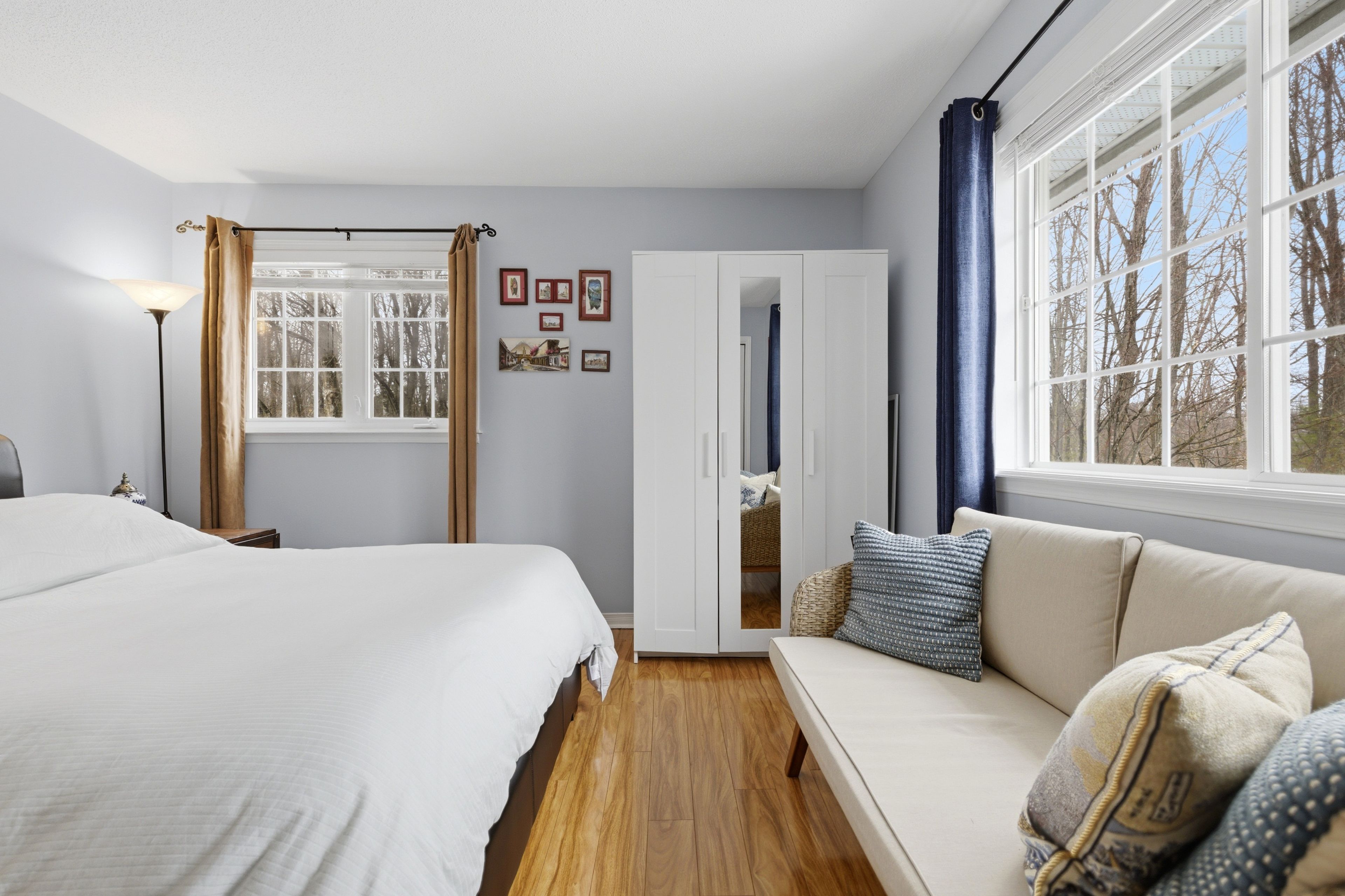• Bright and clean interior with natural light and warm flooring.