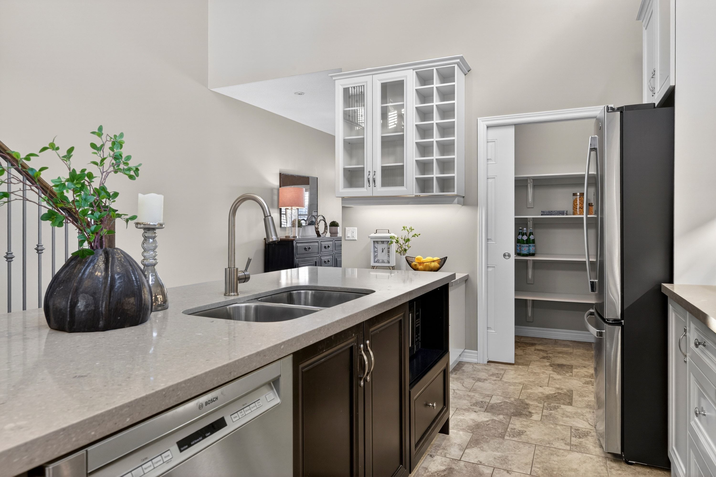 • Custom chef's kitchen with quartz countertops and walk-in pantry.