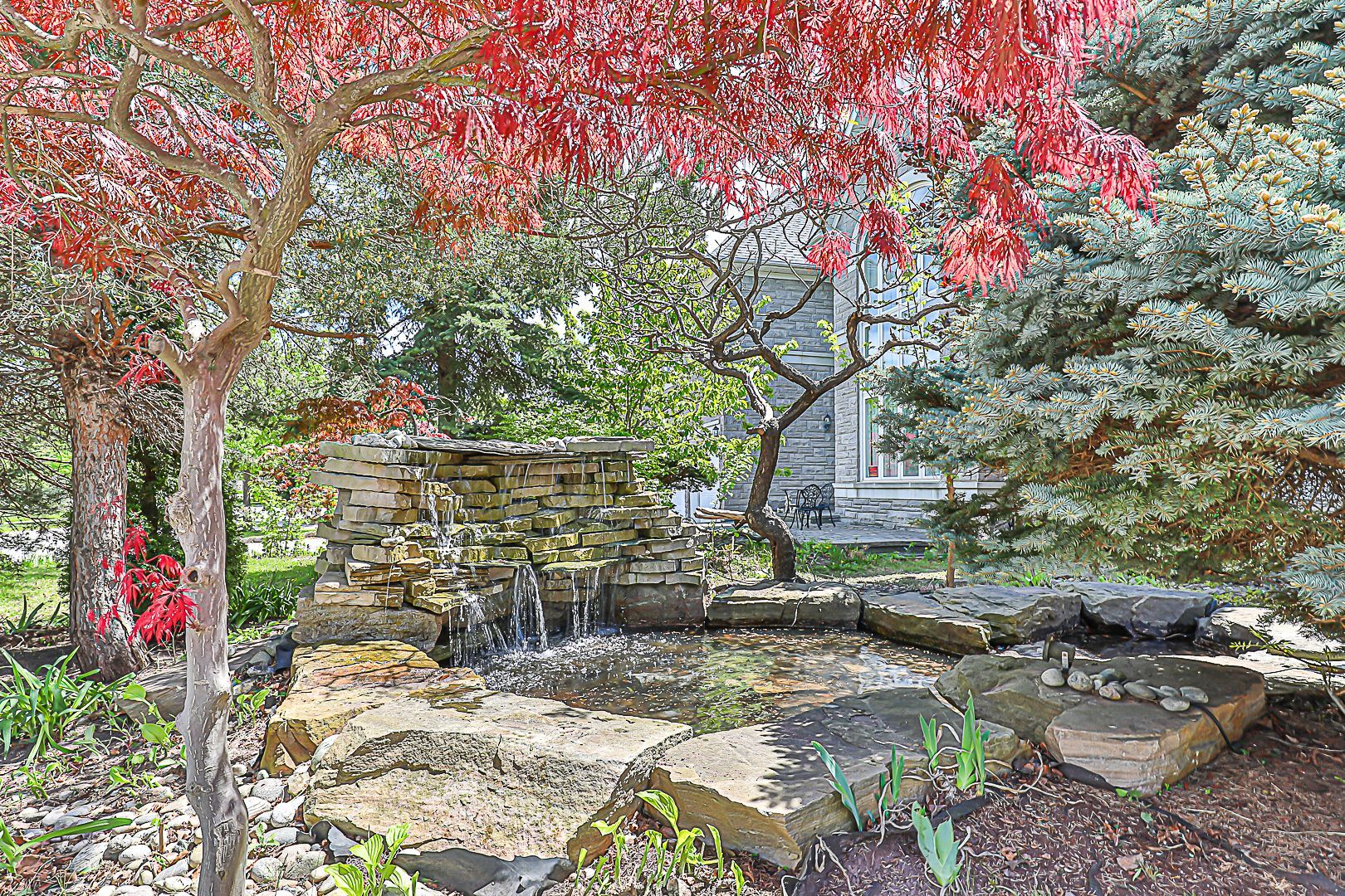 Truly magnificent mansion w/superior quality all imaginable upgrd top to bottom. Luxurious 3 garage home in prestigious bayview hill, backing onto premium ravine & the beaver creek, w/walkout bsmt. Stone front, 9' ceiling on main flr, two-storey high foyer w/skylight,18' ceiling on living room, cornice moulding & hrdwd floor throughout, breakfast area. Interlocking brick driveway, nice landscaping. Flagstone-edged pond w/fountain &waterfall. Fin w/o bsmt w/bar, gym, sauna room&2bdrms. Top ranking school bayview ss with ib program and bayview hill elementary school. Easy access to shopping, community center, parks, go transit and highway.