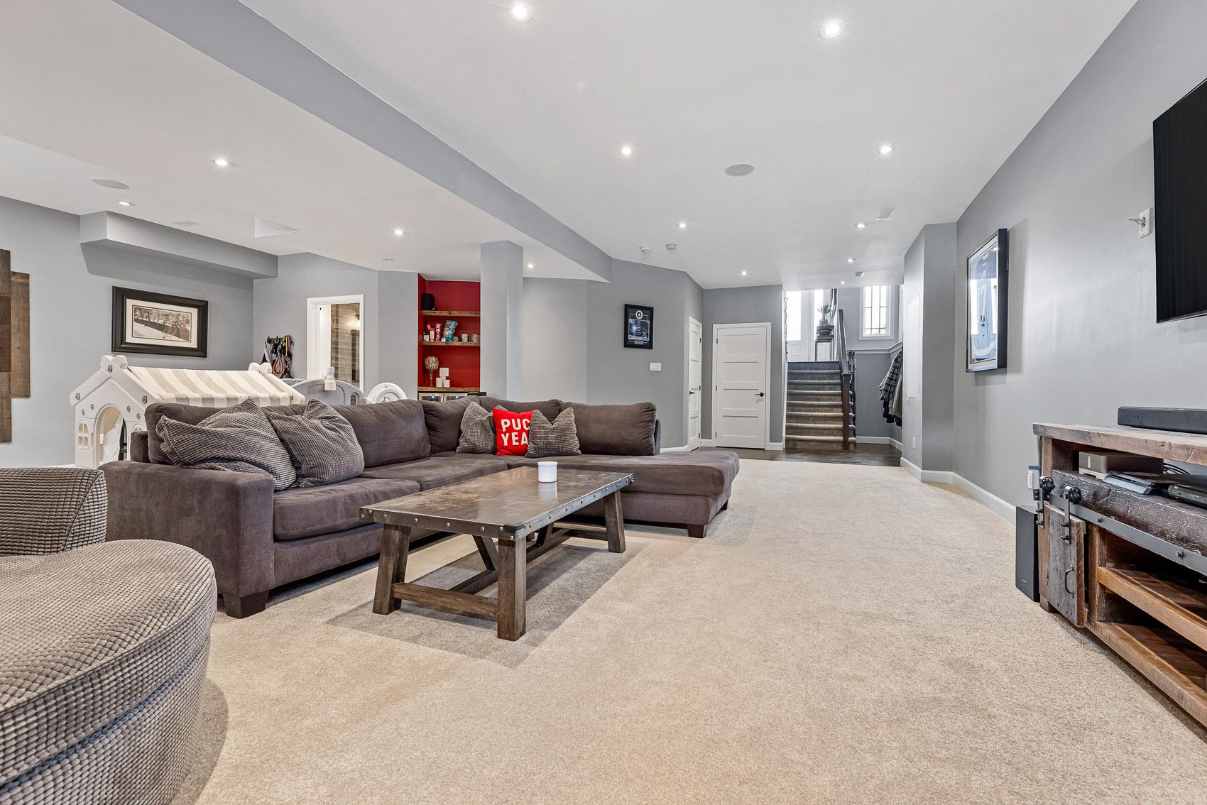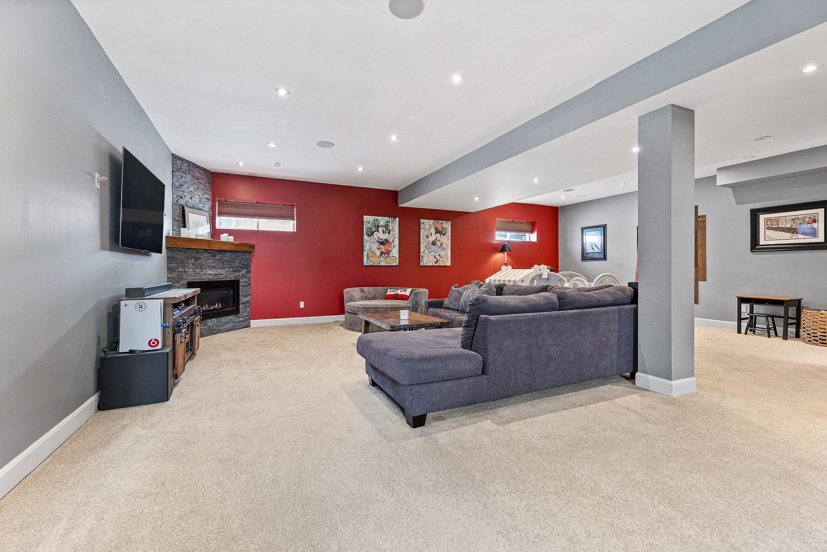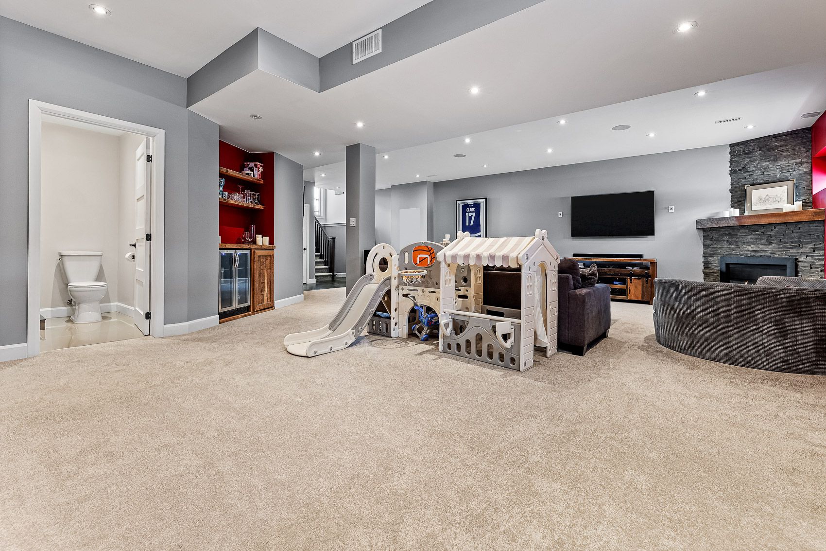 • Finished basement includes a gas fireplace and space for play or additional bedroom.