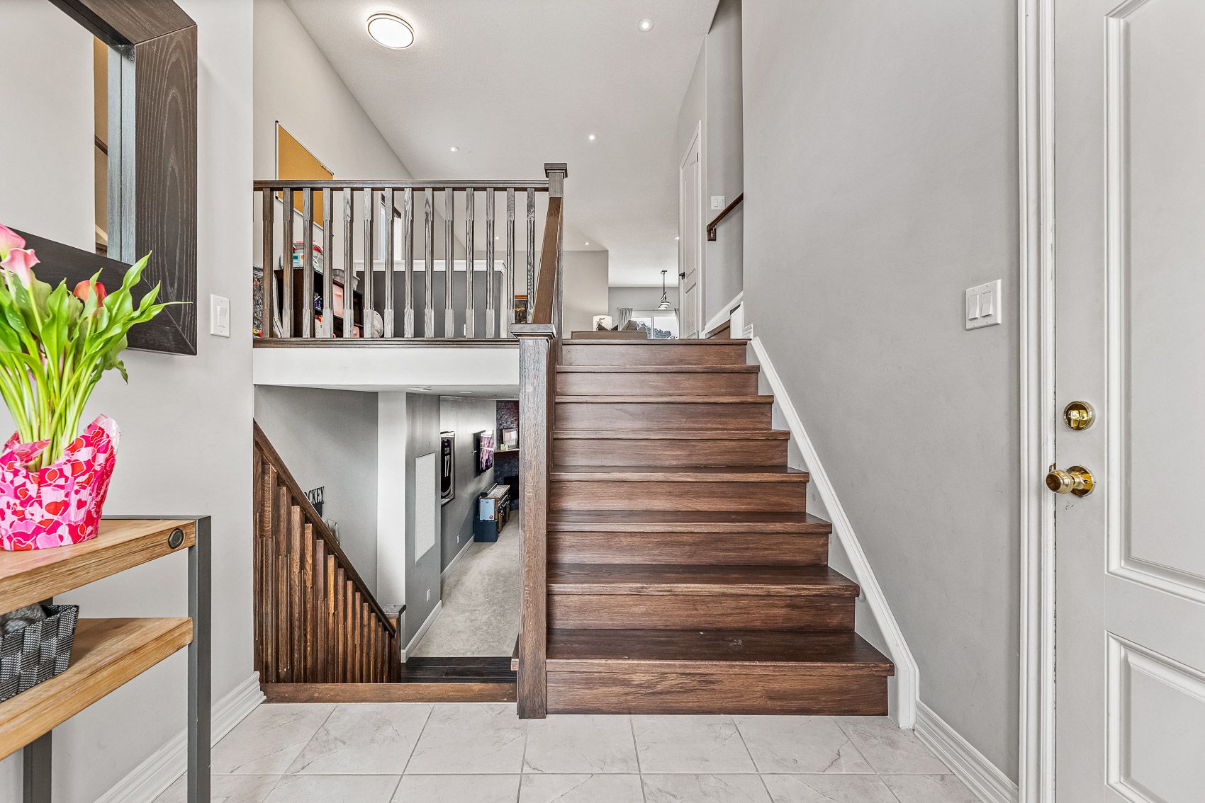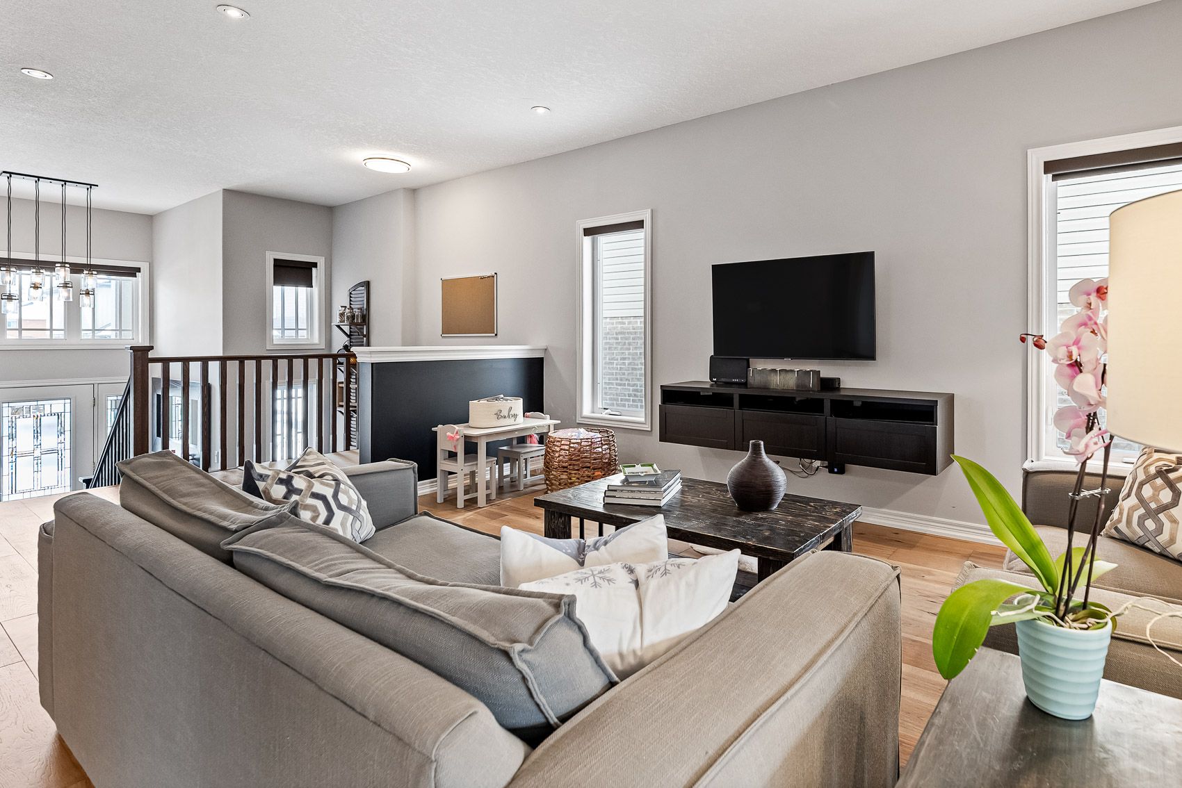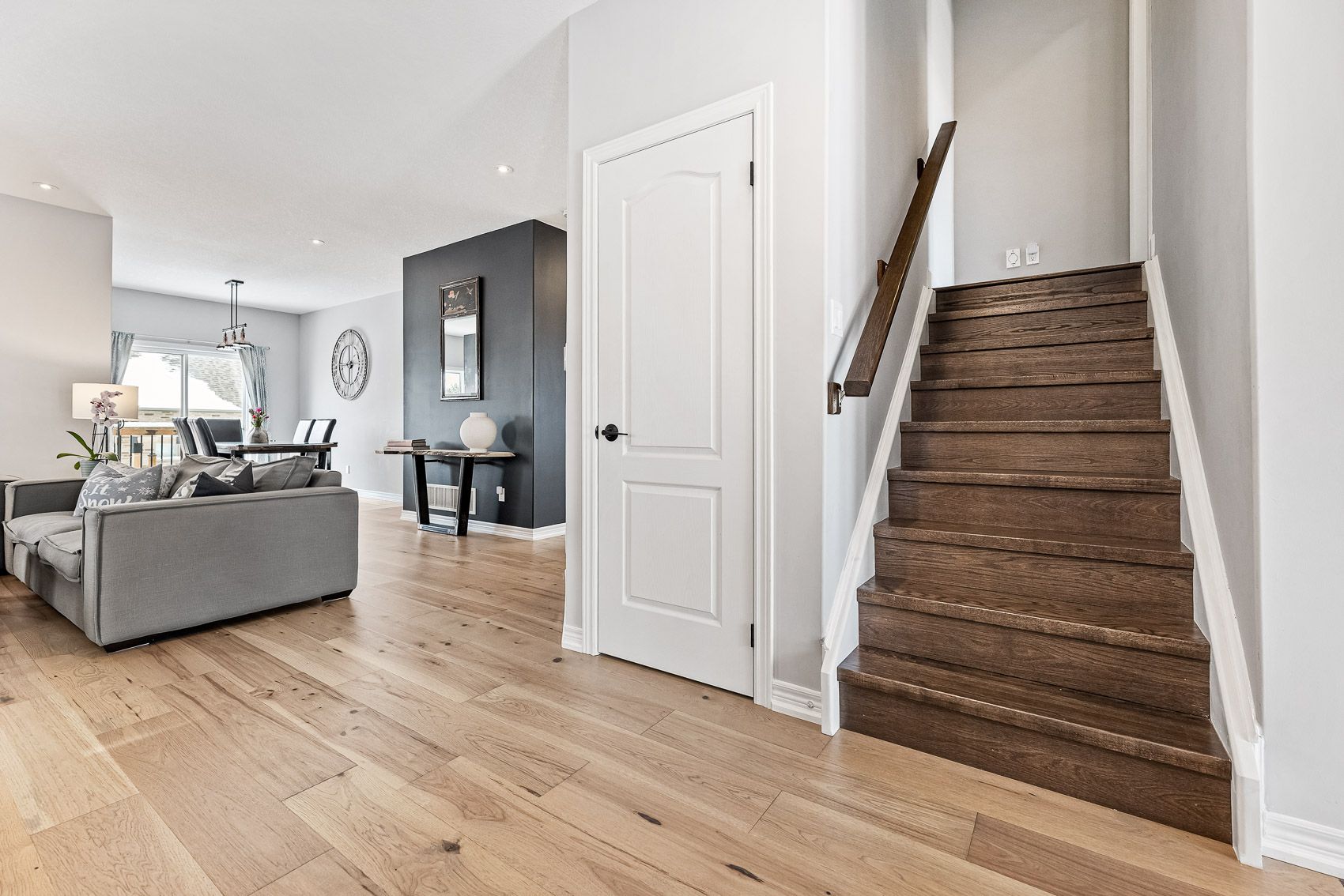 • Open-concept main floor features hardwood, stone countertops, and stainless steel appliances.