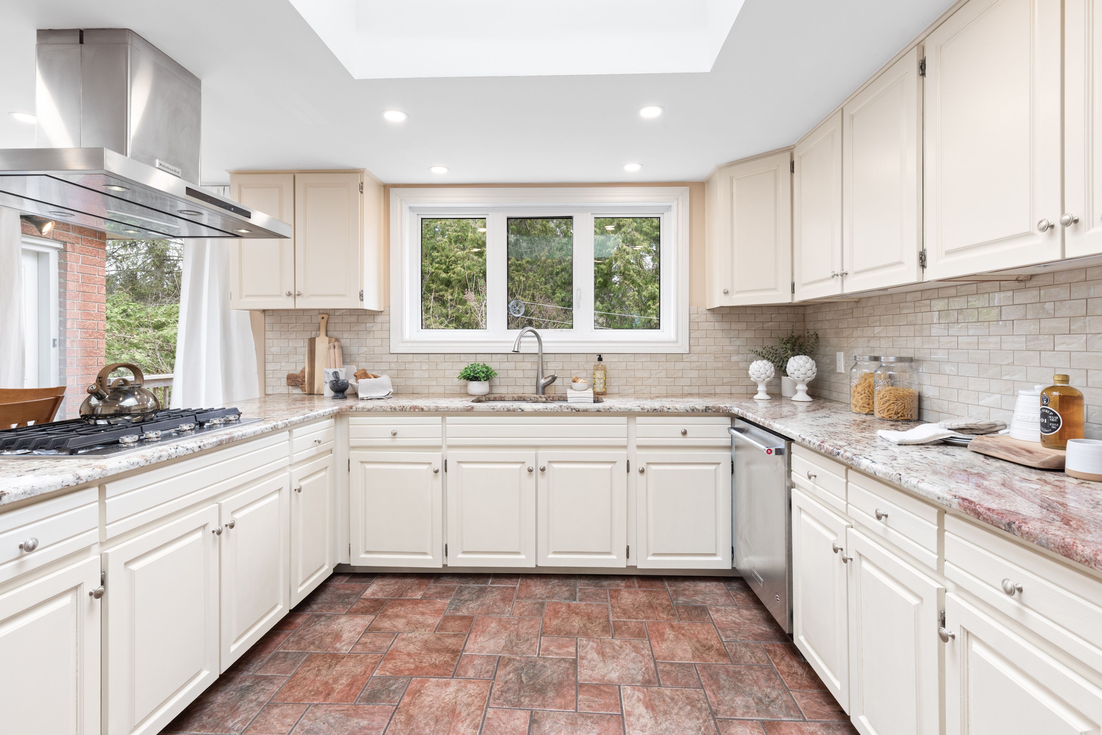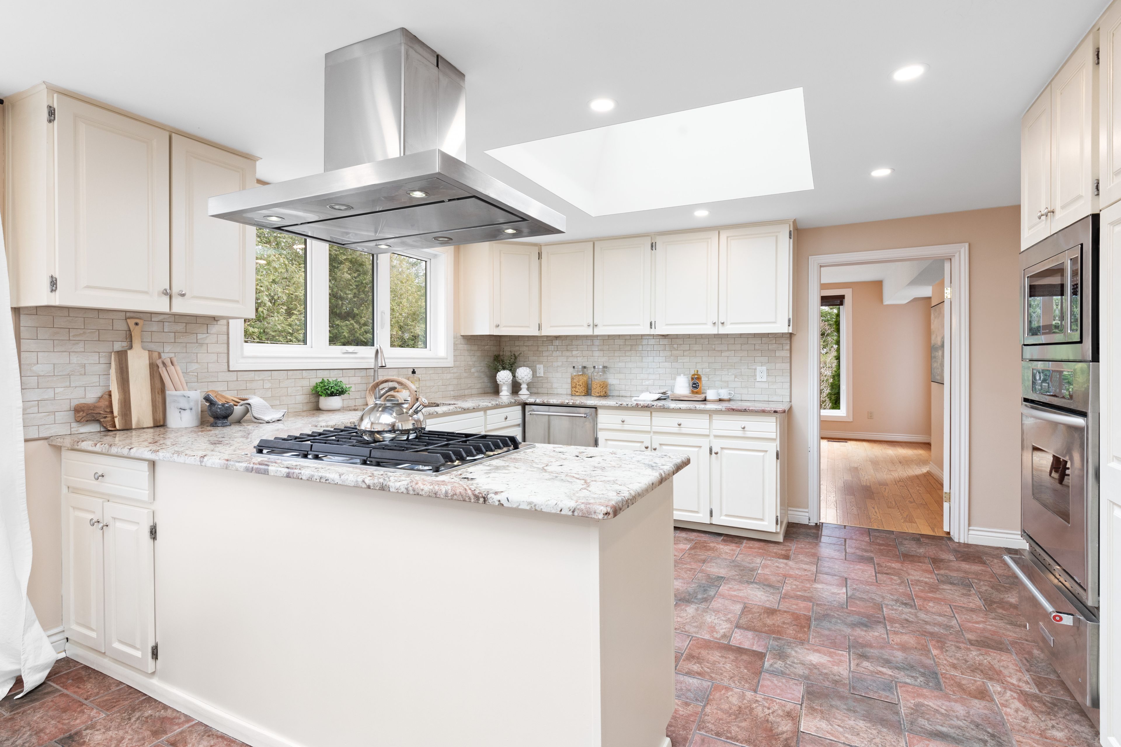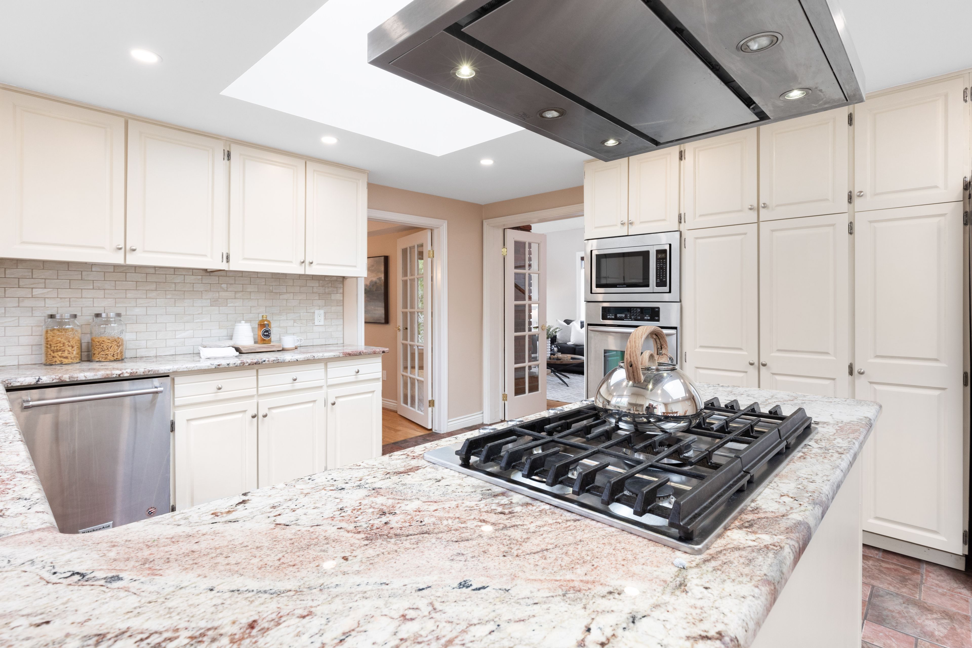 • Updated gourmet kitchen featuring granite counters and gas range.