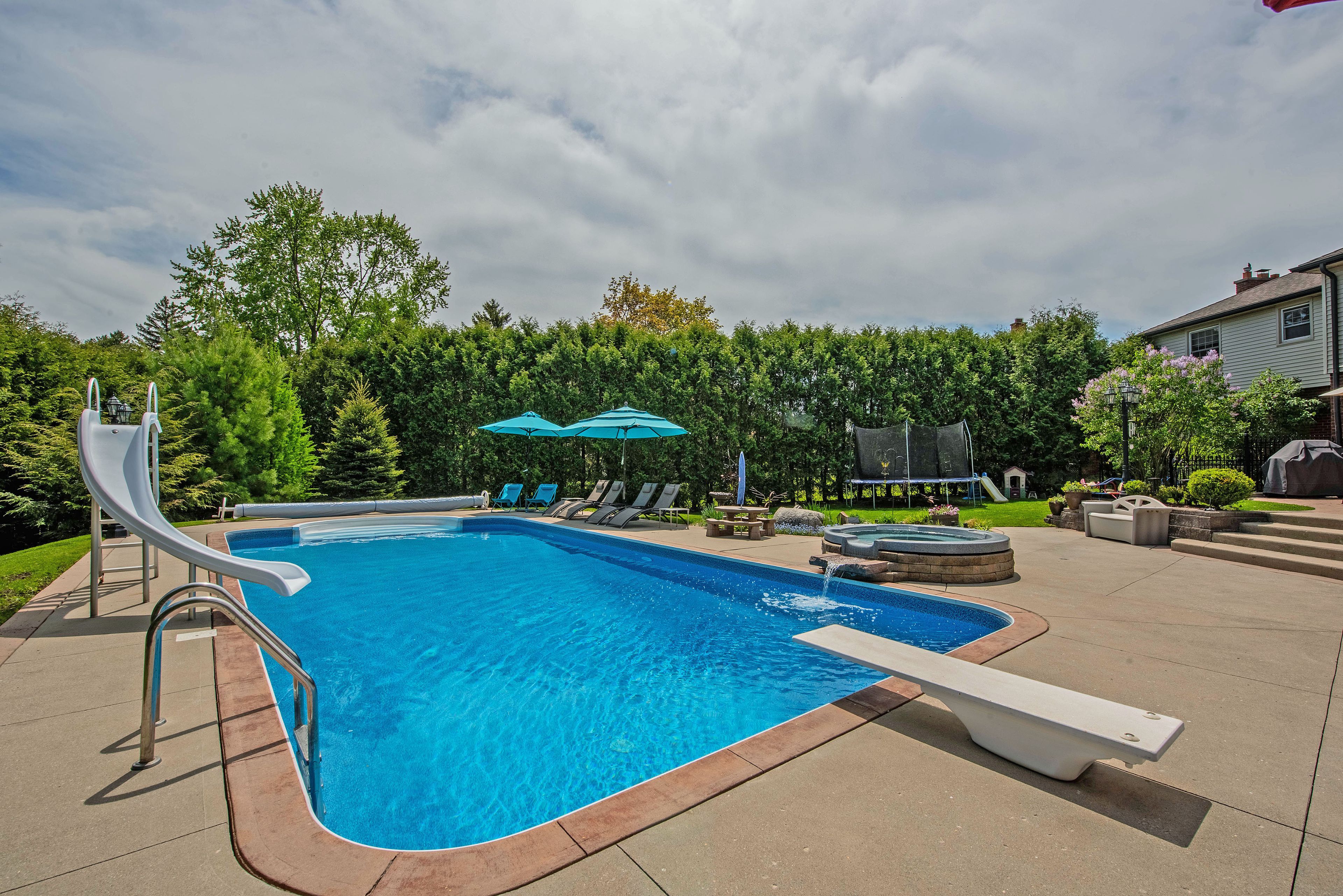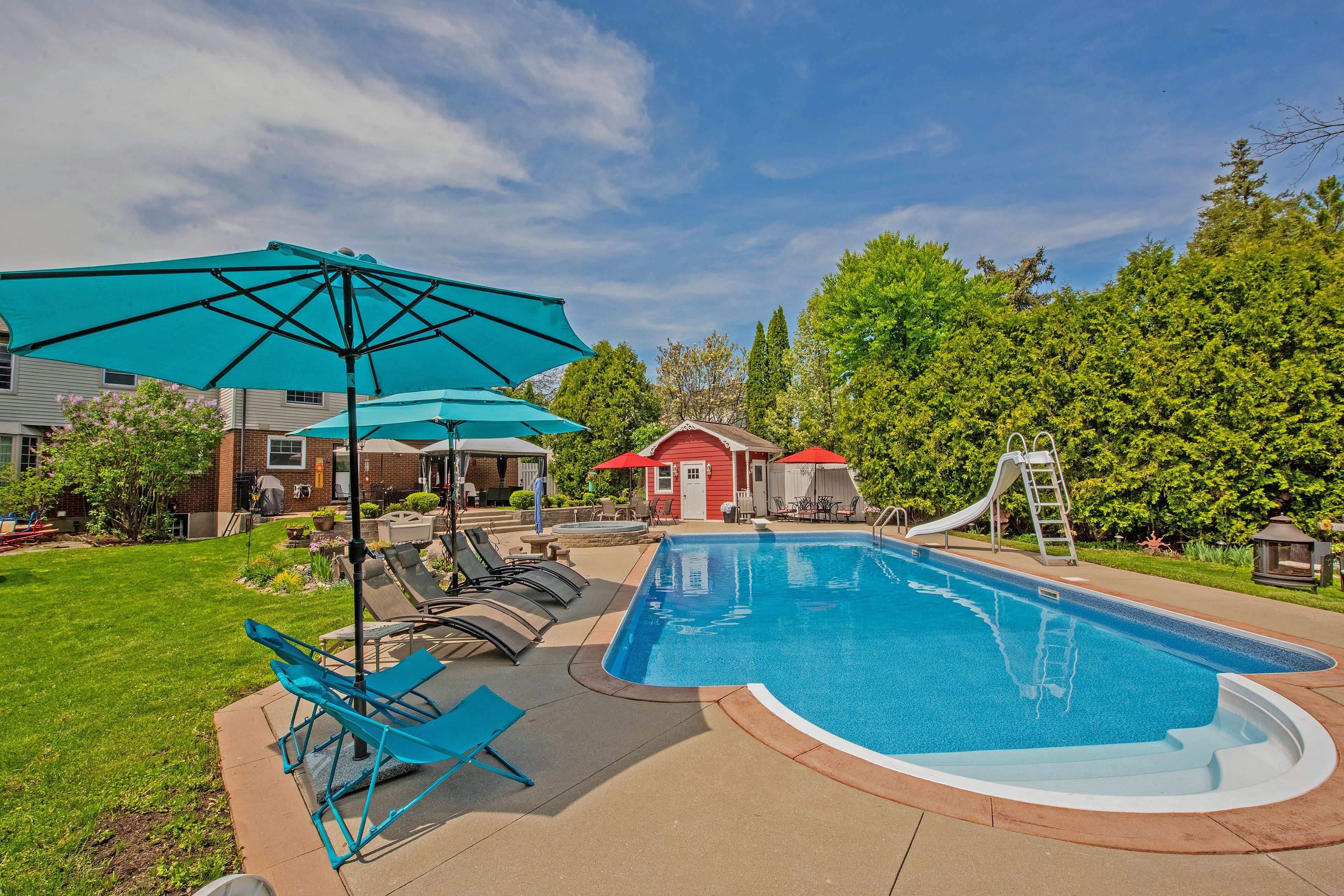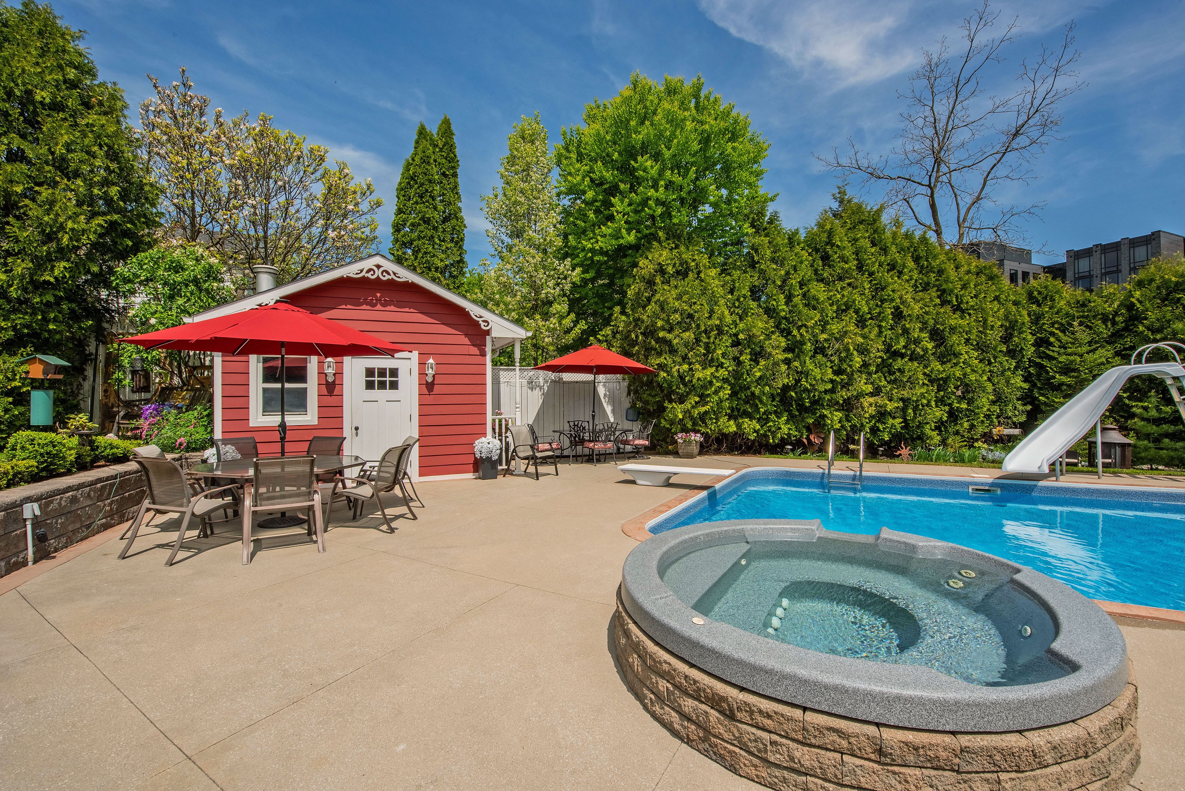 • Backyard oasis with in-ground pool, hot tub, and pond.