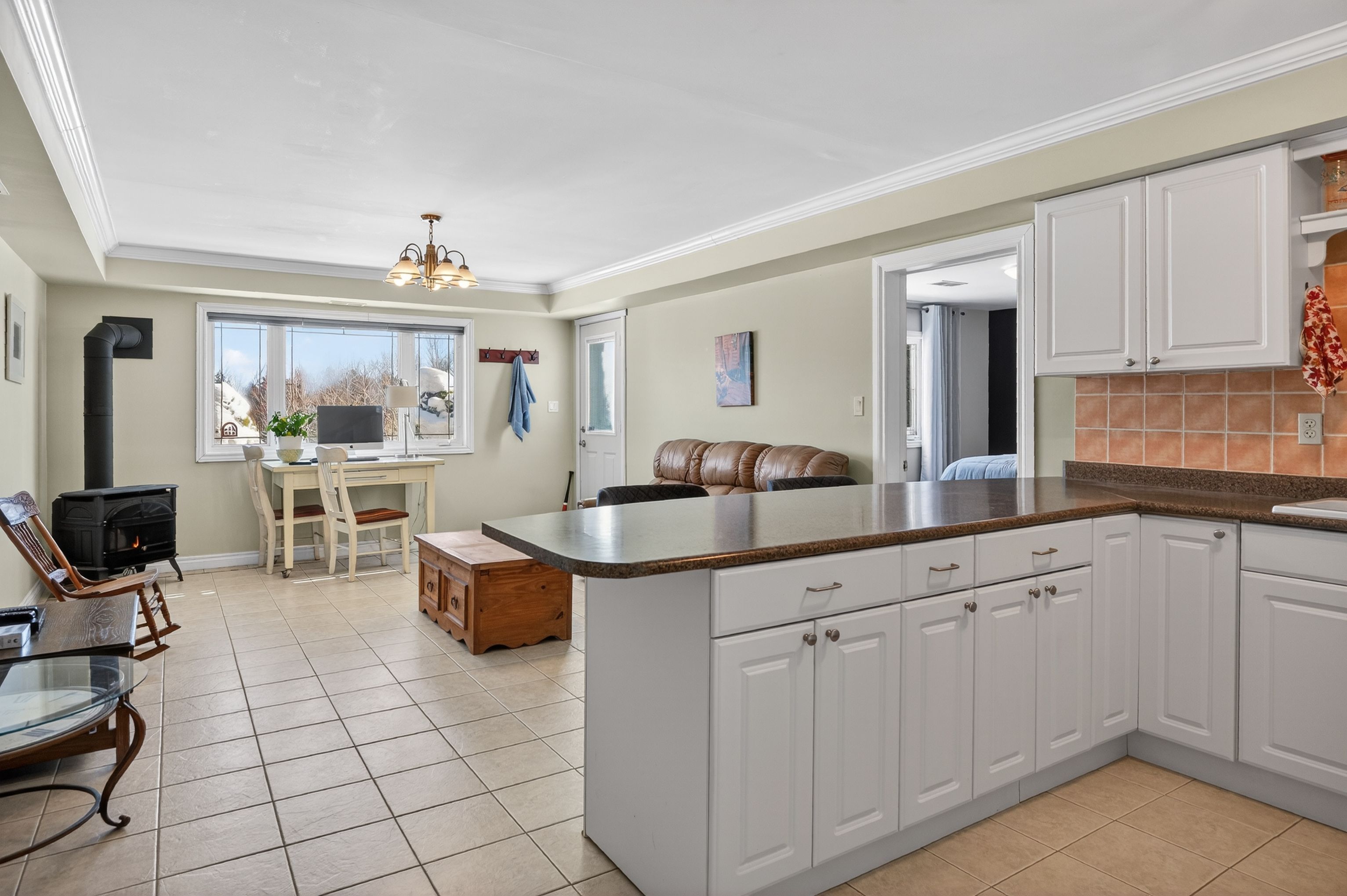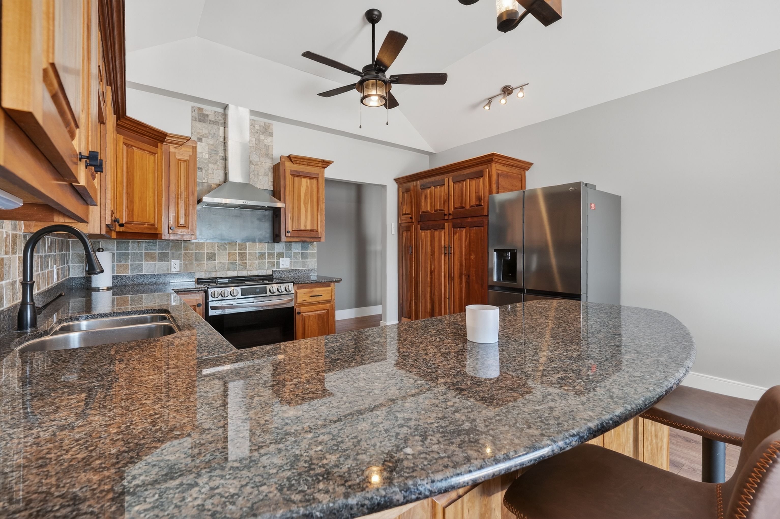 • Open-concept living area with granite countertops and stainless-steel appliances.
