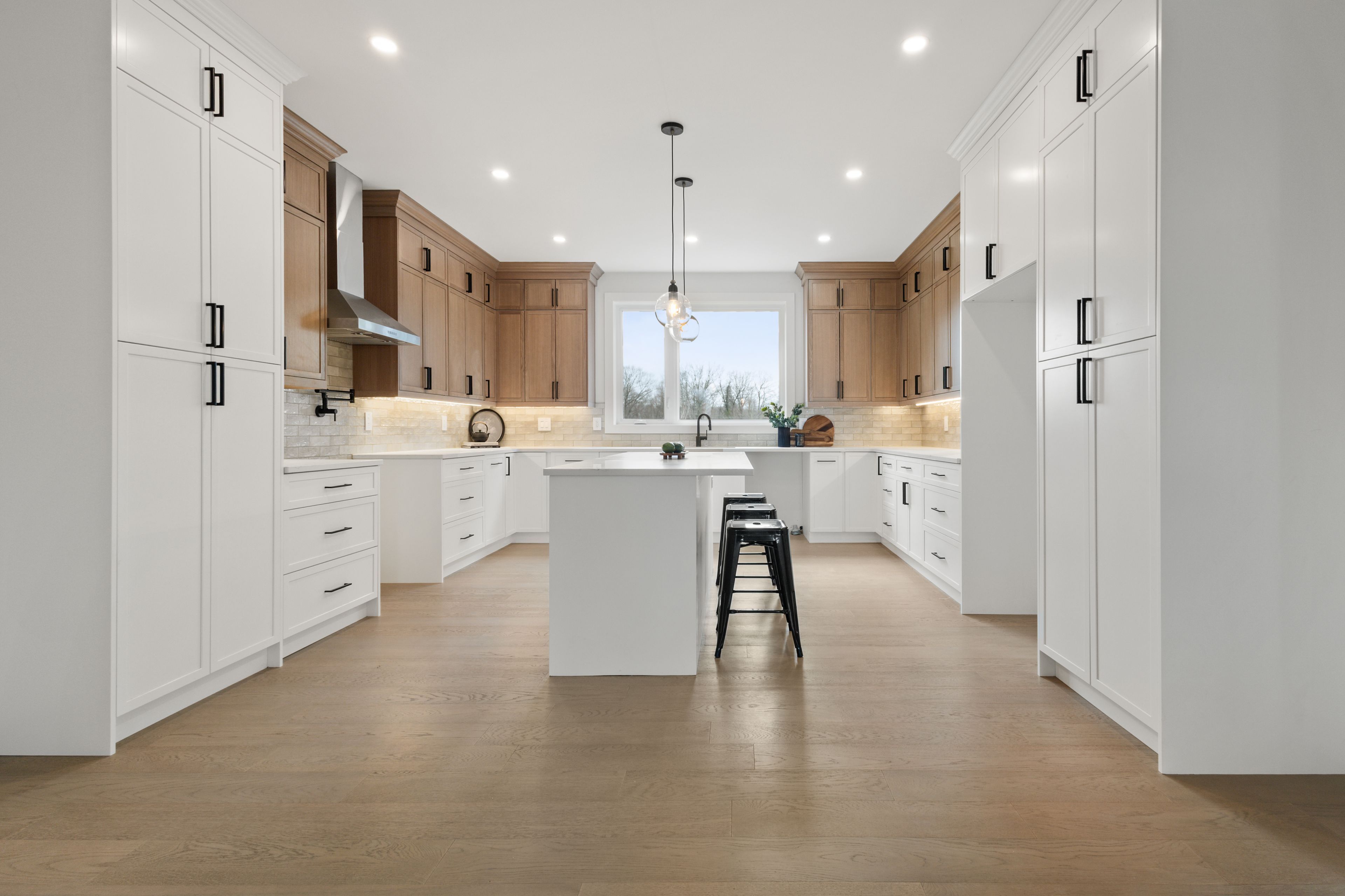 • Custom kitchen with wraparound cabinetry and a large island for cooking.
