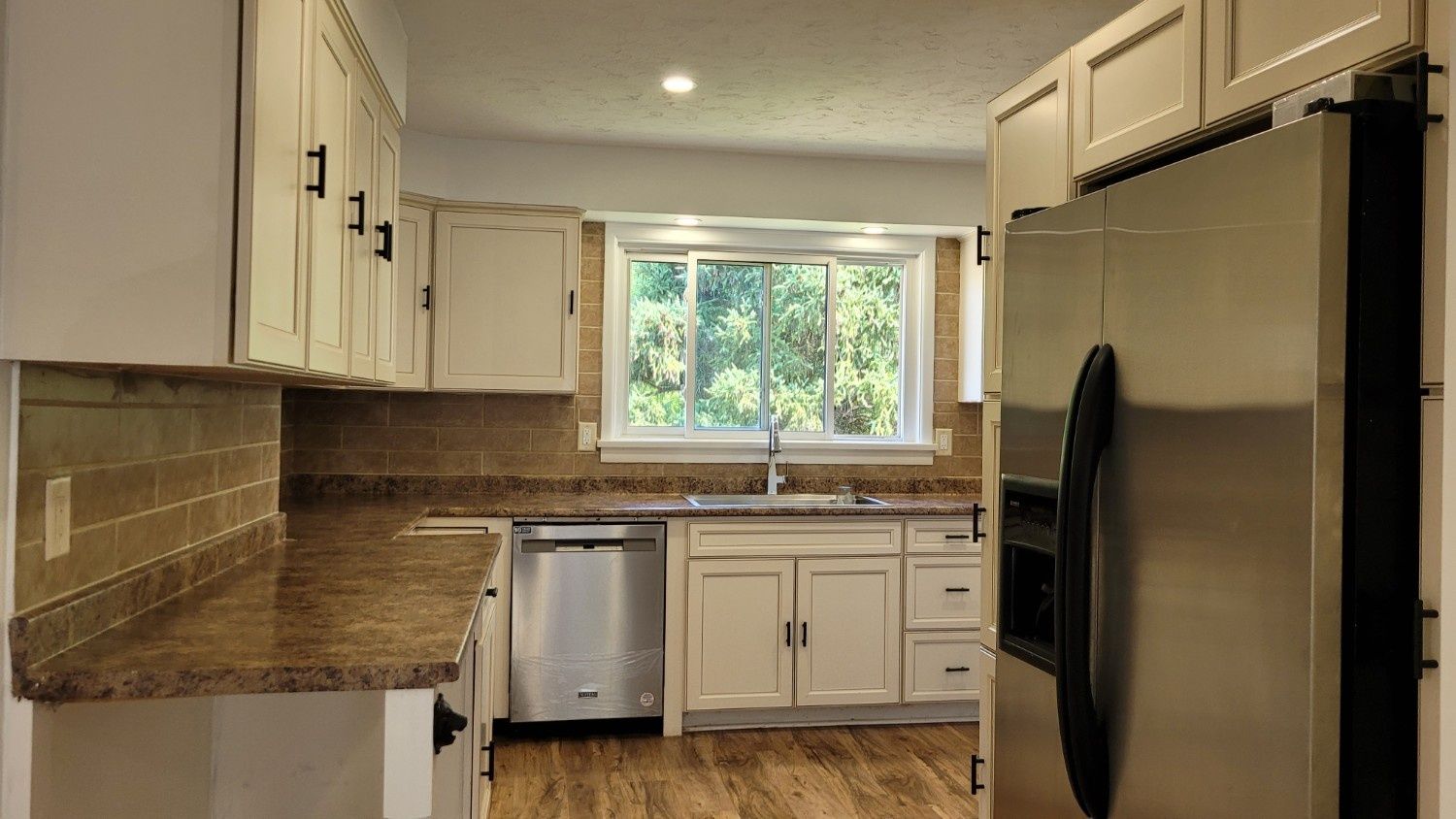 • Modern kitchen with brand-new appliances, including a dishwasher and refrigerator.