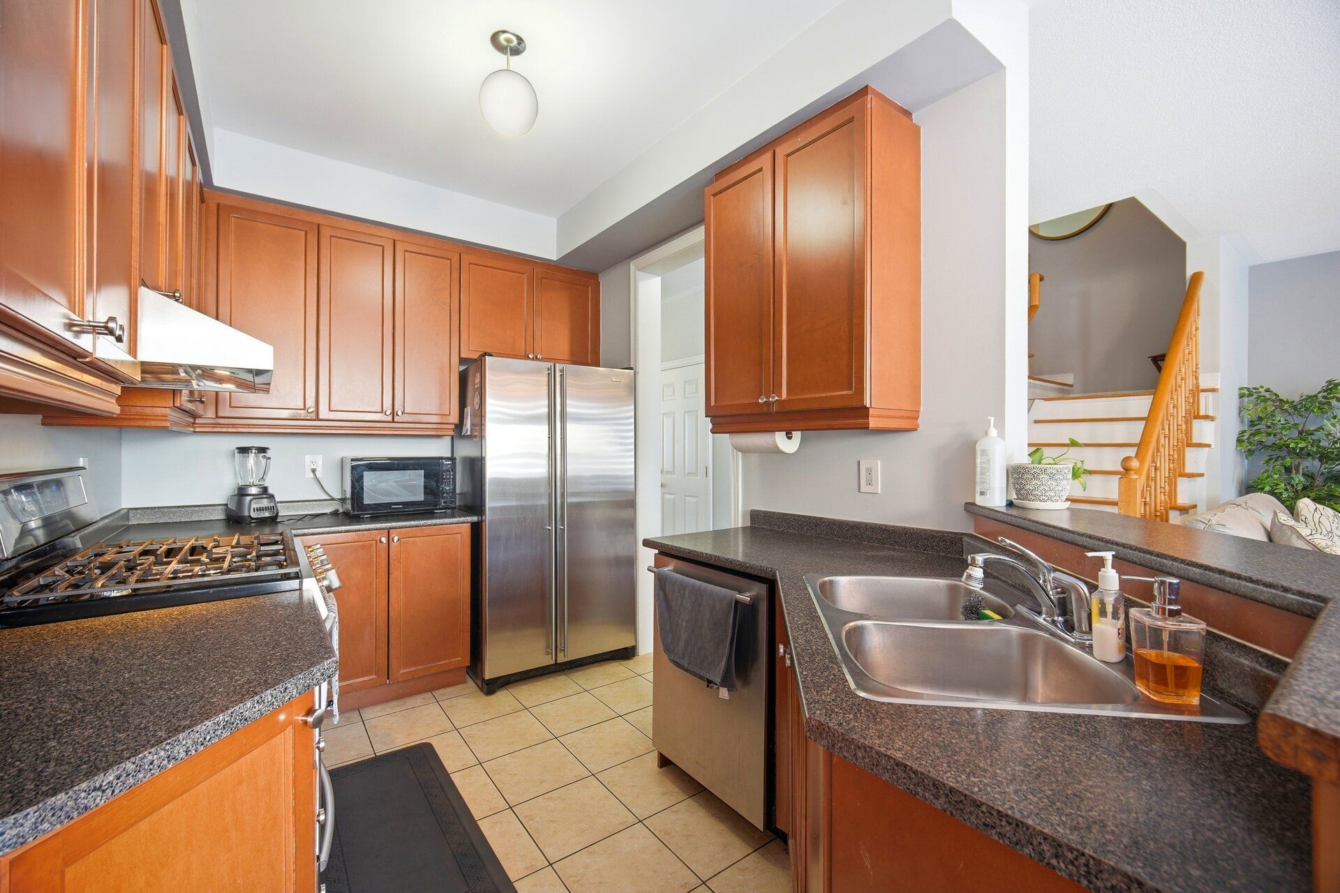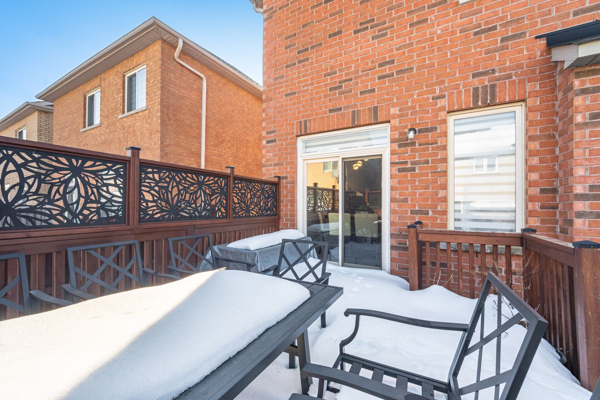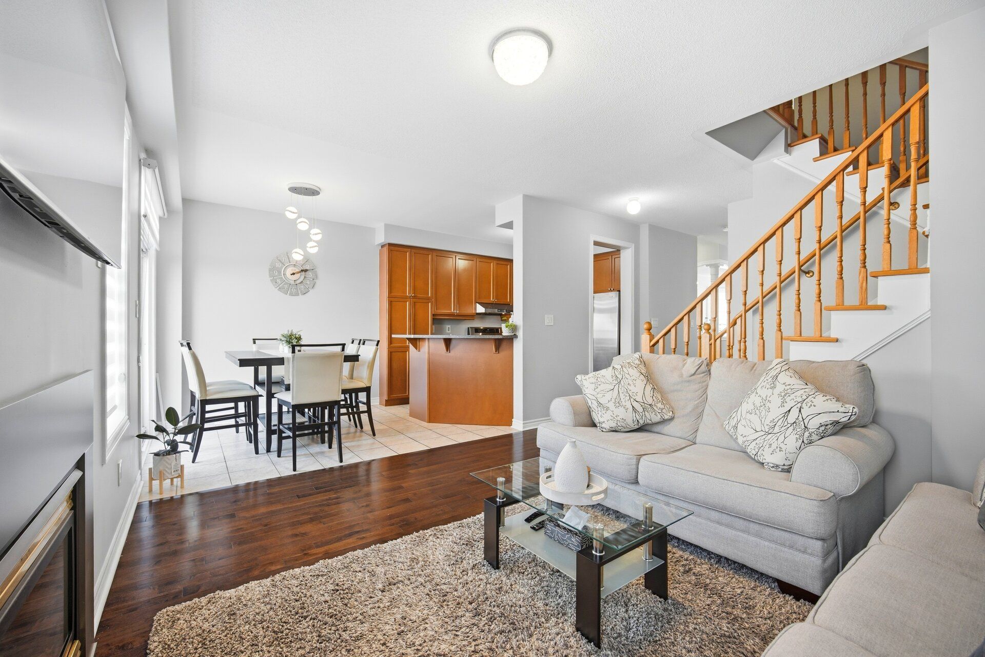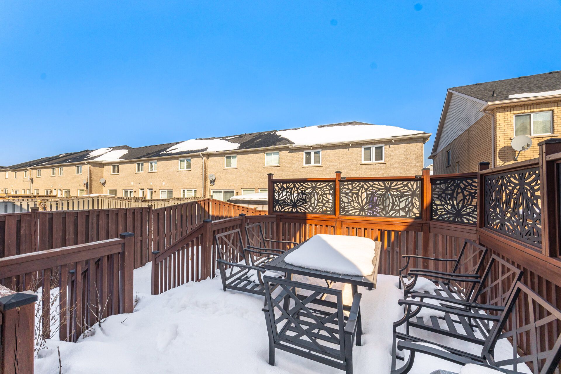 Welcome to this stunning, bright, open-concept end-unit freehold townhouse offering 1,888 sq ft. (mpac). Featuring 3 spacious bedrooms and 3 washrooms, this beautiful home showcases hardwood floors on the main level, a huge front window that fills the space with natural light, and impressive 9-ft ceilings. The open layout is complemented by elegant oak stairs and an upgraded, family-size kitchen with stainless steel appliances. A generous breakfast area walks out to a beautiful patio, while the custom-made, creatively designed deck adds a unique outdoor feature - perfect for family gatherings and entertaining. The finished basement provides additional living space for recreation or a home office. The primary bedroom features a private ensuite and two large his & hers walk-in closets. All rooms are spacious, and thoughtfully designed for comfortable family living. Located close to top-rated schools, parks, public transit, plazas, and countless amenities. One of the best opportunities on the market - a true showstopper not to be missed! This townhouse is an independent structure, with only the garage attached