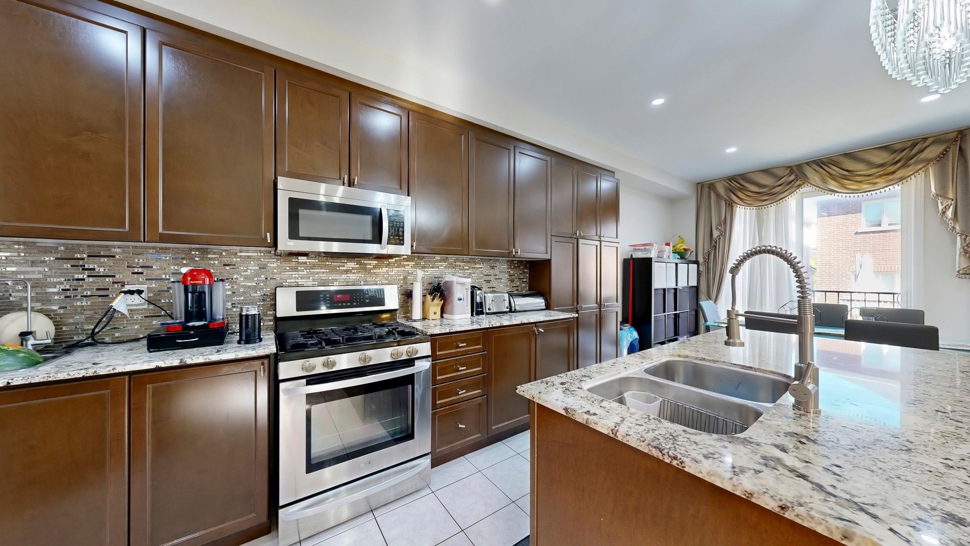 • Modern kitchen features a large center island for family gatherings.