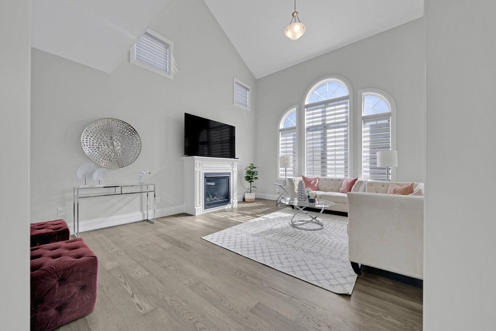 • Living area perfect for entertaining with a gas fireplace and modern light fixtures.