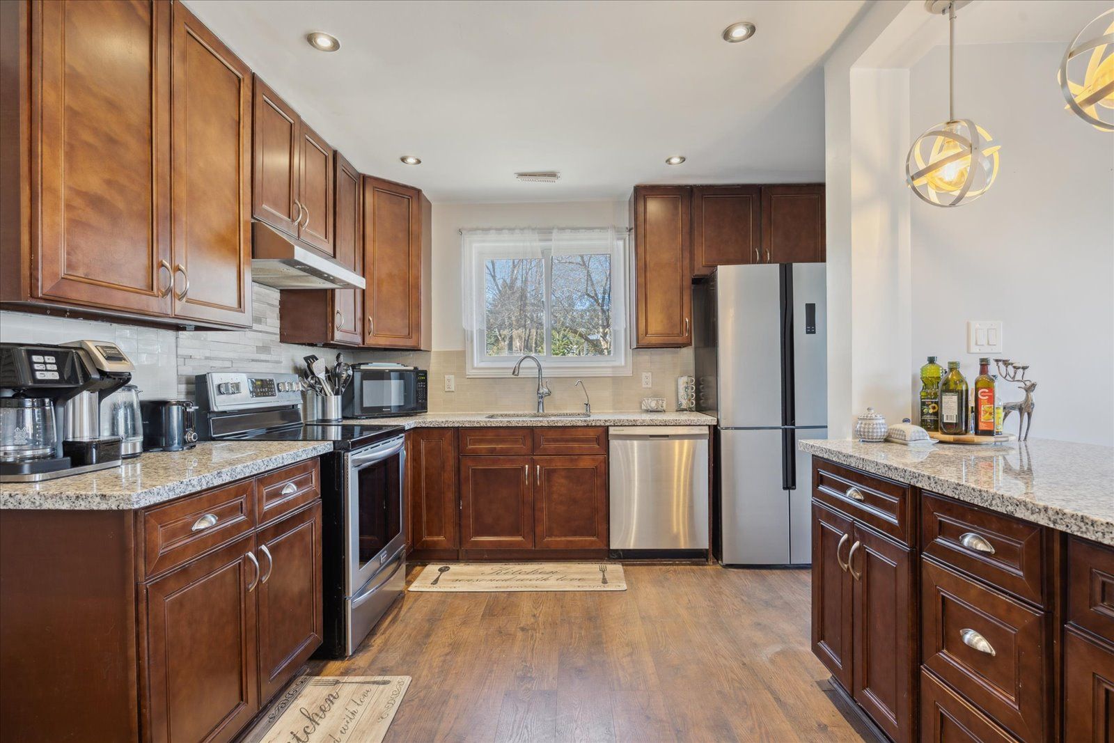 Welcome to this beautiful 3-level backsplit with modern updates throughout, main level featuring laminate flooring and an open-concept kitchen. Dining room, and a living room with a wood stove and a walkout to the back deck, finished basement with a spacious recreation room. Located just a short drive to alliston and a selection of local amenities!
