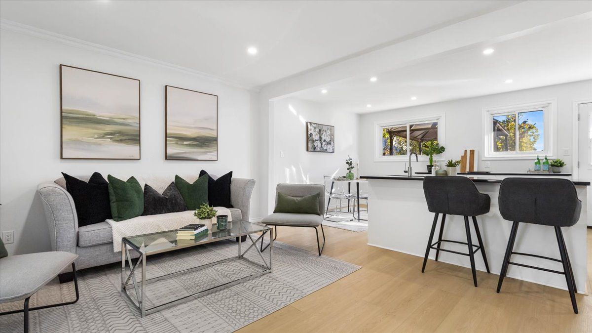 • Bright living room and custom kitchen with ample storage.