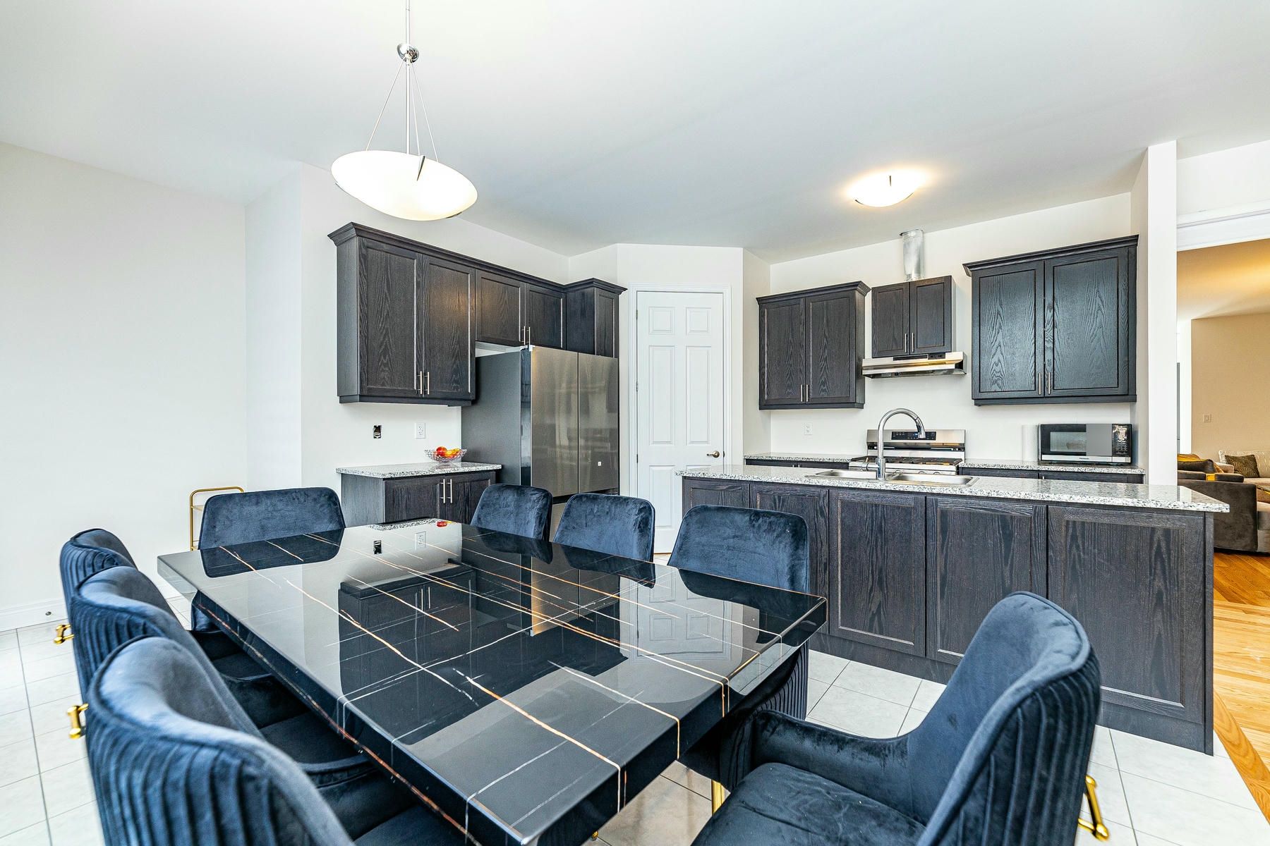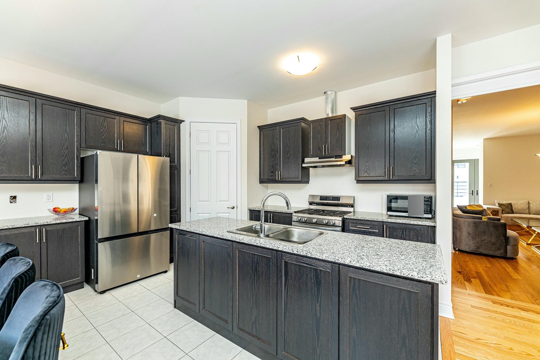 • Sleek kitchen with granite countertops and stainless steel appliances.