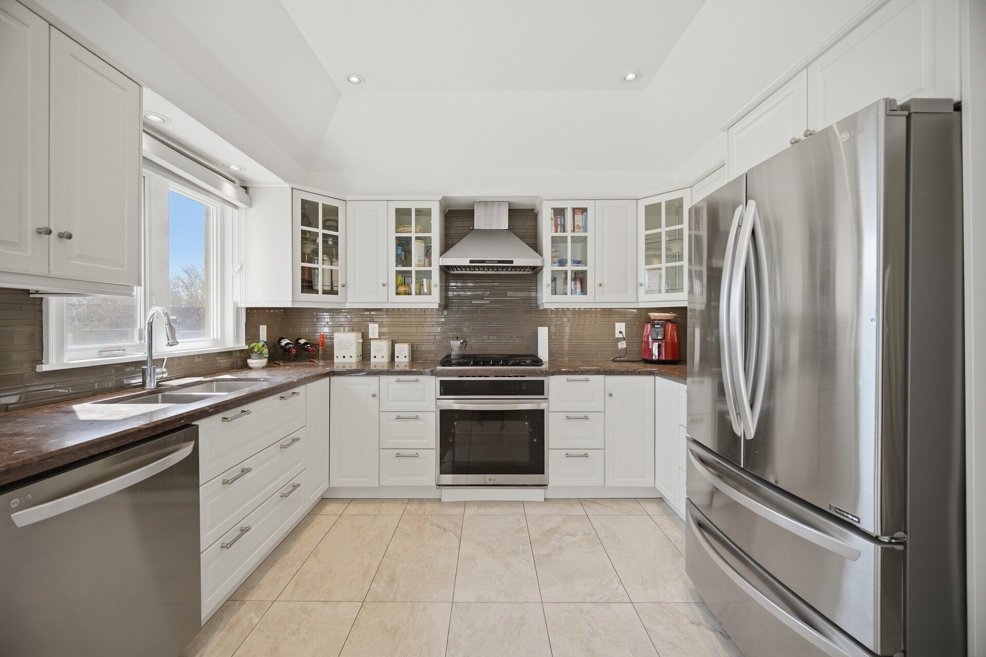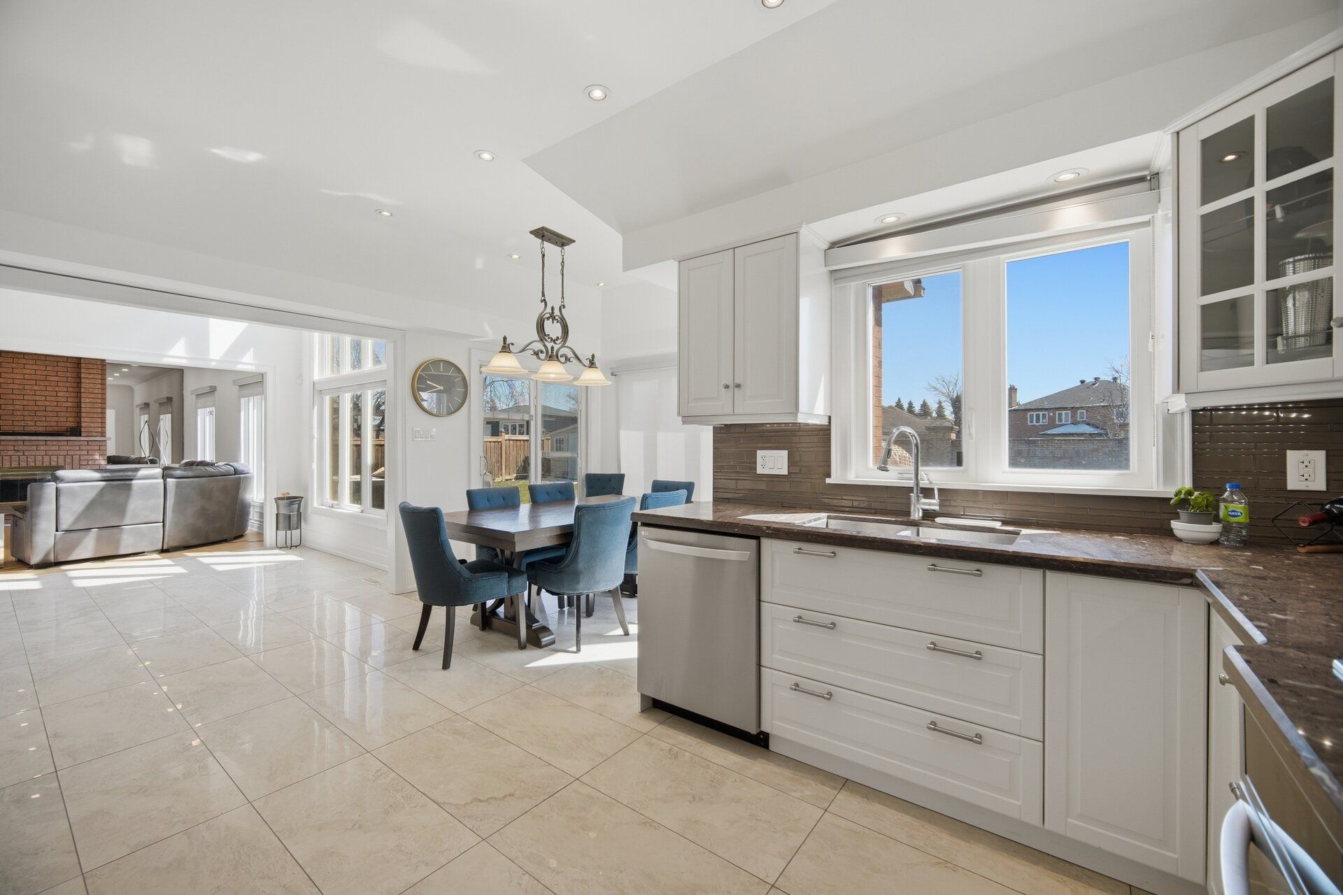 • Bright open-concept kitchen with stainless steel appliances and granite countertops.